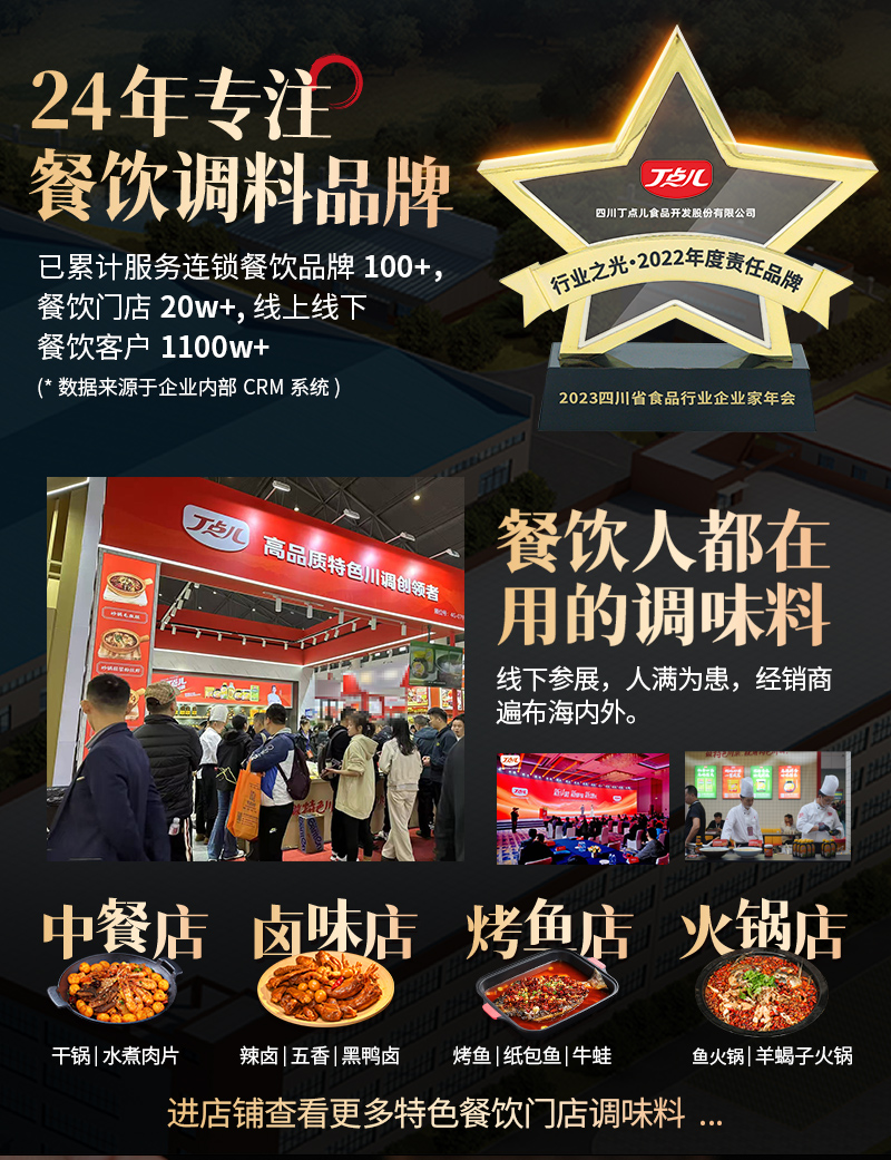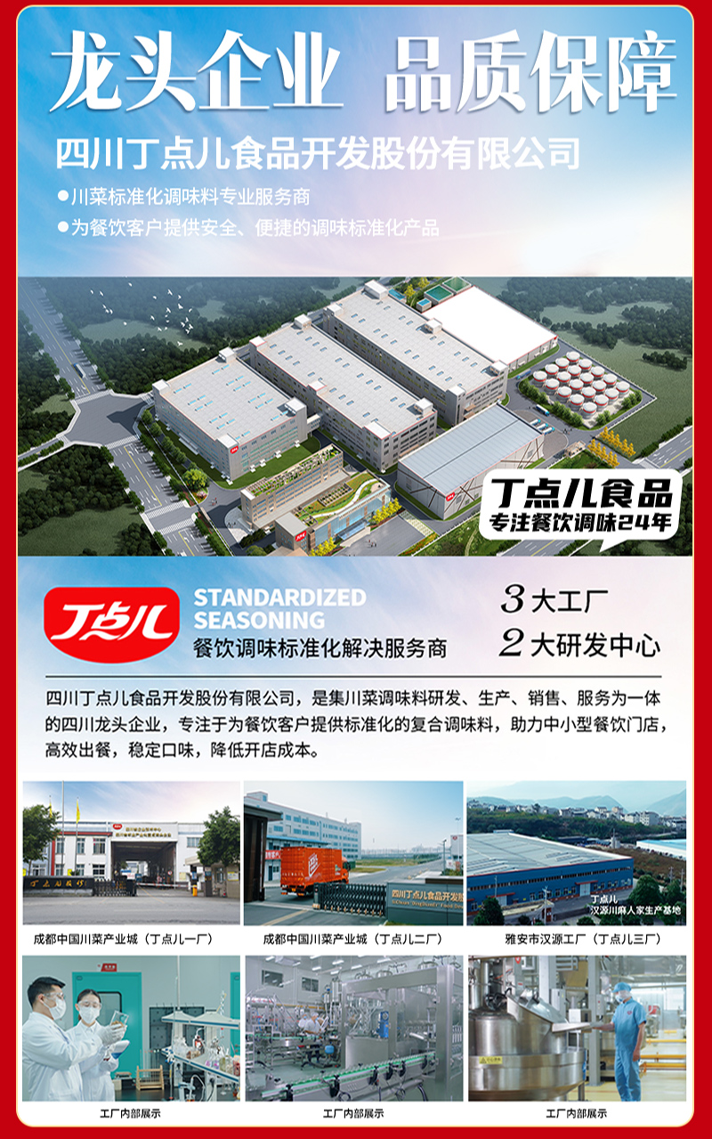 四川丁点儿食品开发股份有限公司,是集川菜调味料研发、生产、销售、服务为一体的现代化企业,专注为餐饮客户提供川菜调味解决方案。公司成立至今,服务了超百万家的餐饮门店以及连锁品牌。