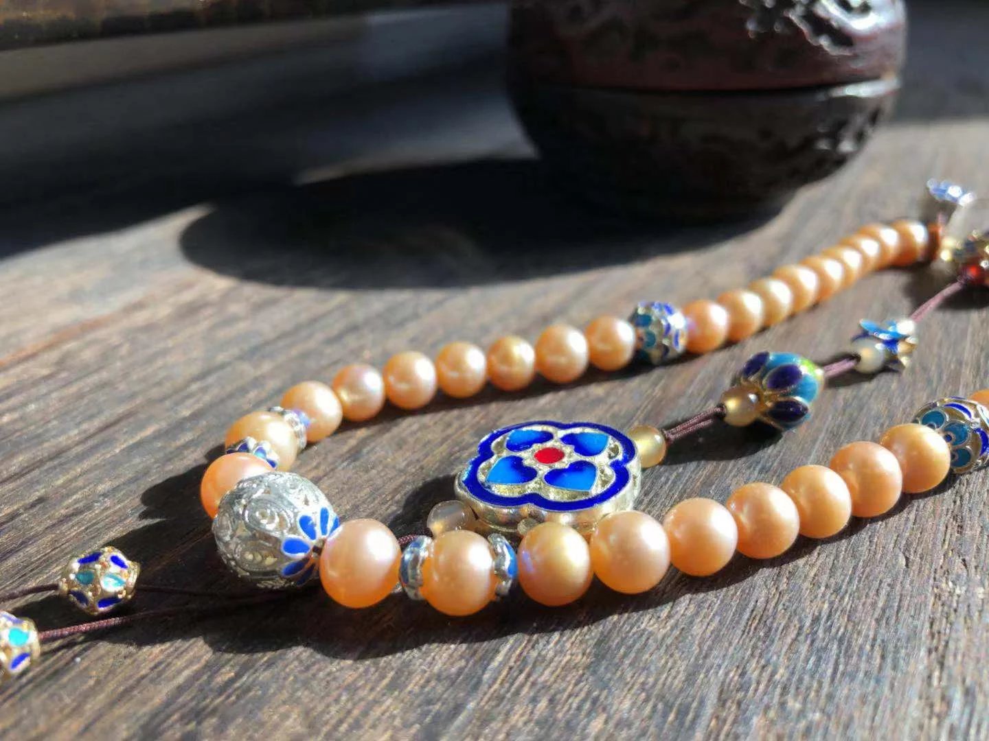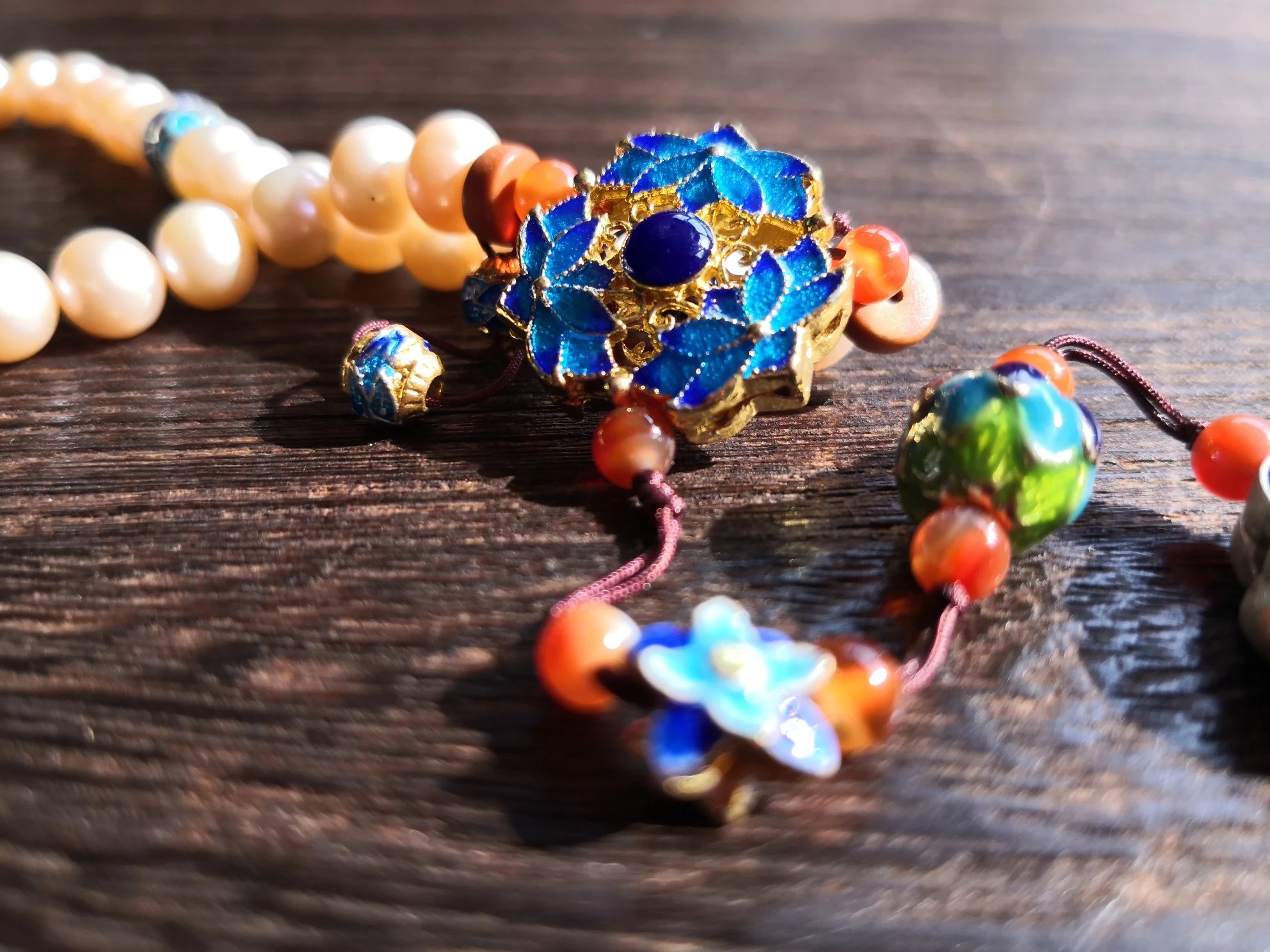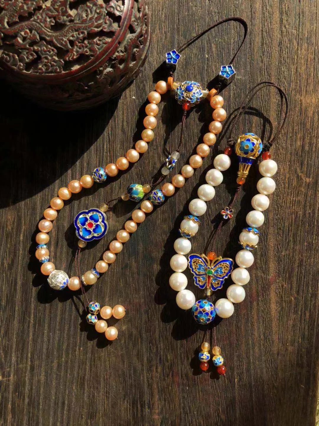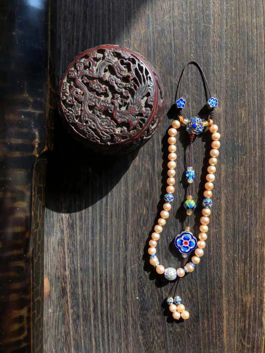 三十六颗粉色的天然淡水珍珠(相同大小白色款请下拉参考款式),铜胎的景泰蓝,比起大大的白珍珠,更显得低调,却难掩光华。