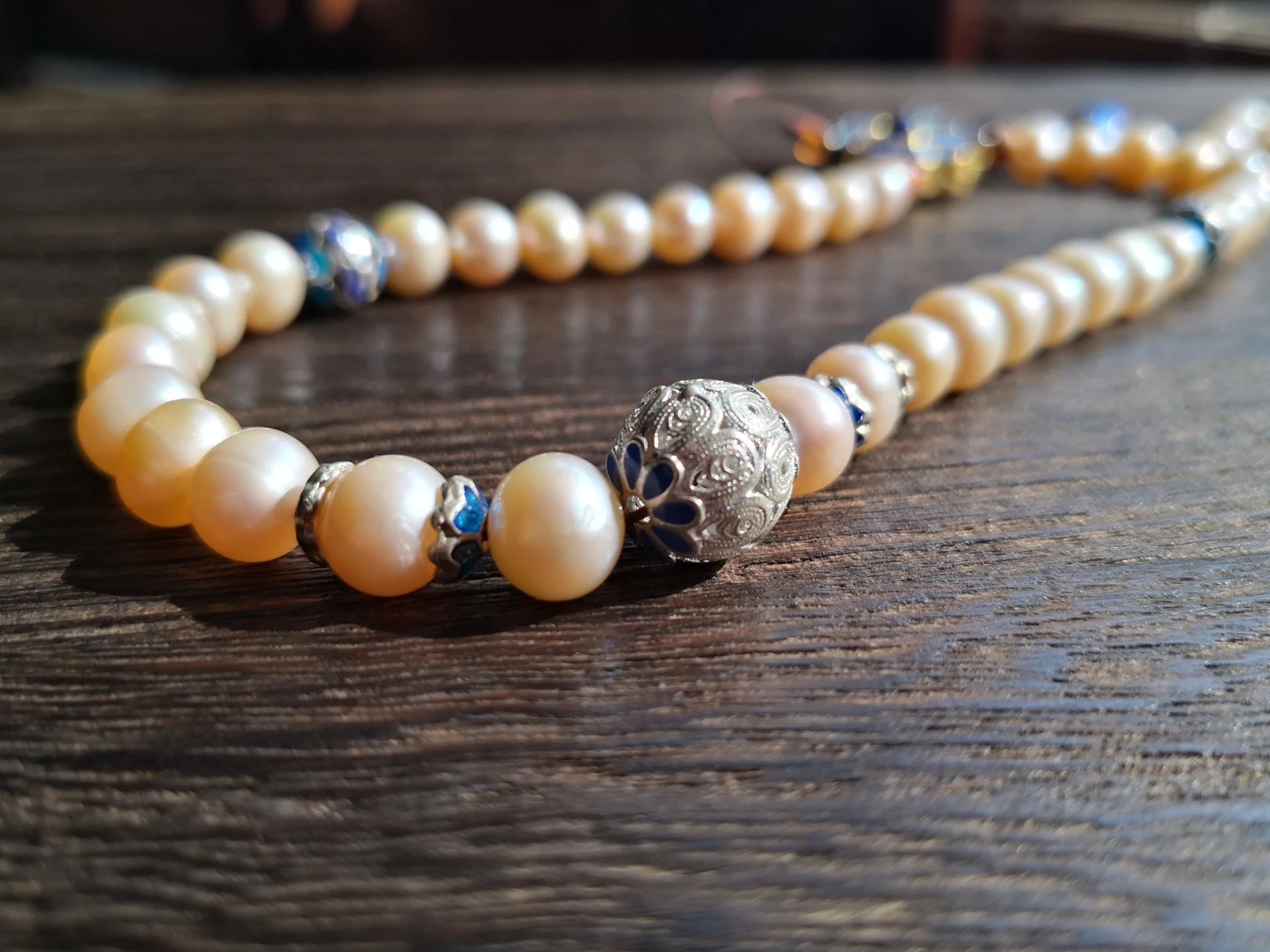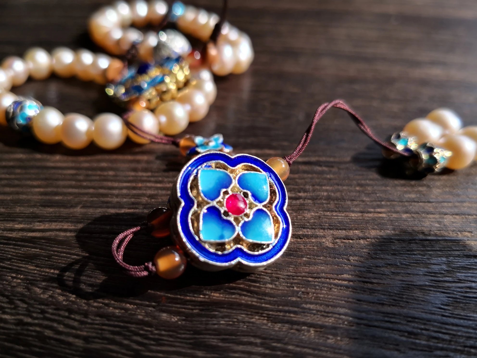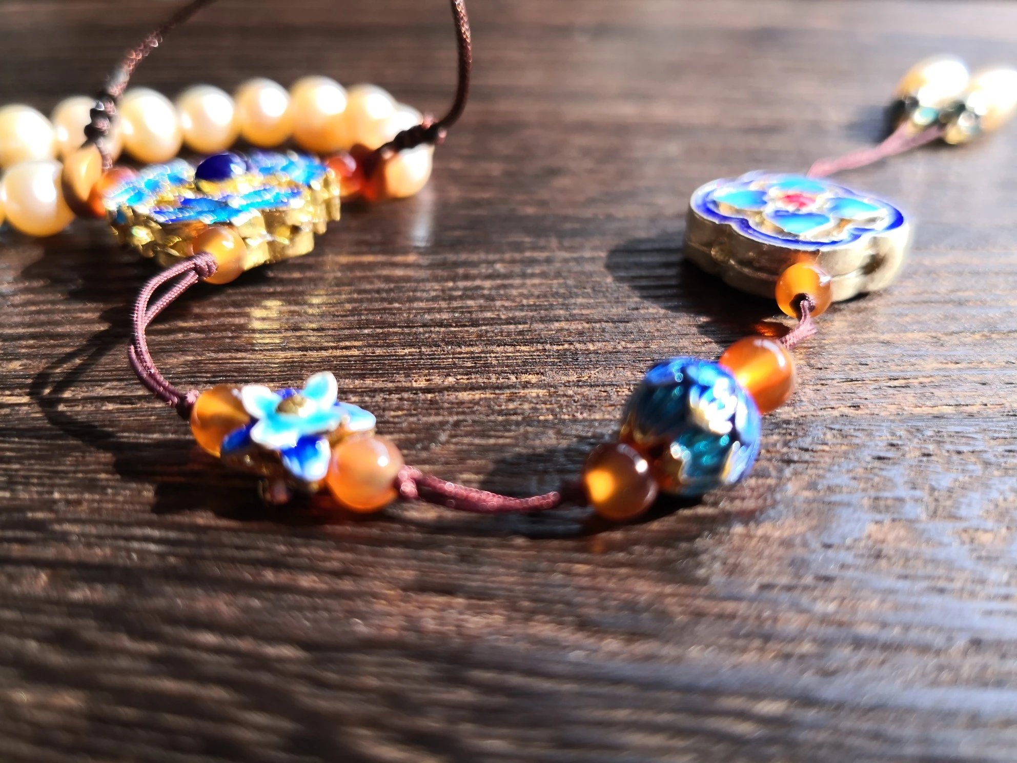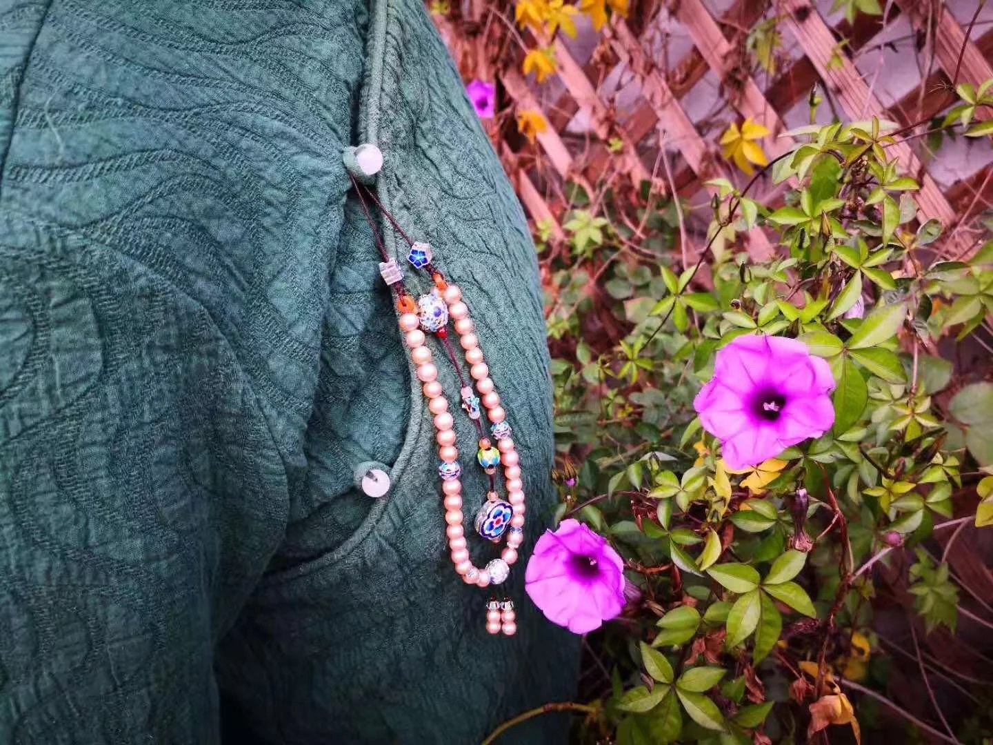 三十六颗粉色的天然淡水珍珠(相同大小白色款请下拉参考款式),铜胎的景泰蓝,比起大大的白珍珠,更显得低调,却难掩光华。