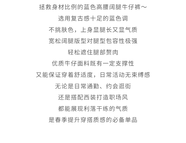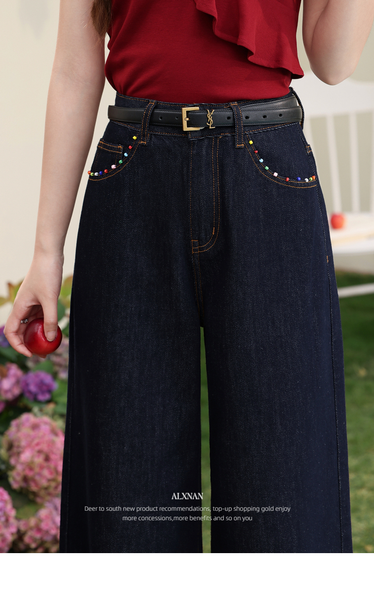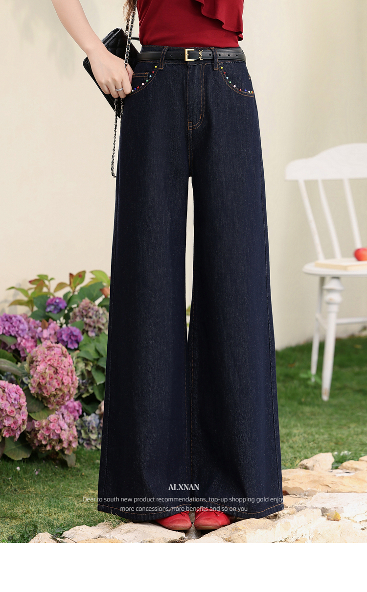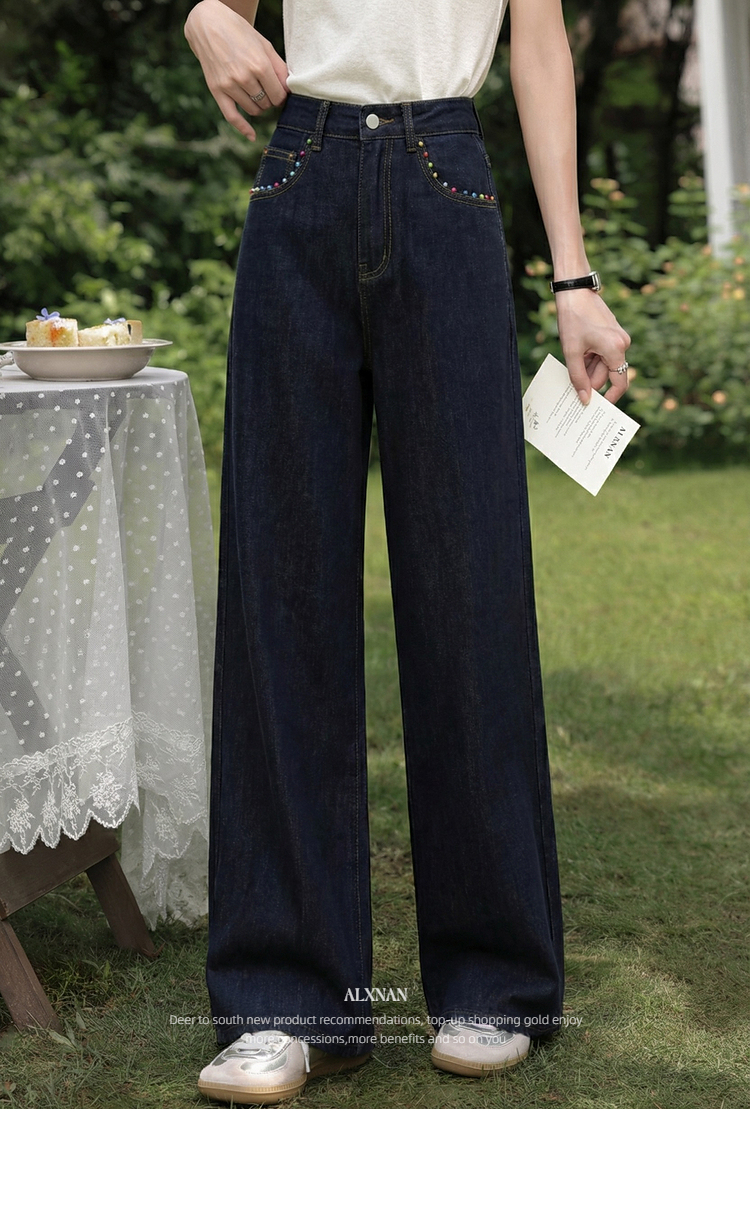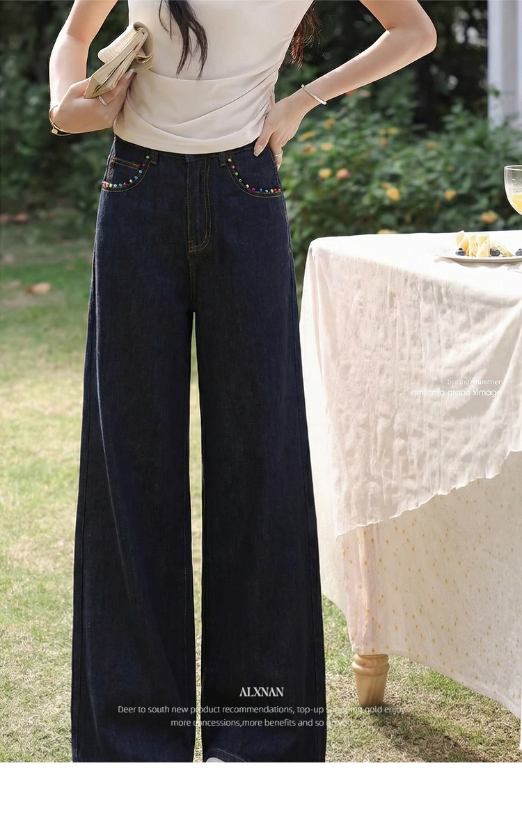 鹿向南「漫步雅姿」深蓝色高腰直筒牛仔裤女春季显瘦宽松阔腿长裤