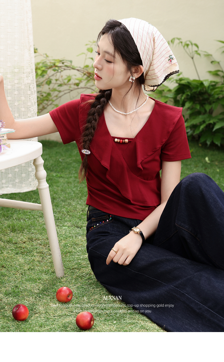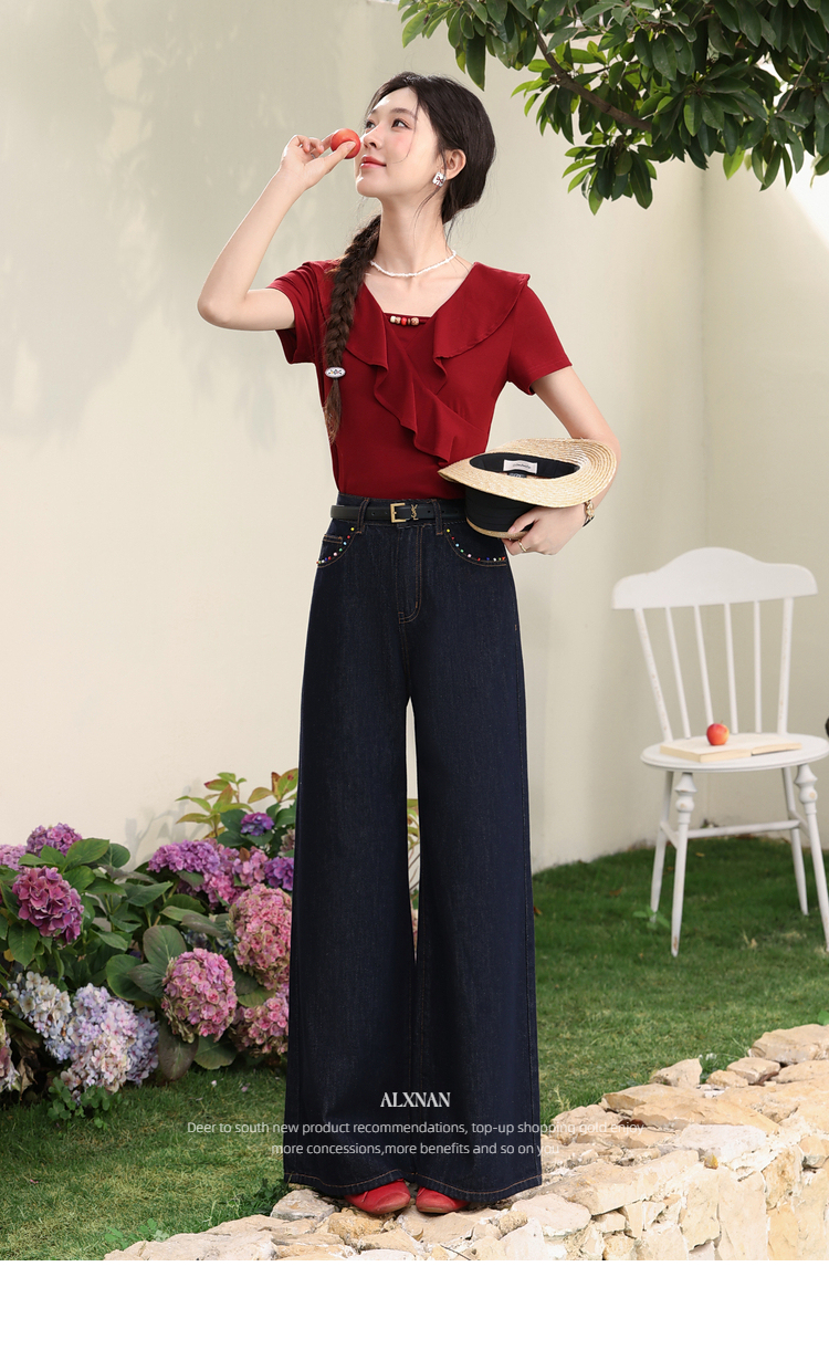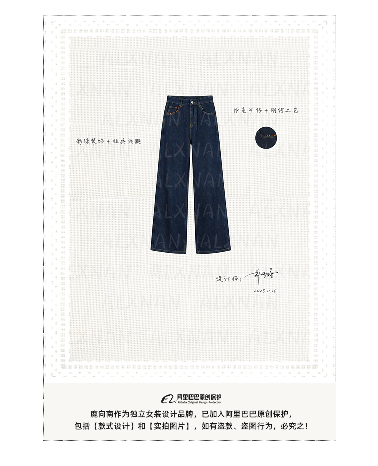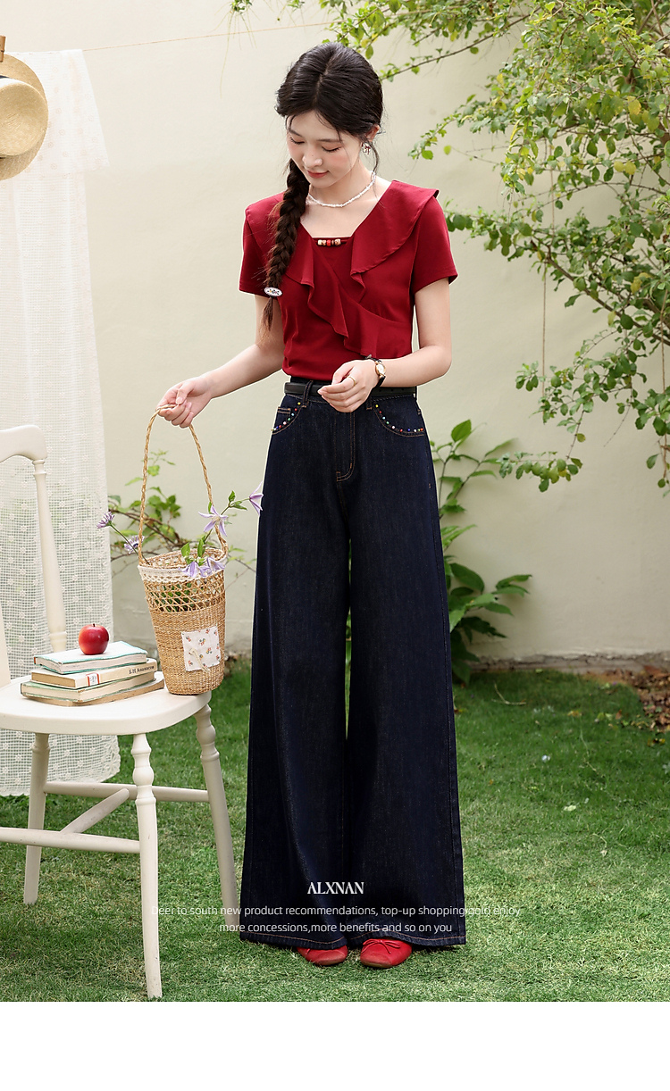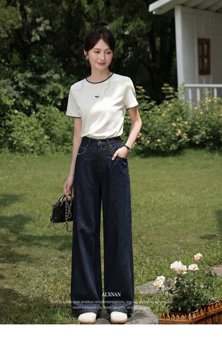 鹿向南「漫步雅姿」深蓝色高腰直筒牛仔裤女春季显瘦宽松阔腿长裤
