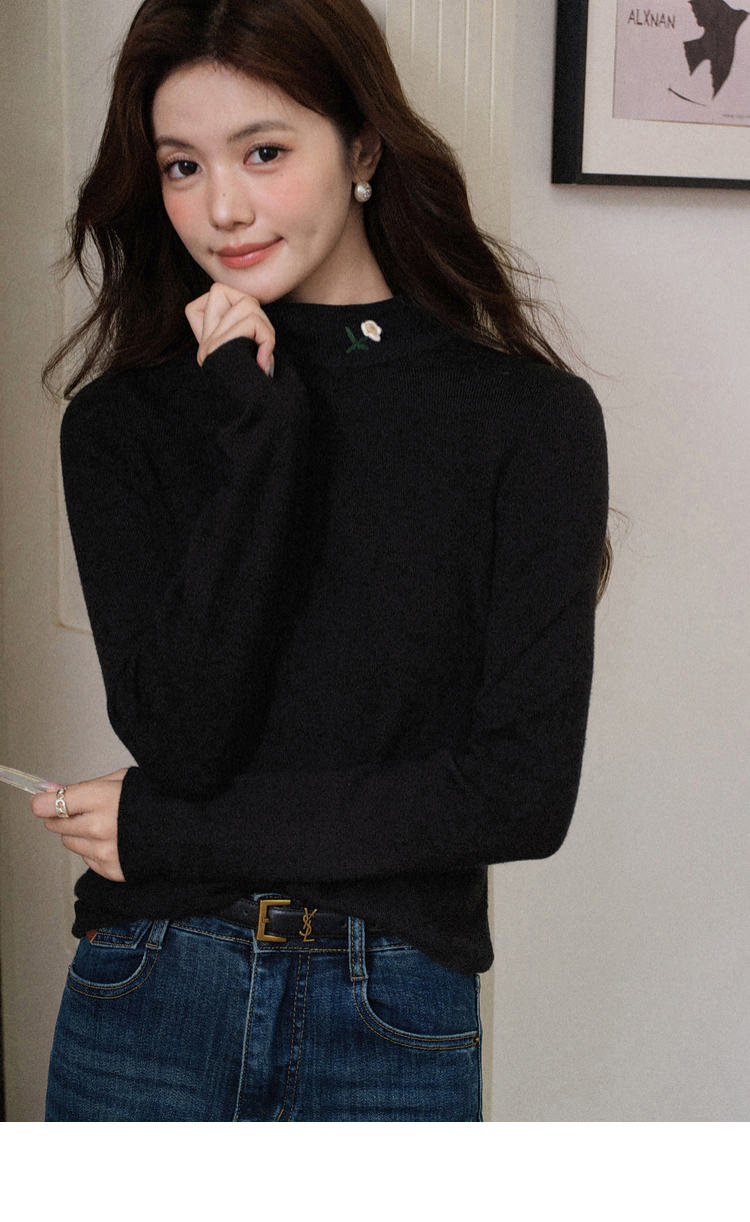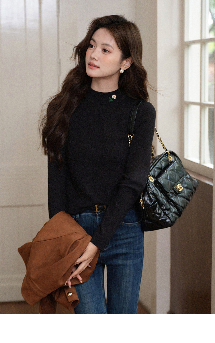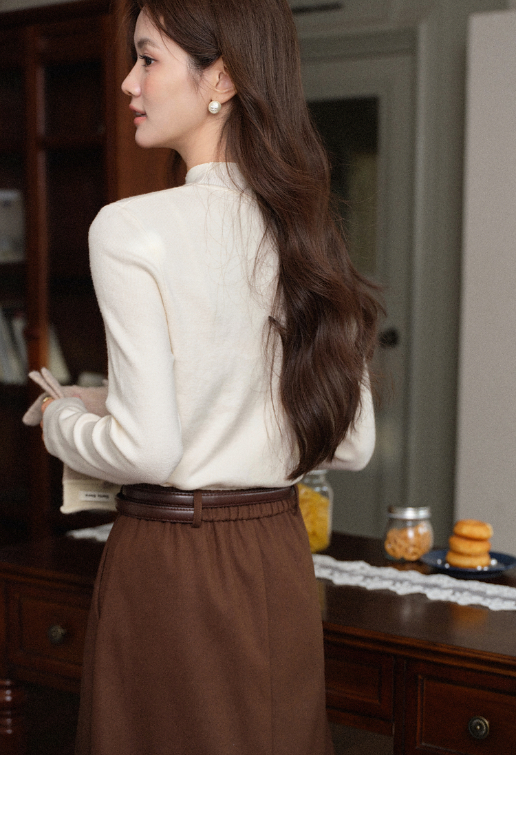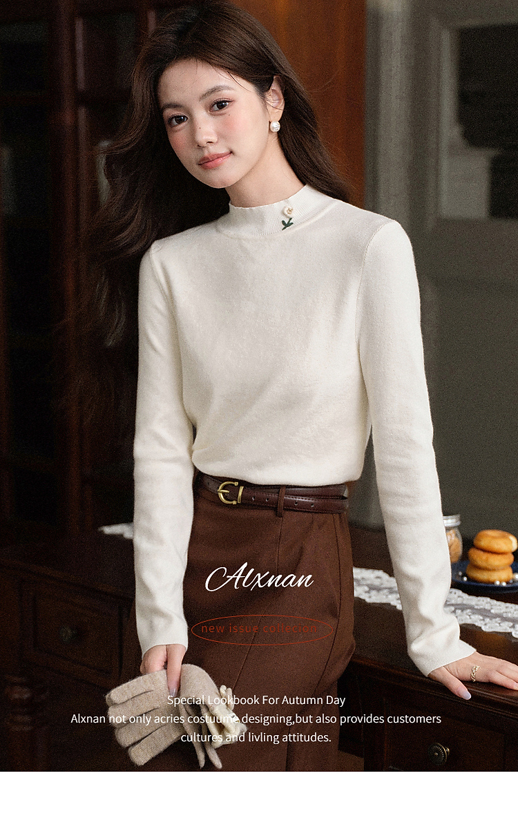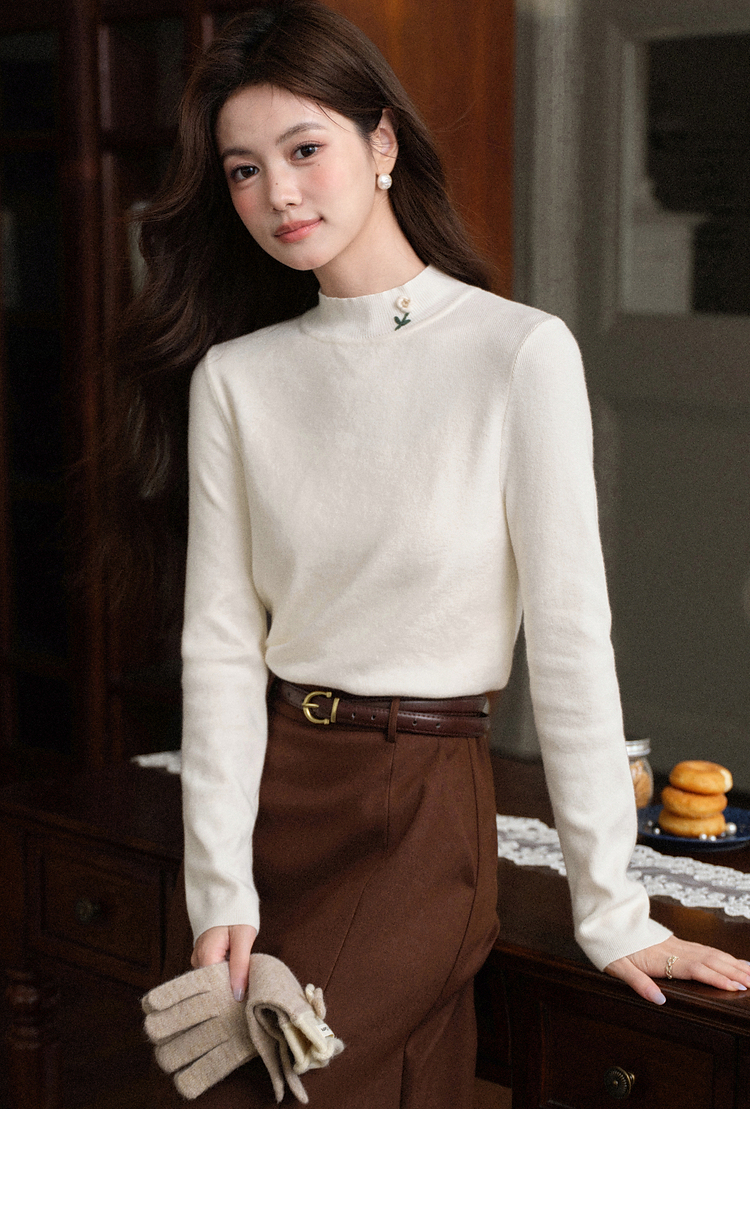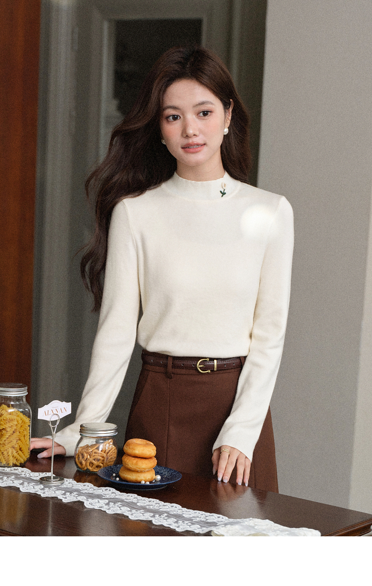 鹿向南「轨事往日」米白色半高领长袖t恤女早秋新款修身内搭上衣