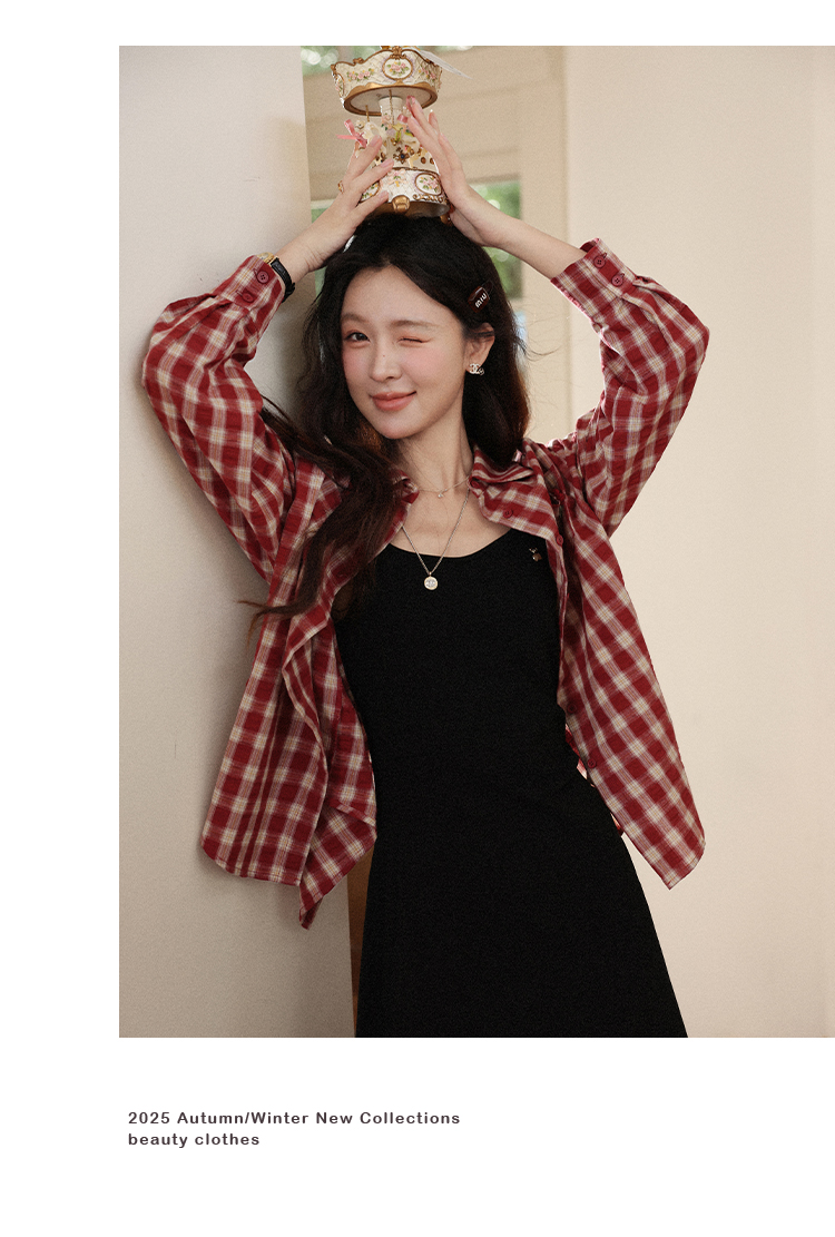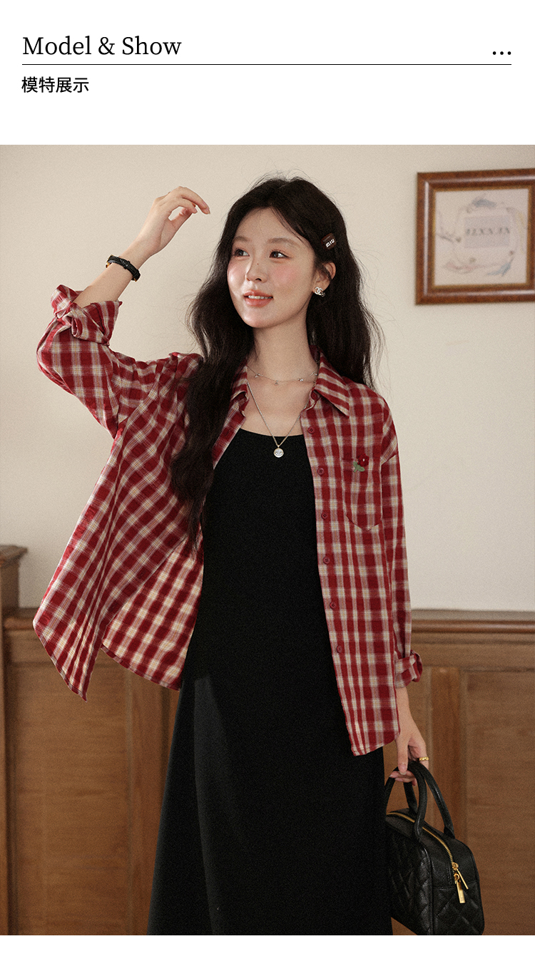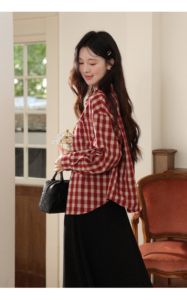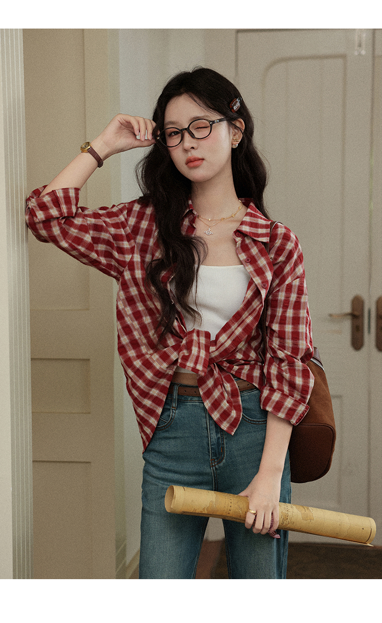 【6折秒杀】鹿向南「百丽甜酒」红色格子防晒外搭衬衫女初秋薄款长袖外套上衣