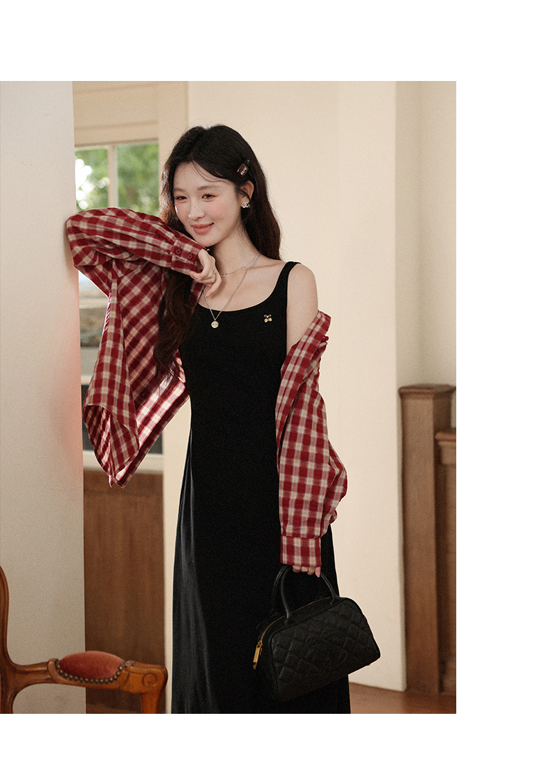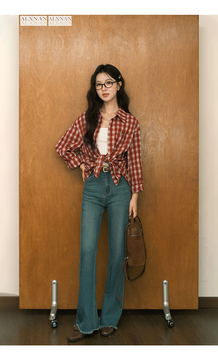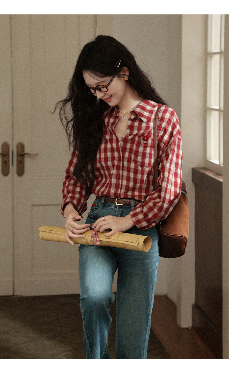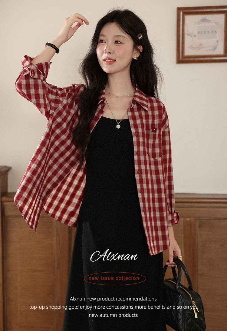 【6折秒杀】鹿向南「百丽甜酒」红色格子防晒外搭衬衫女初秋薄款长袖外套上衣