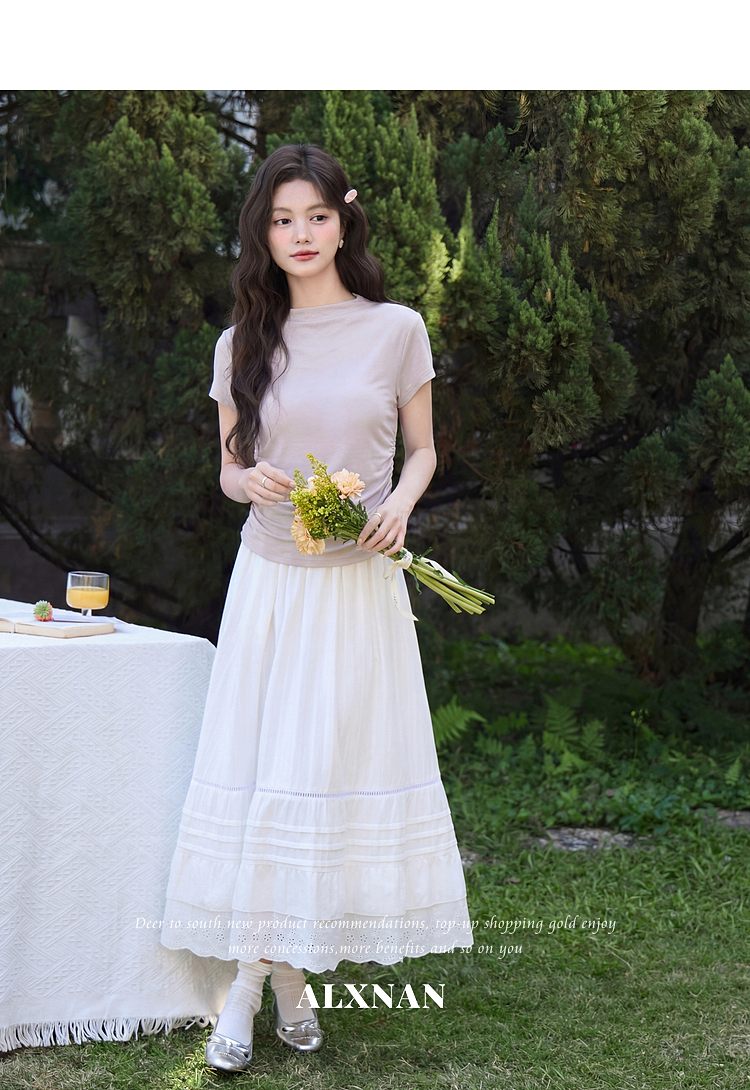 鹿向南「柔风漫摆」法式温柔白杏色A字半身裙女春季蕾丝长款纱裙