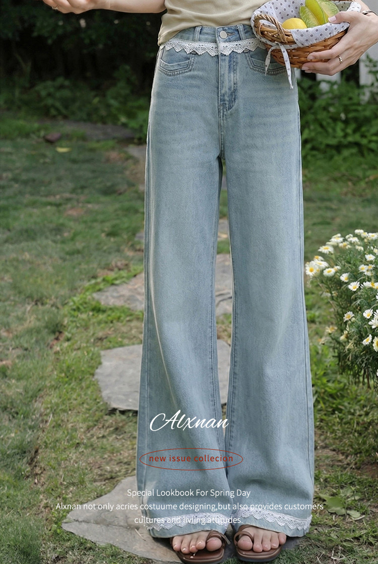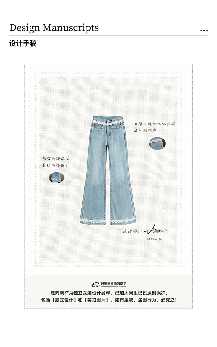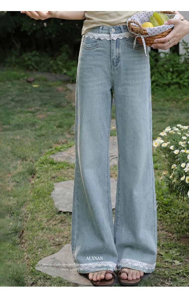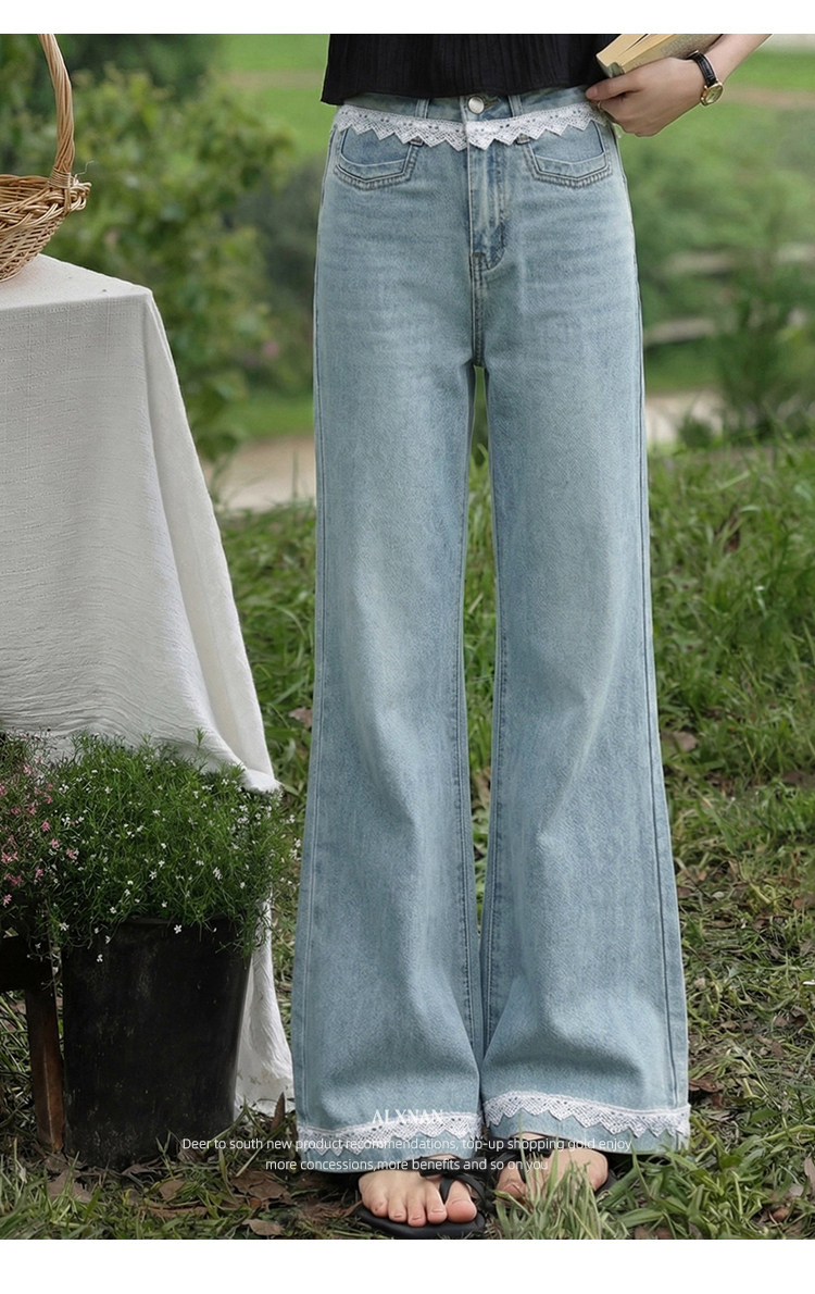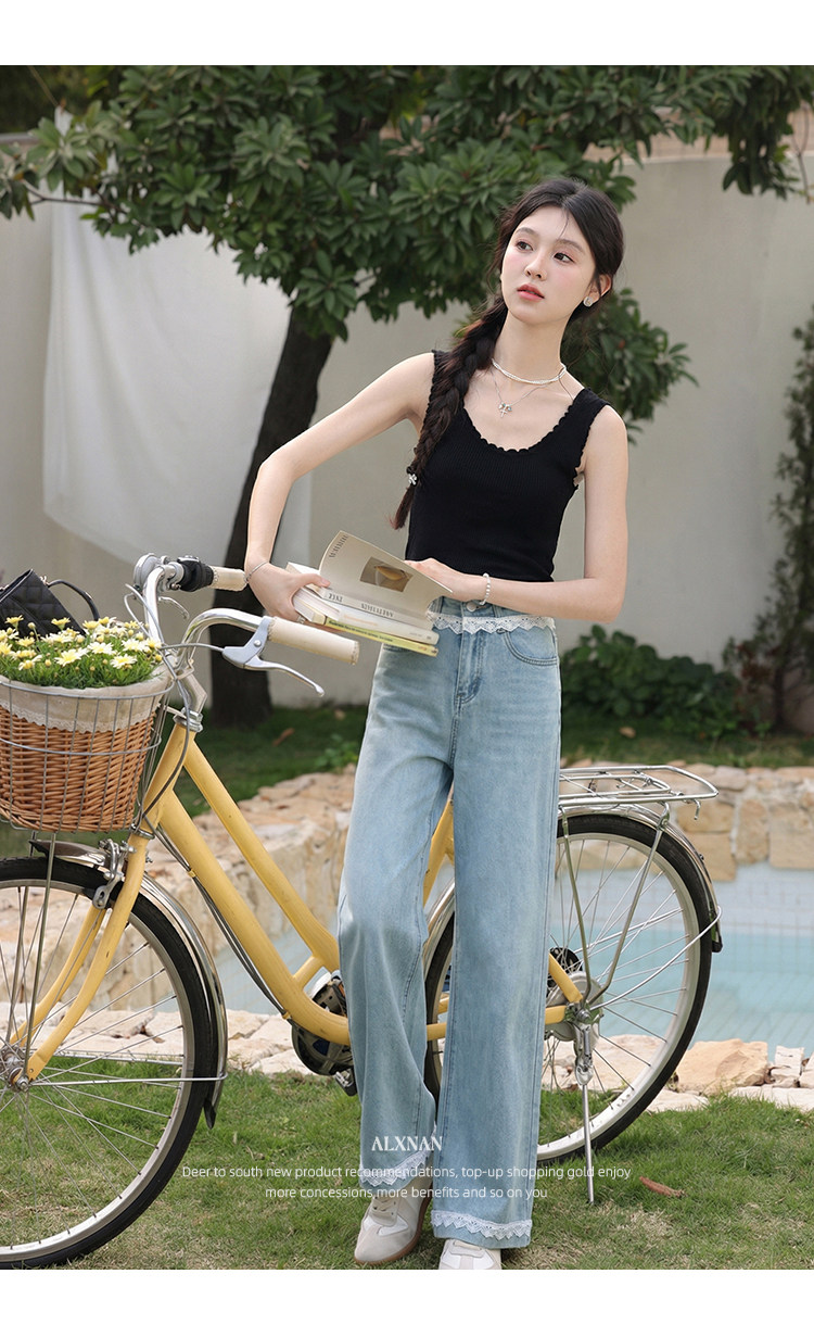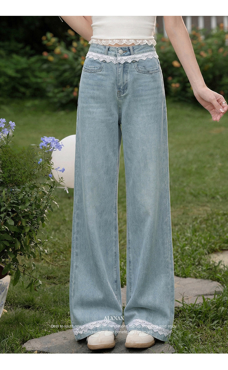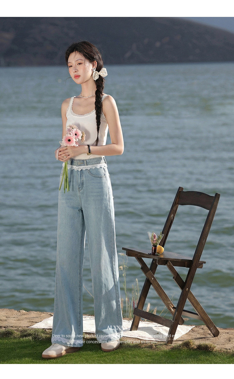 鹿向南「秋香胭脂」蓝色高腰牛仔裤女春季法式设计感阔腿直筒裤