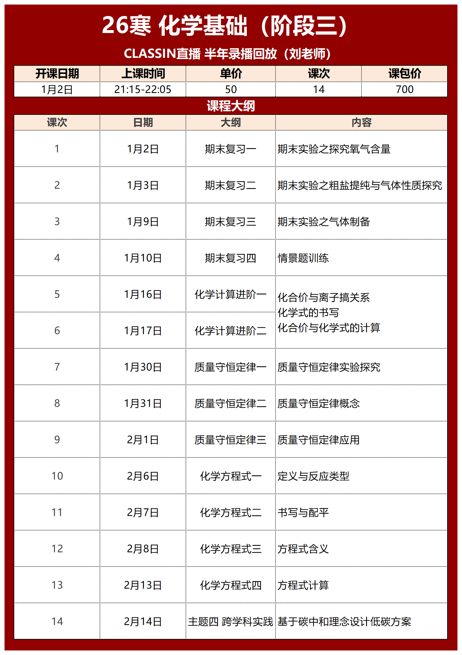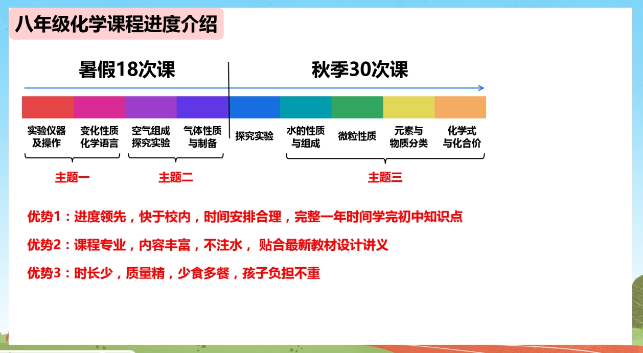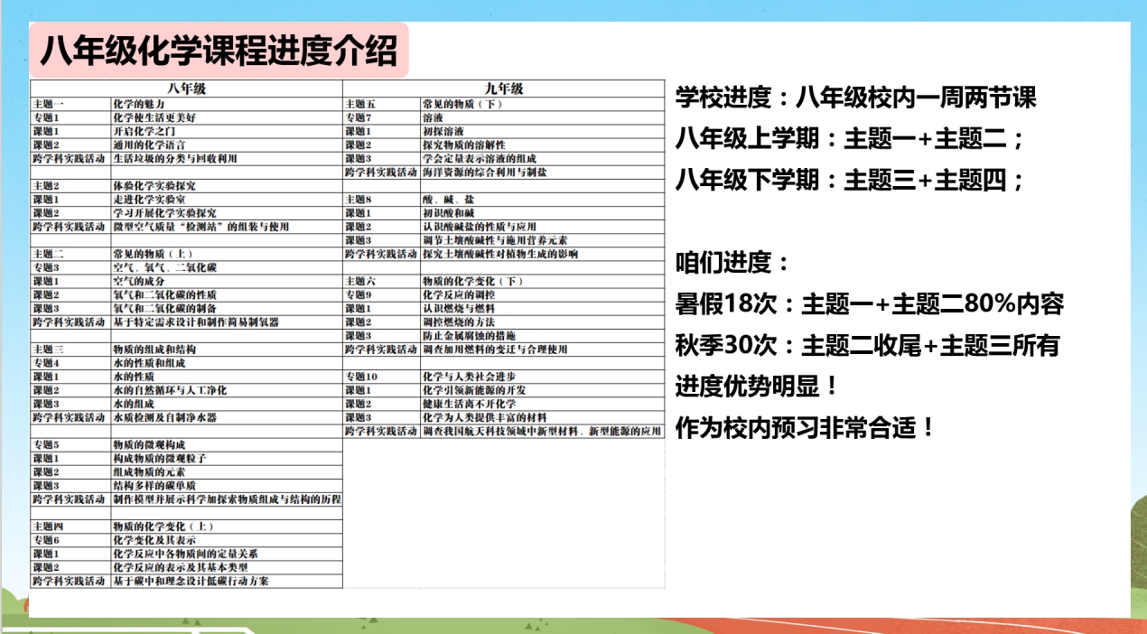 此课程共10个月四期,学完整个校内初中化学基础内容,跟校内知识点完全匹配,可作为校内化学的提前预习