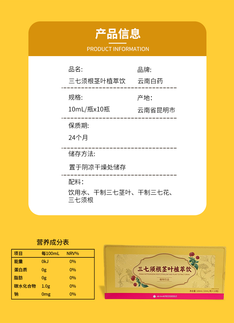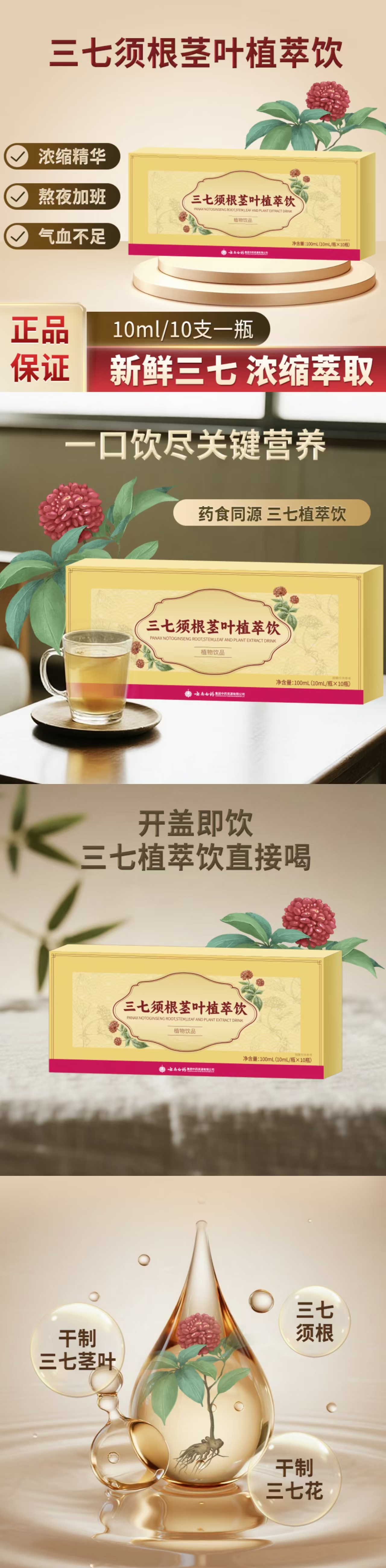 【新鲜三七】云南白药 三七须根茎叶植萃饮 10ml/瓶*10瓶/ 盒 浓缩萃取