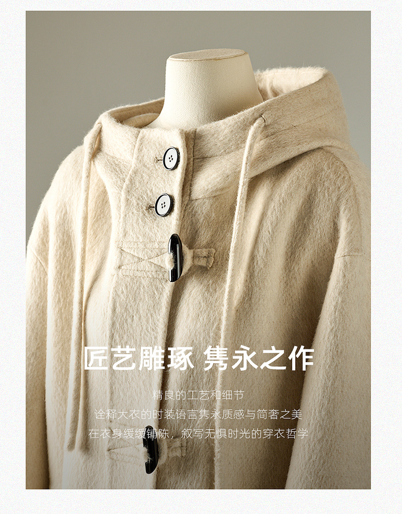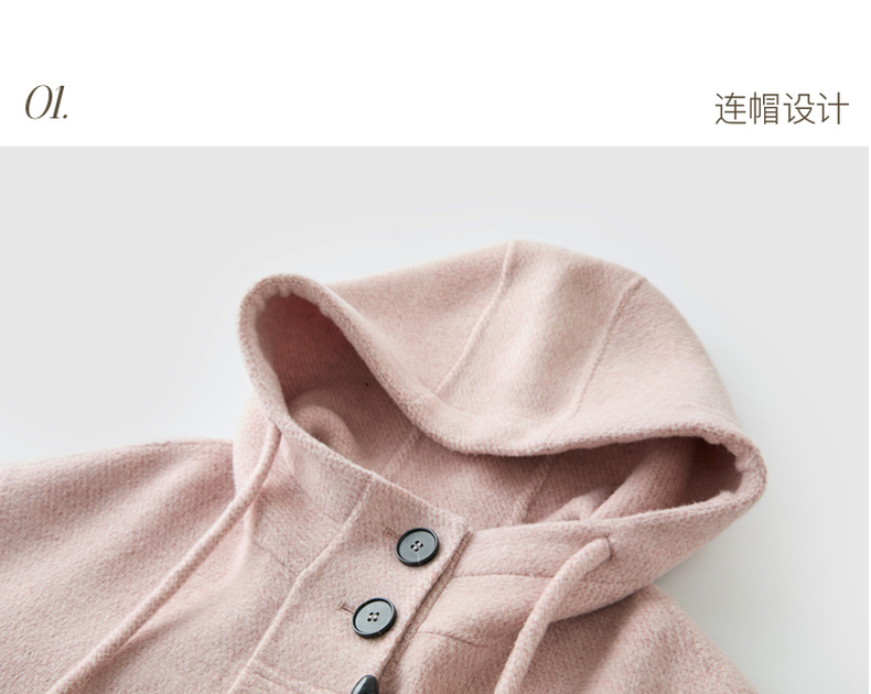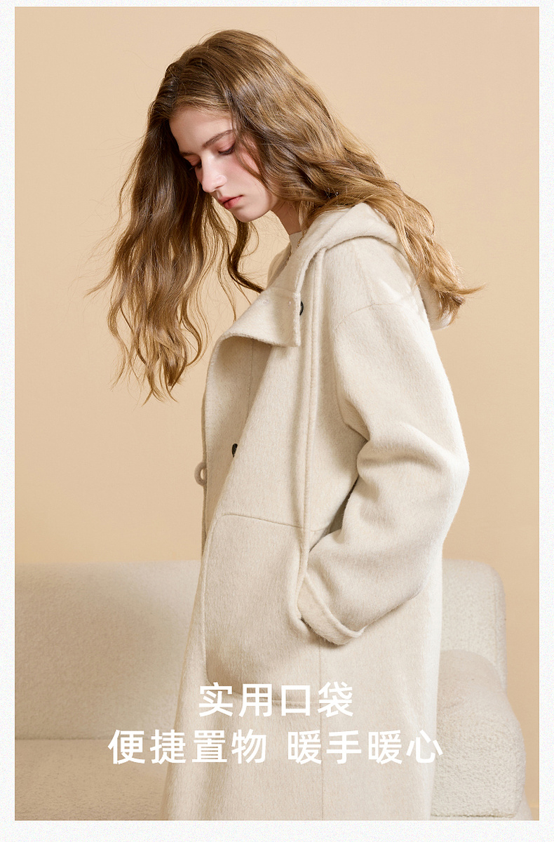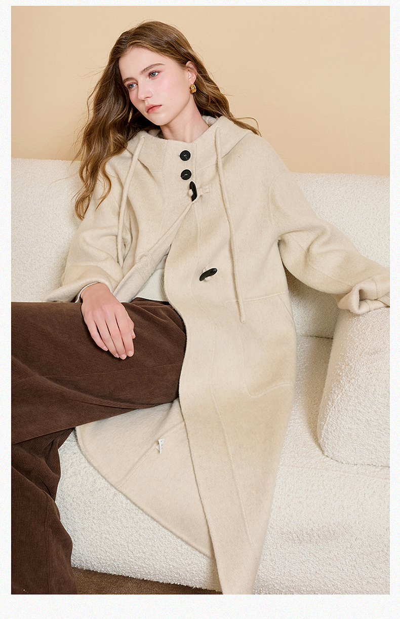 【阿尔巴卡】三彩2025冬季新款连帽双面呢大衣长款牛角扣M