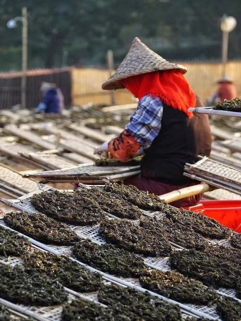 紫菜应该是大海给我们最具包容性的礼物了。紫菜遵循着传统的种植节气,中秋时节,霞浦渔民把育好苗的网帘下到滩涂上,开始了这一年的紫菜养殖。紫菜生长过程变化,周期大约半个月一季生产“五水”,第一次采剪的叫头水紫菜,一水的紫菜口感脆嫩丝滑清甜,质量最好,之后依次降低