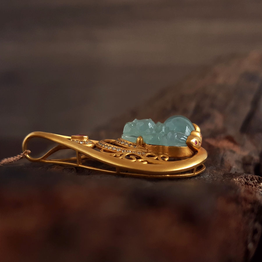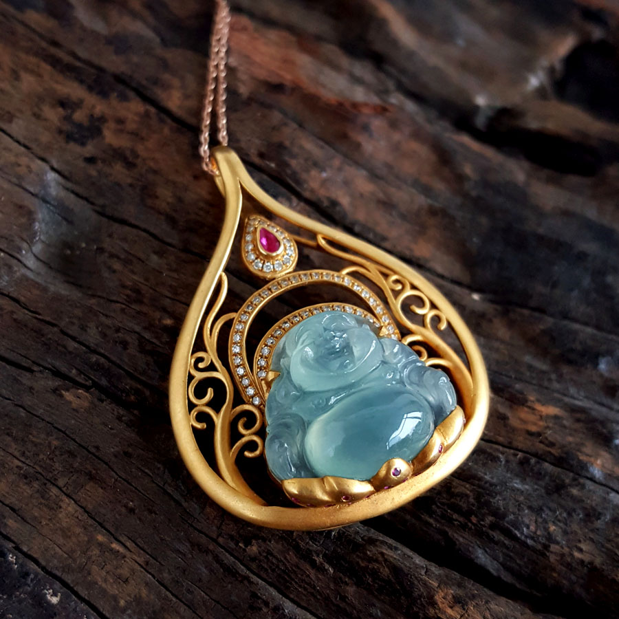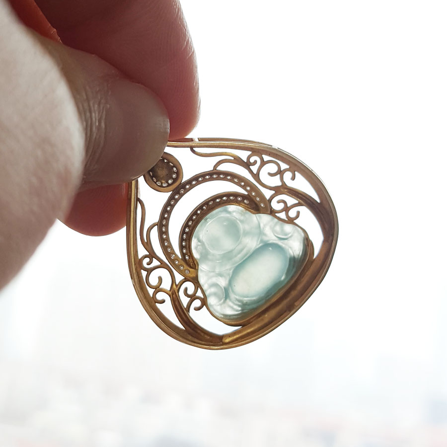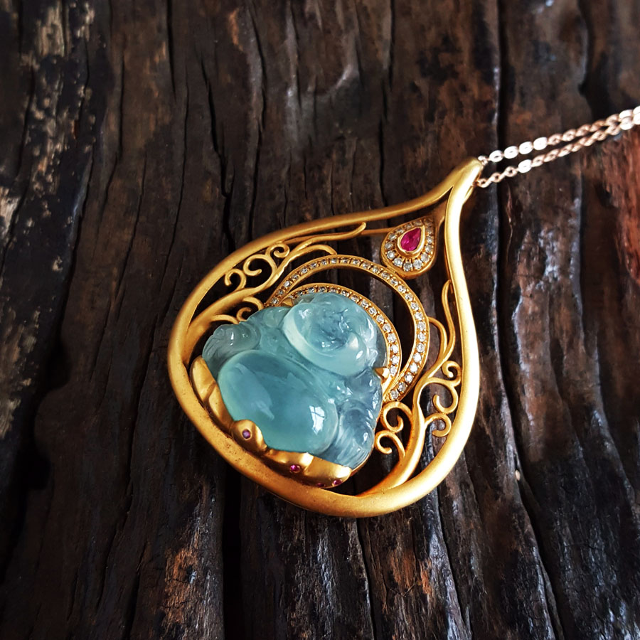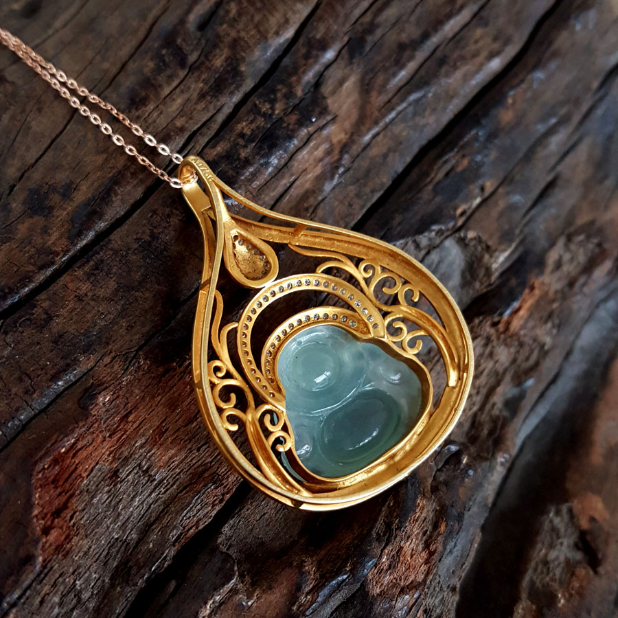 名称 | AU750黄金镶钻镶天然细腻浅青冰种佛公造型翡翠吊坠项链 |