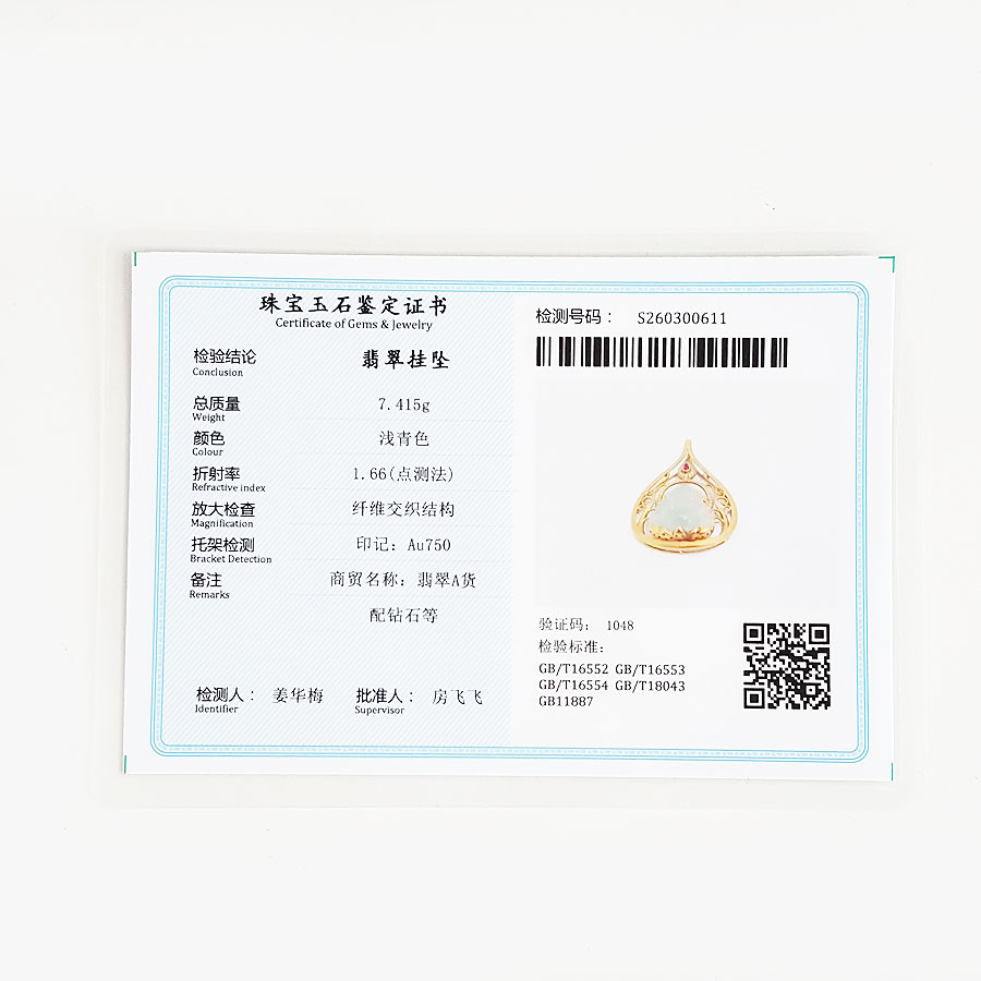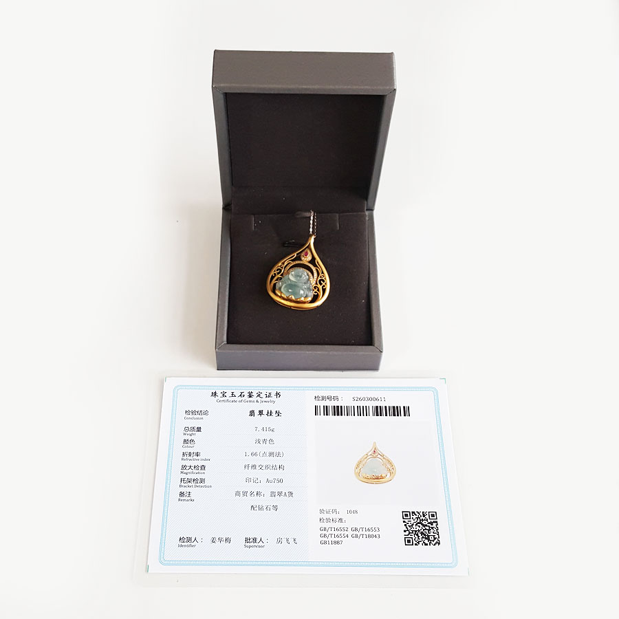 【天然正品】A货翡翠AU750黄金镶钻镶天然细腻浅青冰种佛公造型翡翠吊坠项链 佛公:17.6*14.8MM 131125AH22