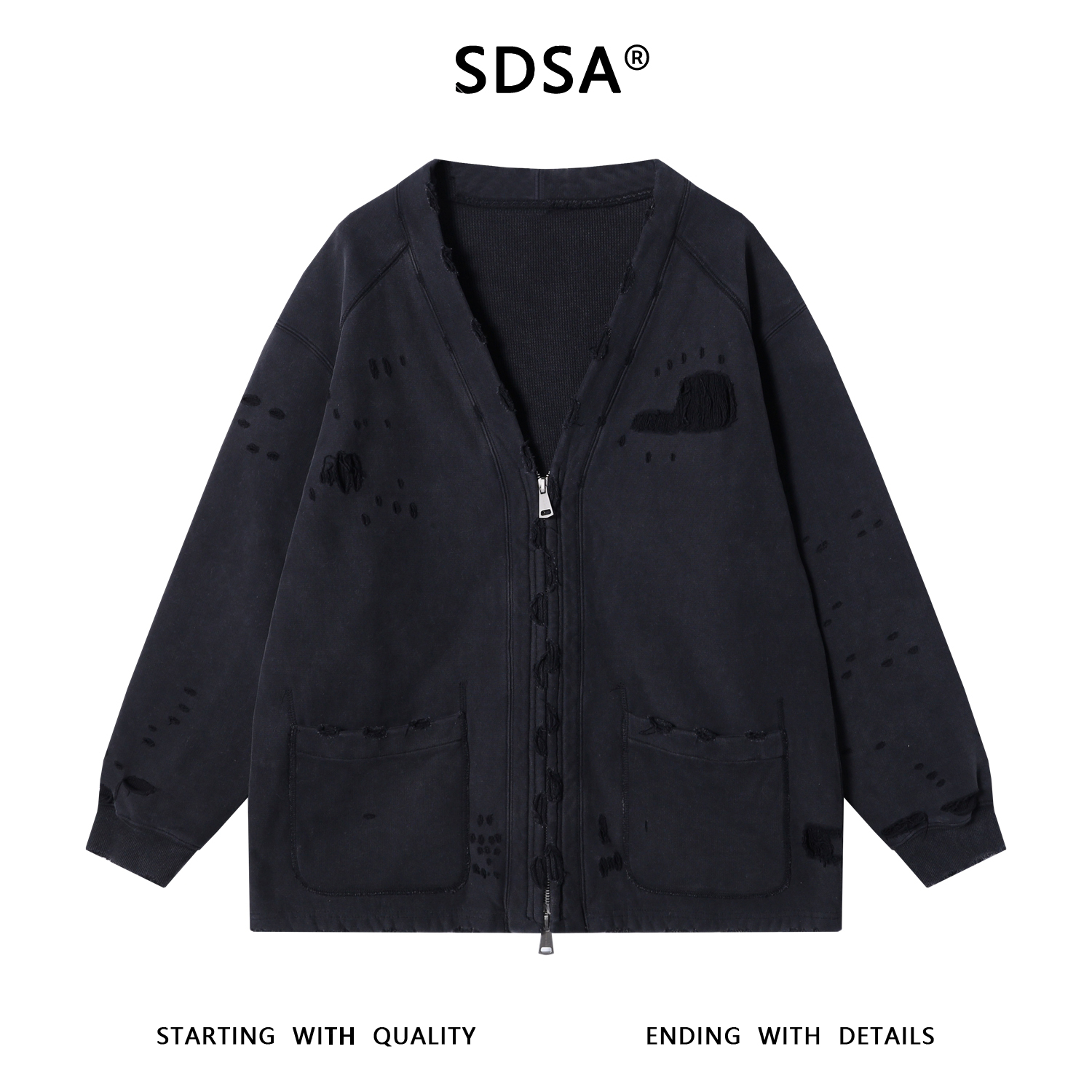 SDSA男士秋冬新款痞帅男装简约时尚磨破拉链V领卫衣外套百搭宽松