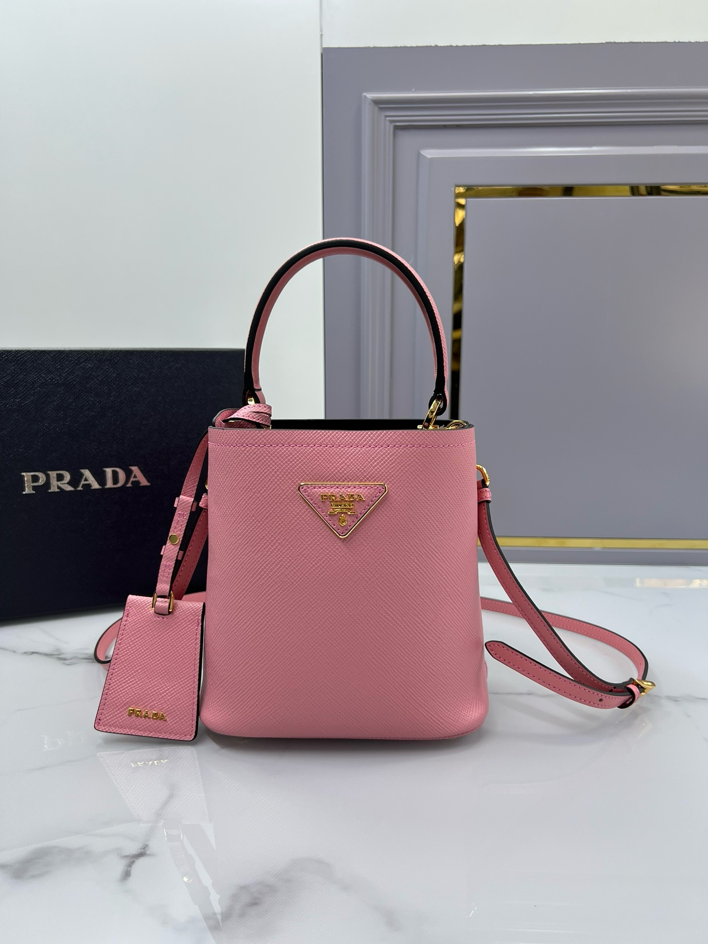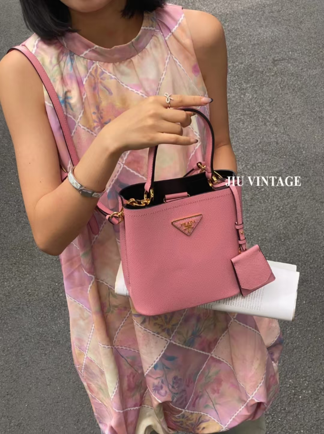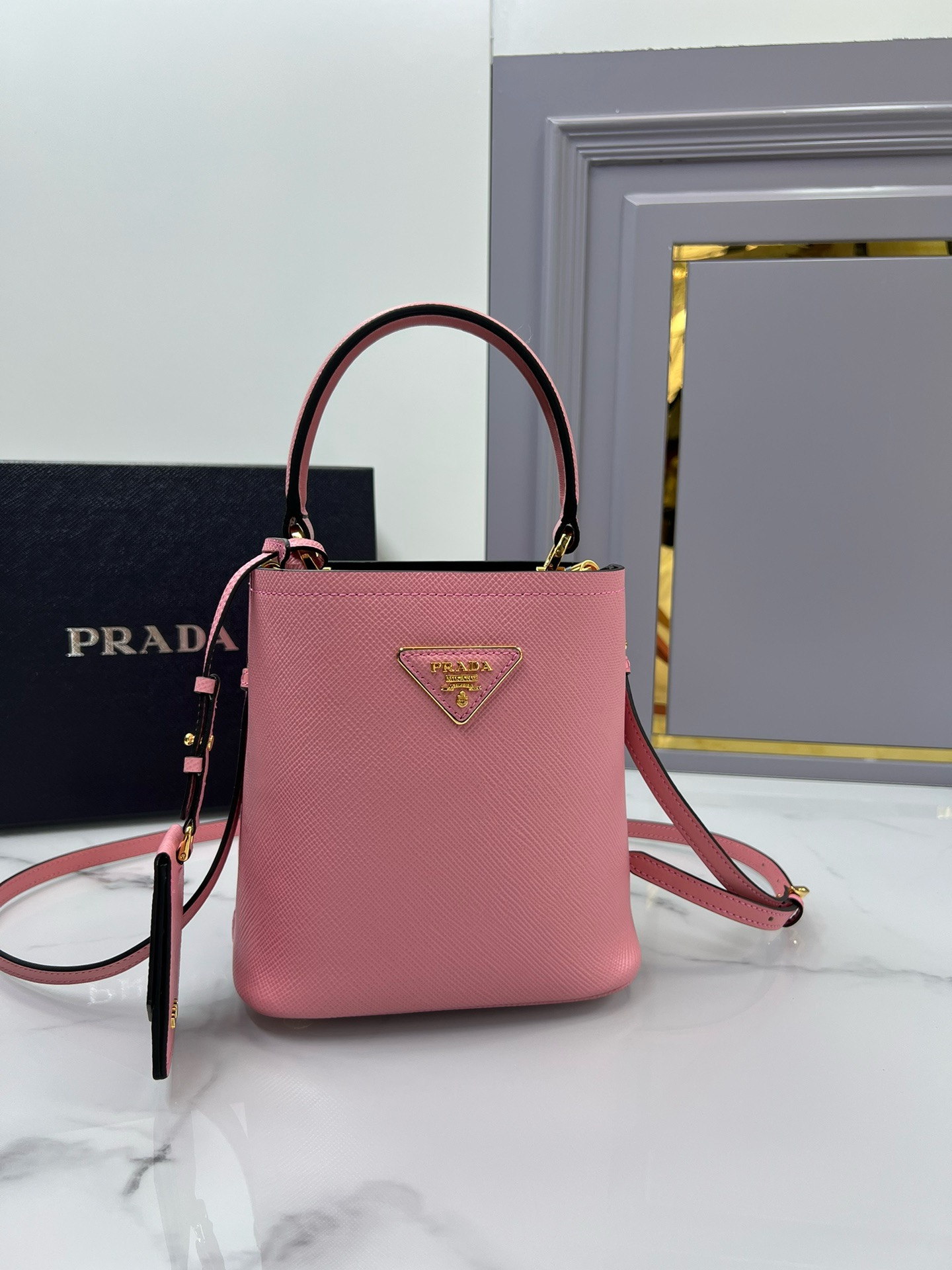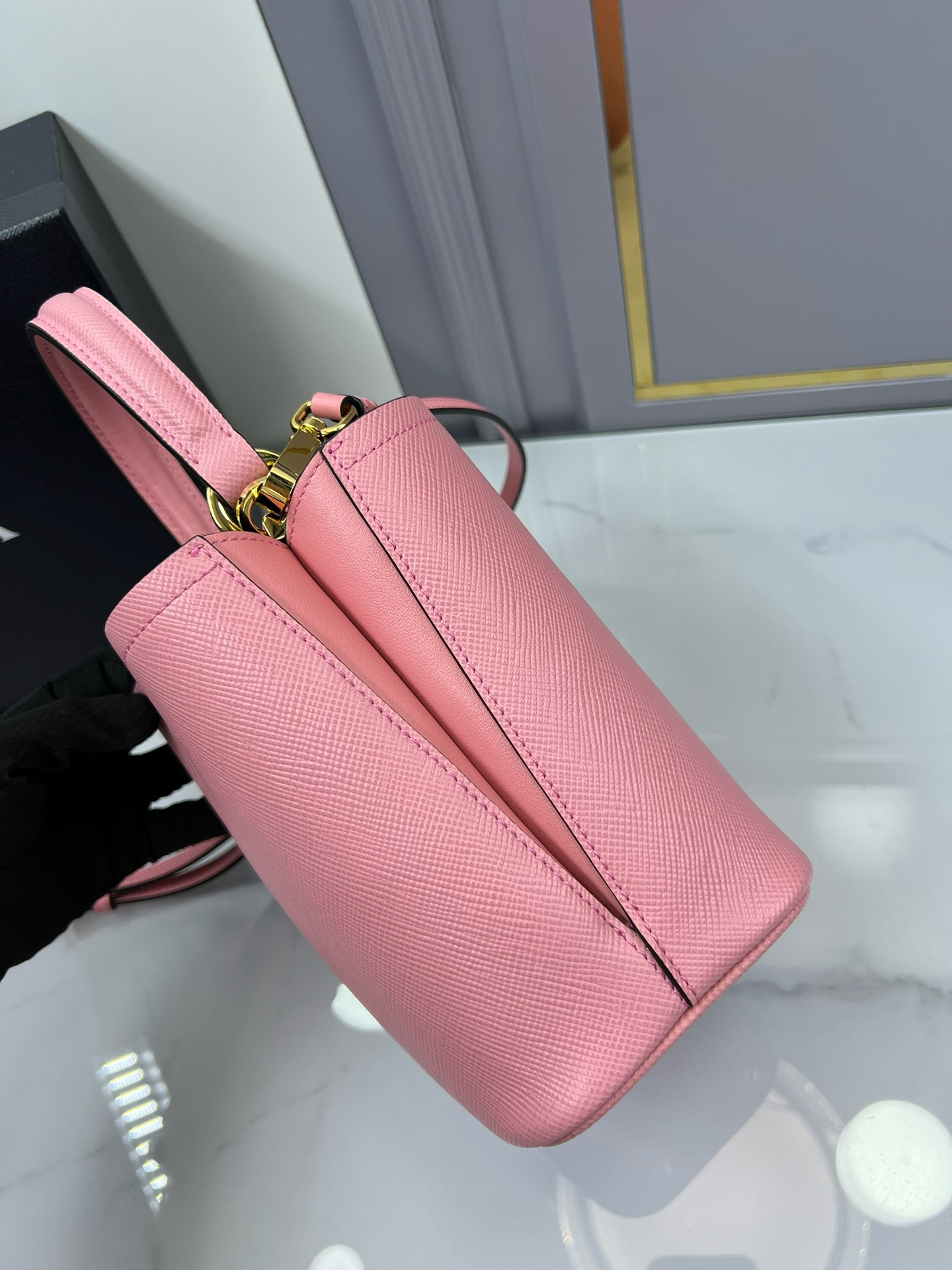 风靡全球的“小精灵”saffiano十字纹牛皮赋予这款p家水桶包独特的魅力--不会形状太软不够精神,也不会过于呆板缺乏质感,可爱的迷你号更是增添时尚感,外部十字纹牛皮挺括有型,内里羊皮柔软细腻,可手提可肩背可斜挎。尺寸18*17*10.5 cm