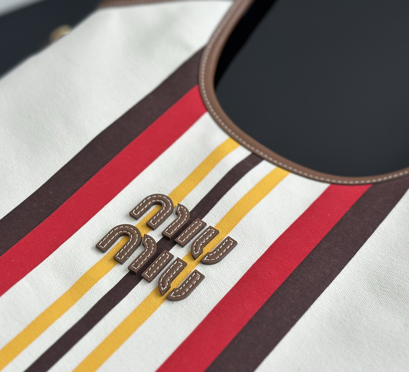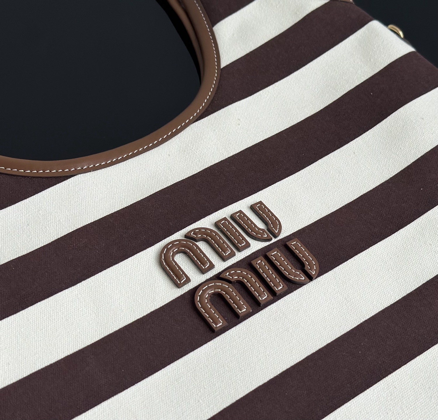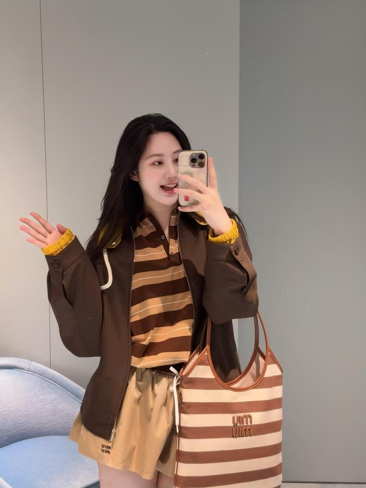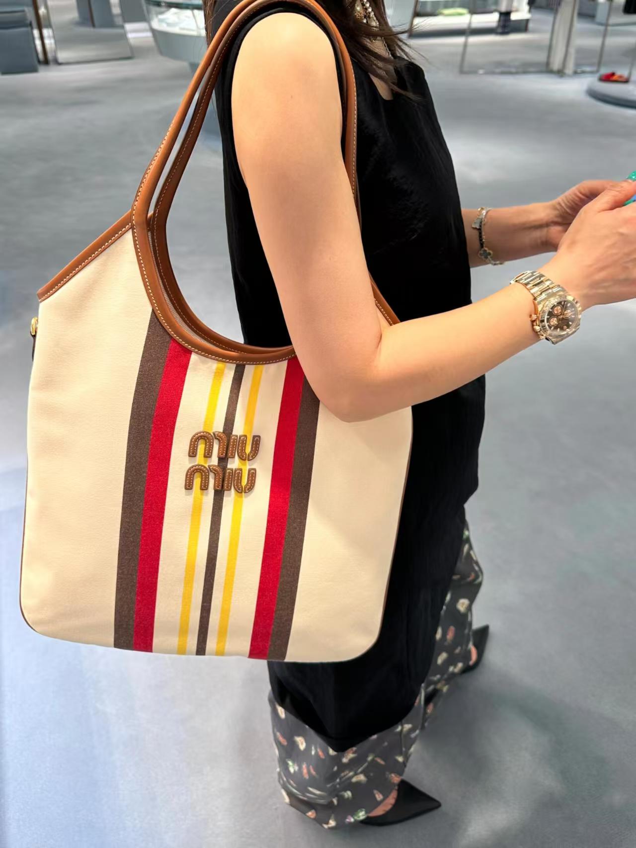 MiuMiu 25最新款条纹帆布Tote包 经典条纹元素搭配品牌标识,风格复古又时尚,辨识度高,轻松在众多包包里脱颖而出,适配多种穿搭场景,从休闲到轻职场都能搭 优质帆布结合皮质包边,帆布耐用、有质感,皮质提升精致度,制作工艺精细,缝线、包边等细节处理到位,保证包包品质与使用寿命