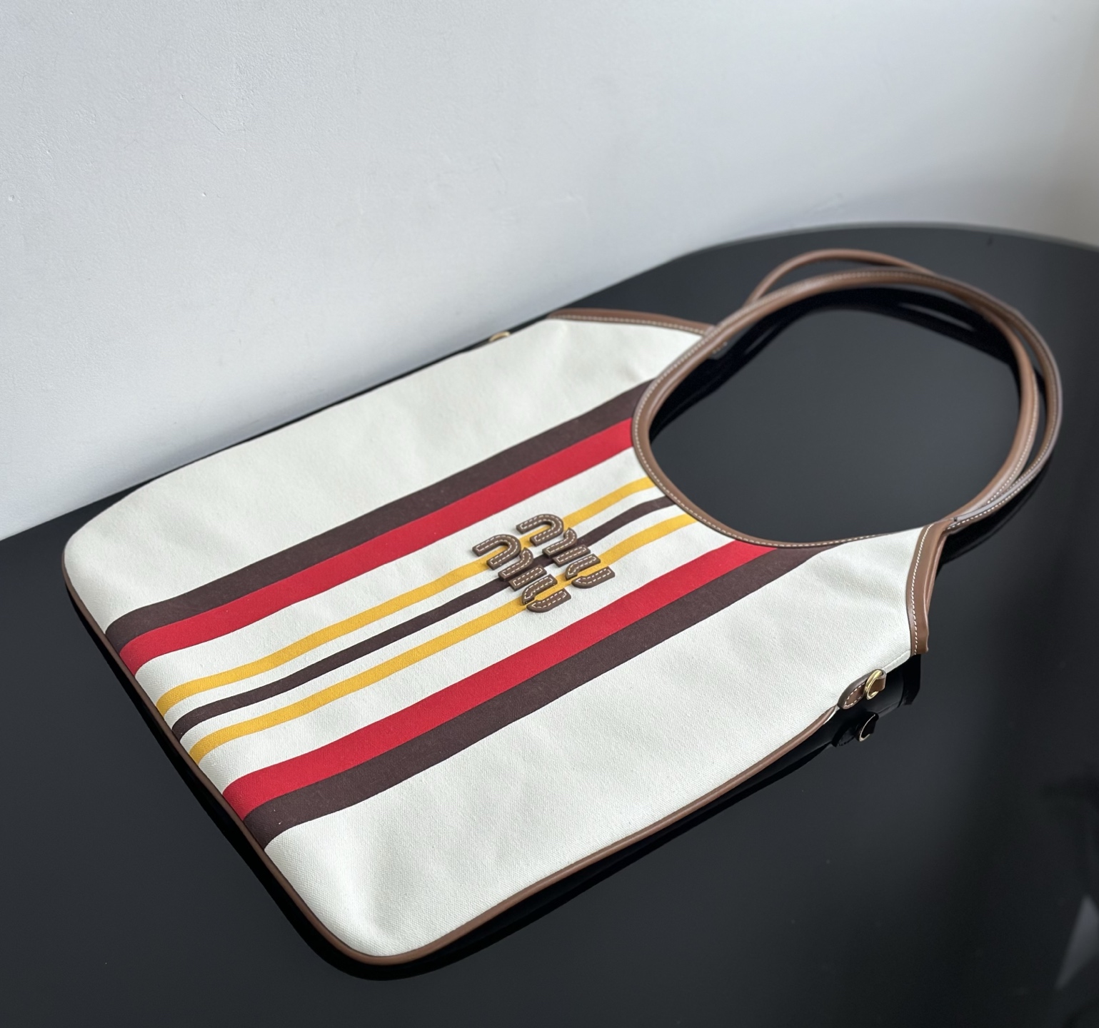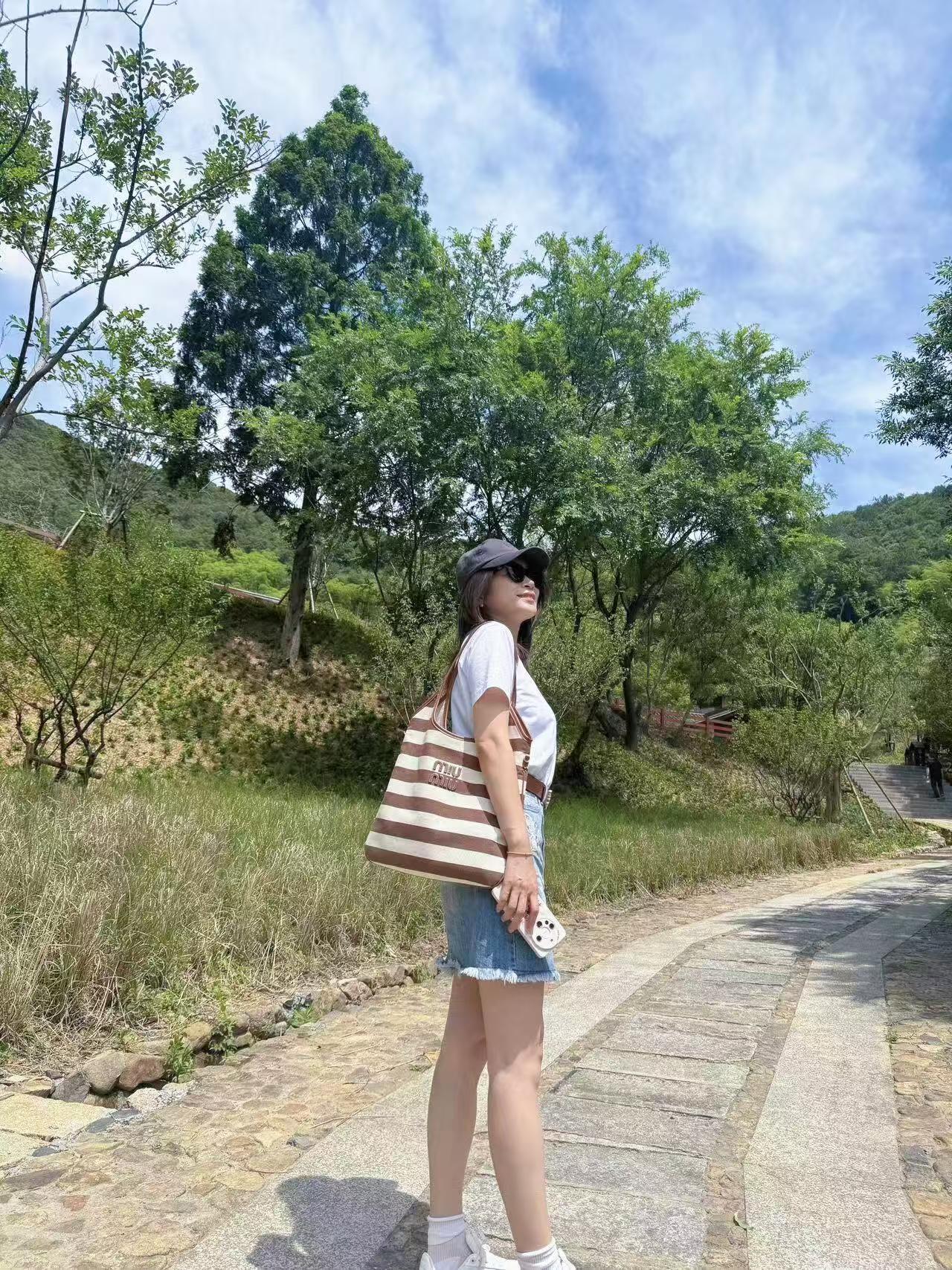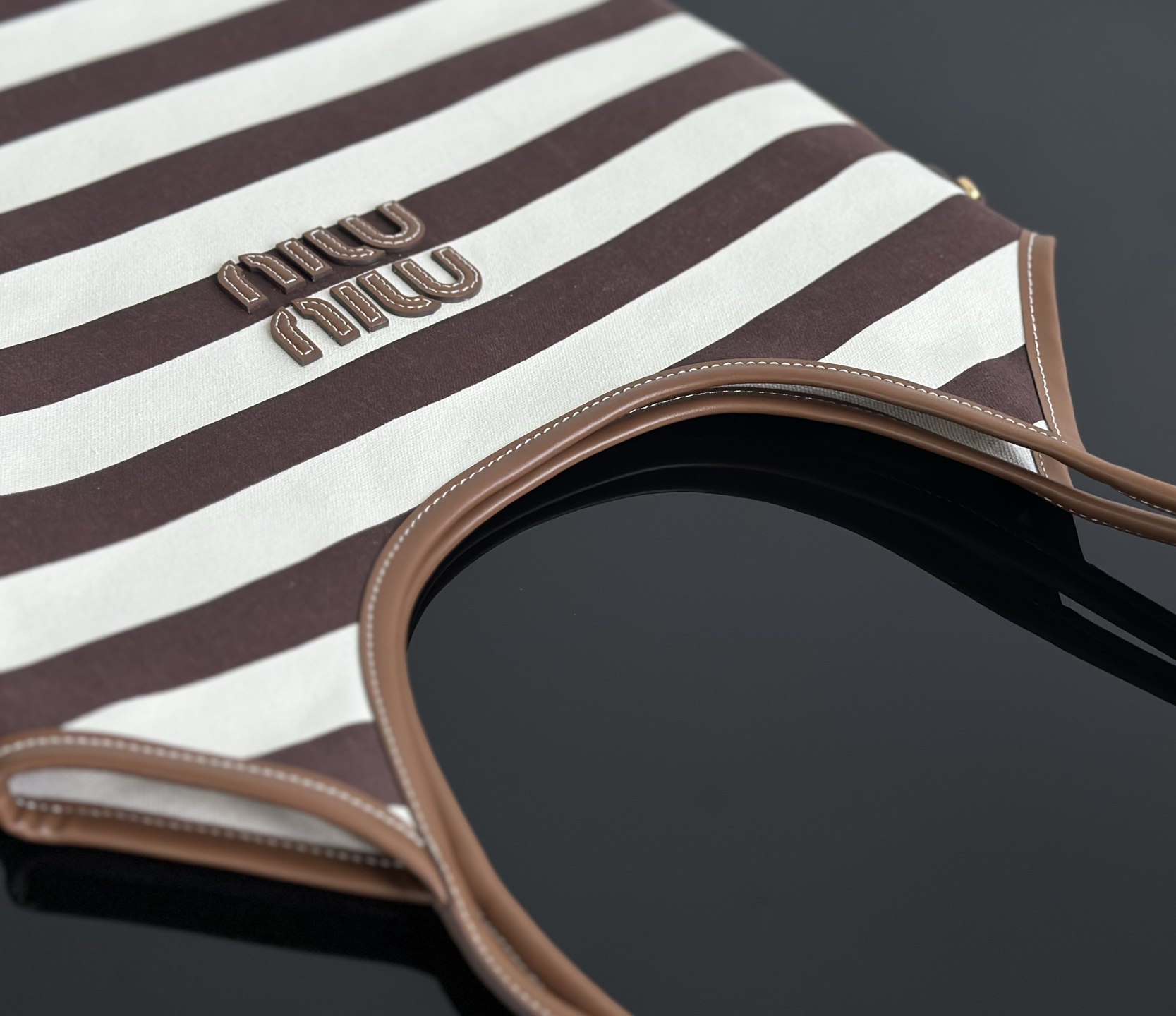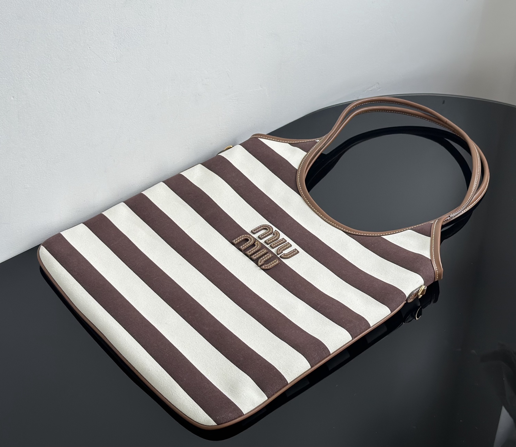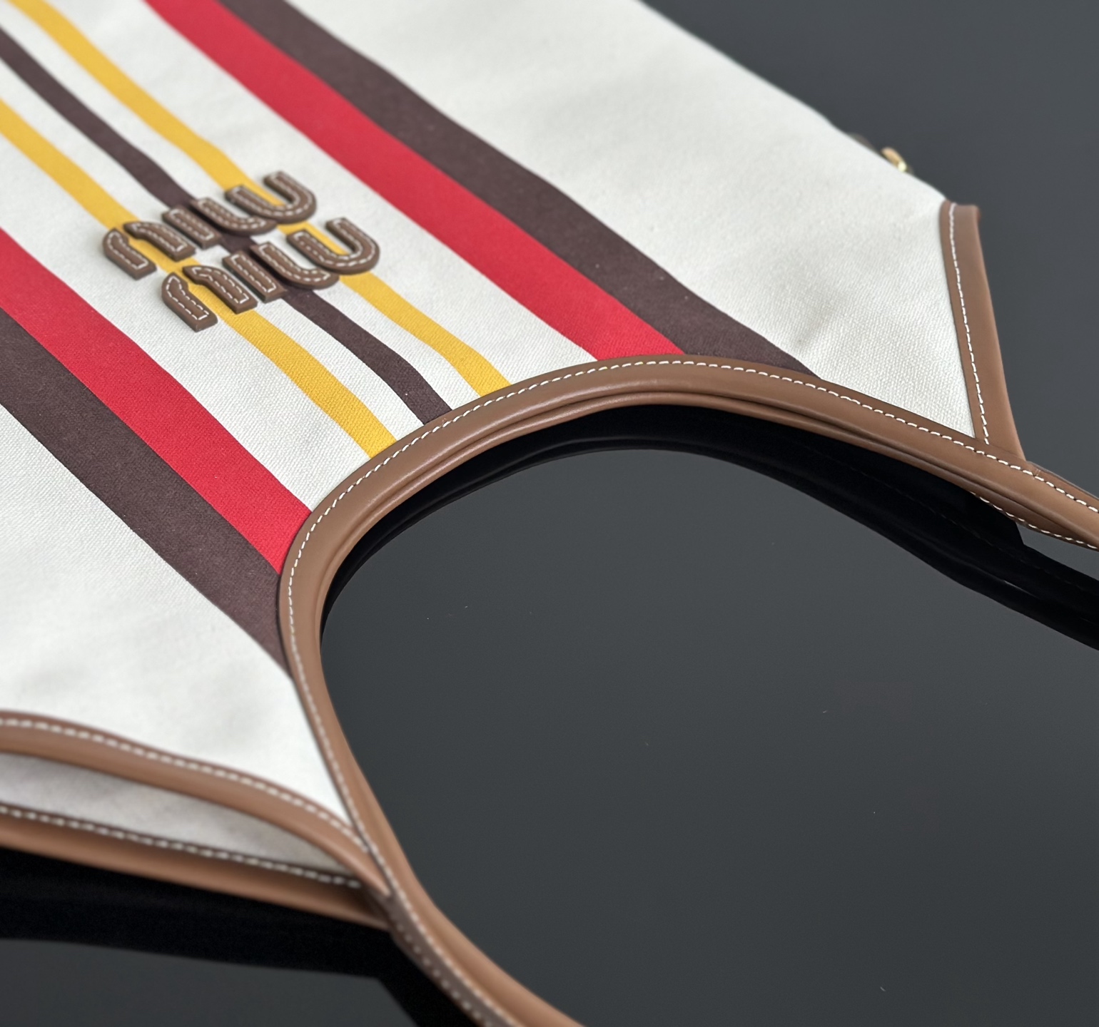 MiuMiu 25最新款条纹帆布Tote包 经典条纹元素搭配品牌标识,风格复古又时尚,辨识度高,轻松在众多包包里脱颖而出,适配多种穿搭场景,从休闲到轻职场都能搭 优质帆布结合皮质包边,帆布耐用、有质感,皮质提升精致度,制作工艺精细,缝线、包边等细节处理到位,保证包包品质与使用寿命