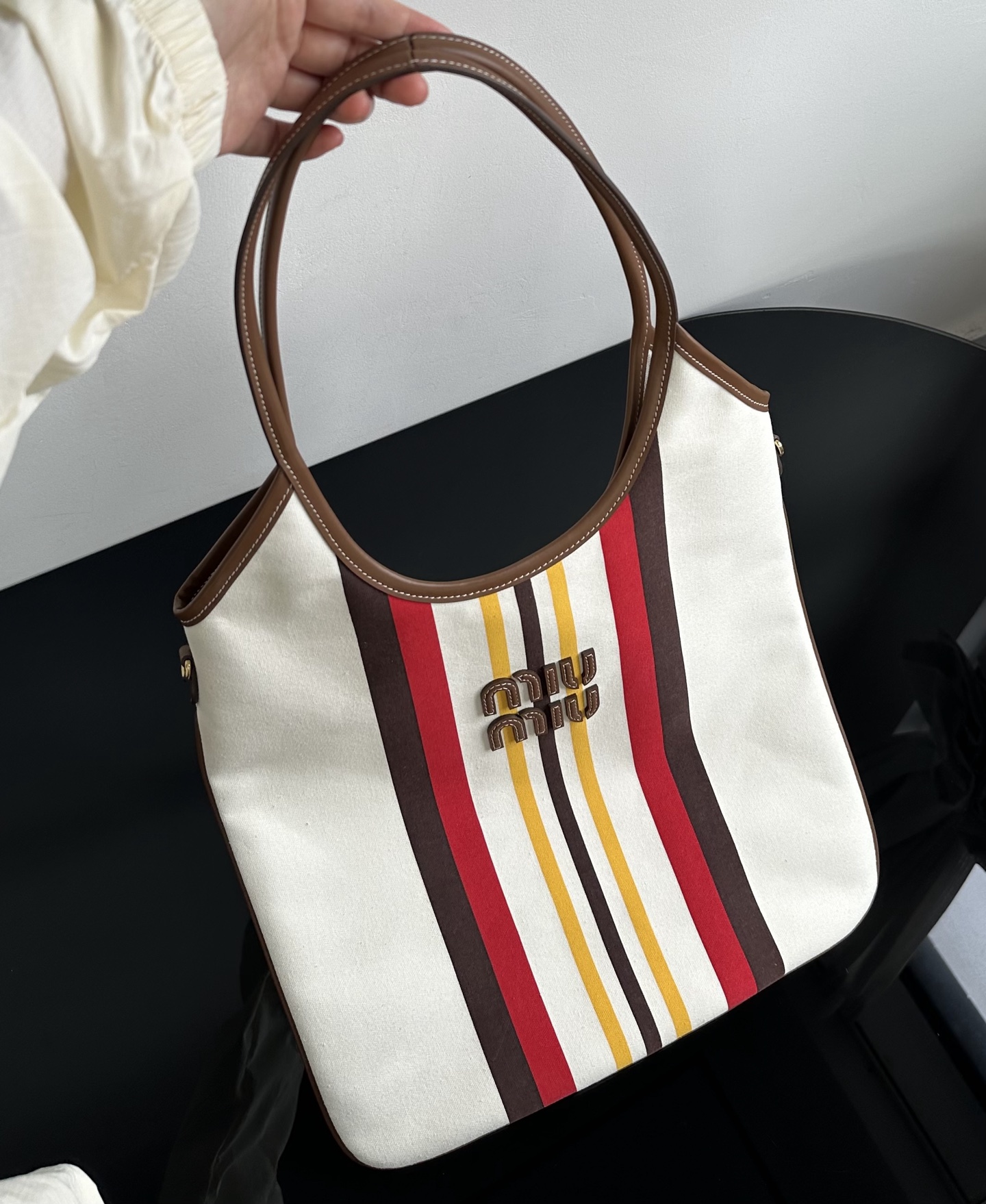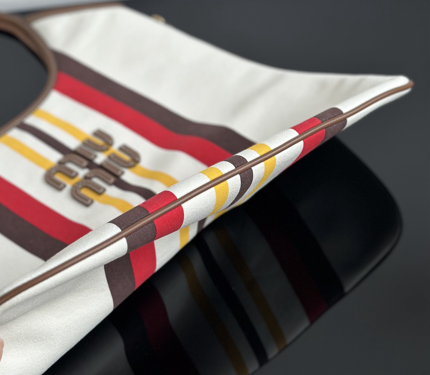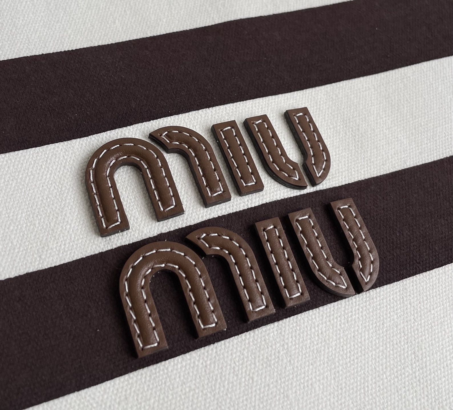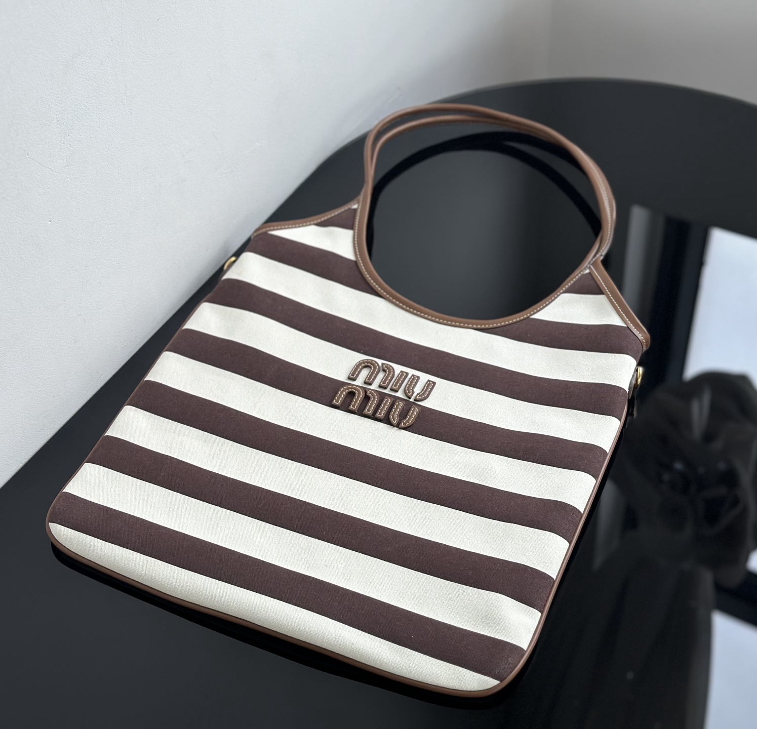 MiuMiu 25最新款条纹帆布Tote包 经典条纹元素搭配品牌标识,风格复古又时尚,辨识度高,轻松在众多包包里脱颖而出,适配多种穿搭场景,从休闲到轻职场都能搭 优质帆布结合皮质包边,帆布耐用、有质感,皮质提升精致度,制作工艺精细,缝线、包边等细节处理到位,保证包包品质与使用寿命
