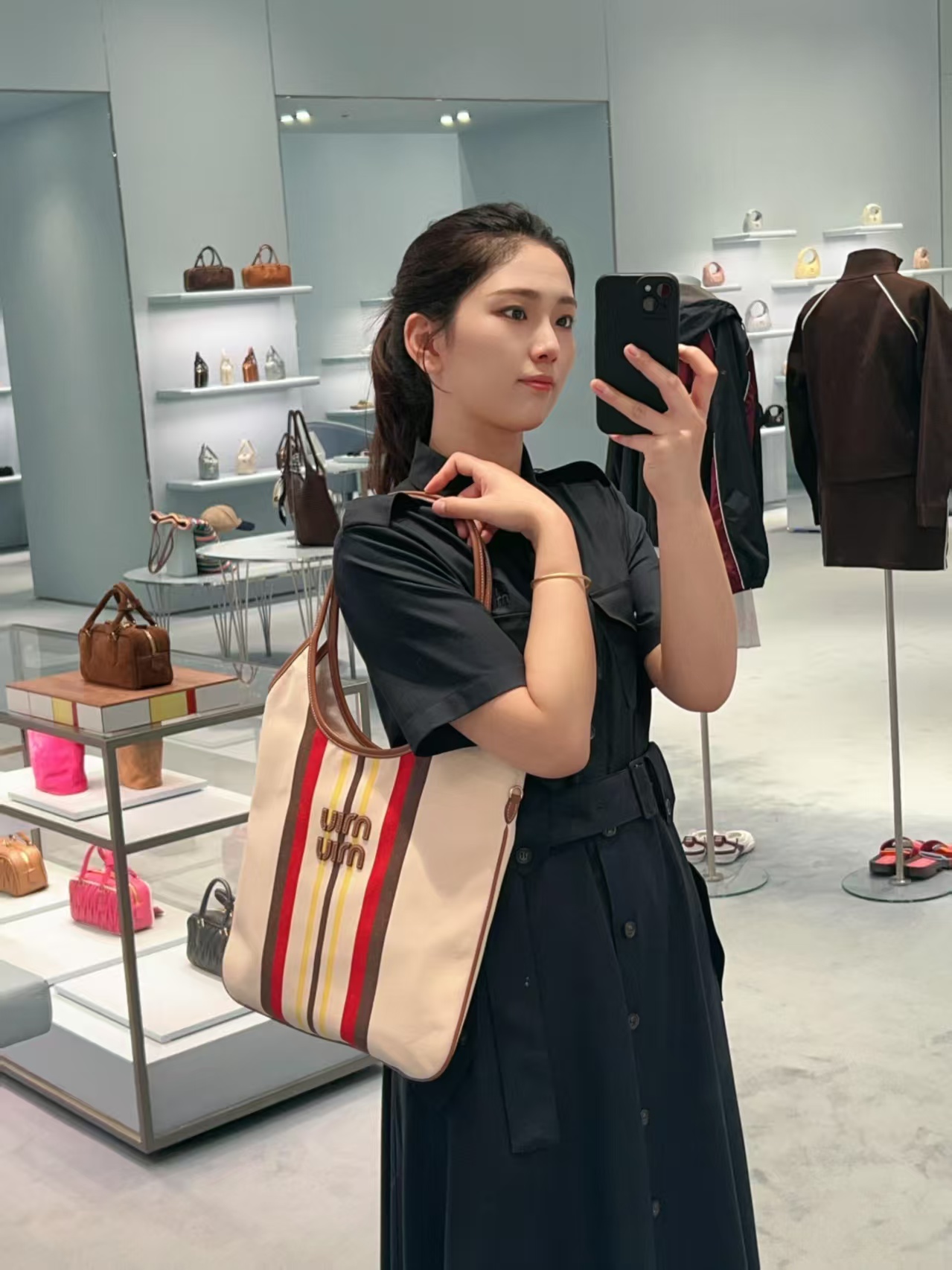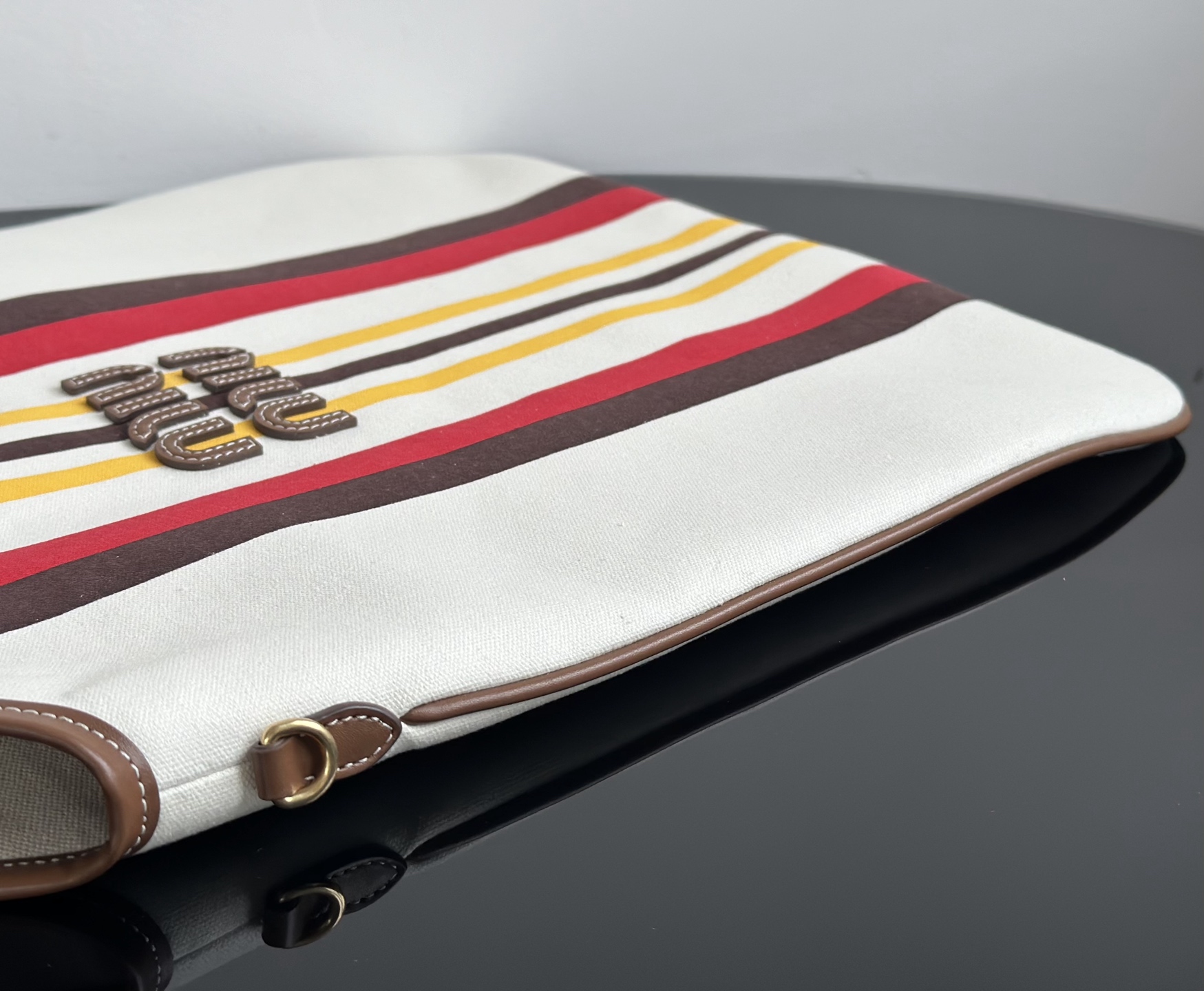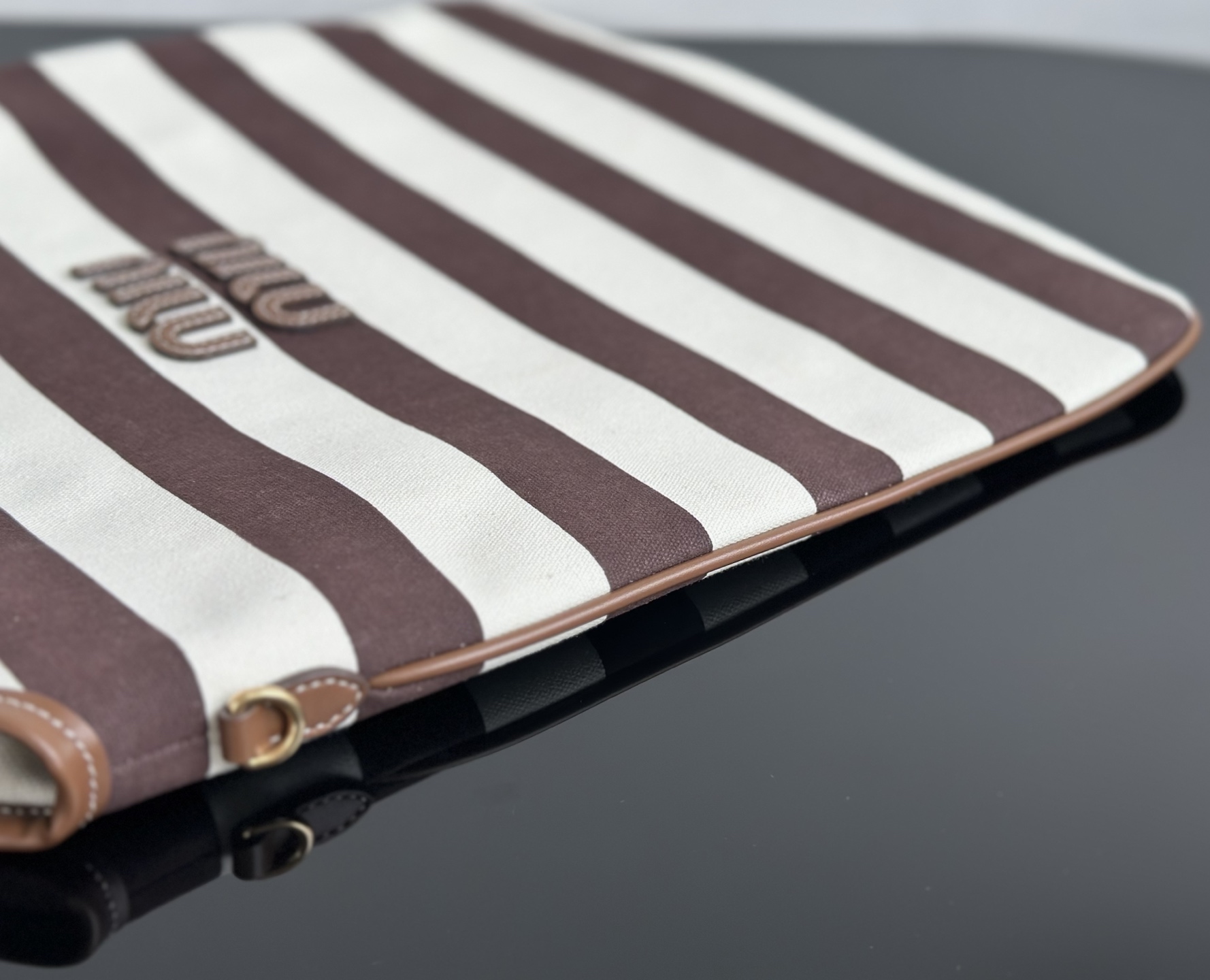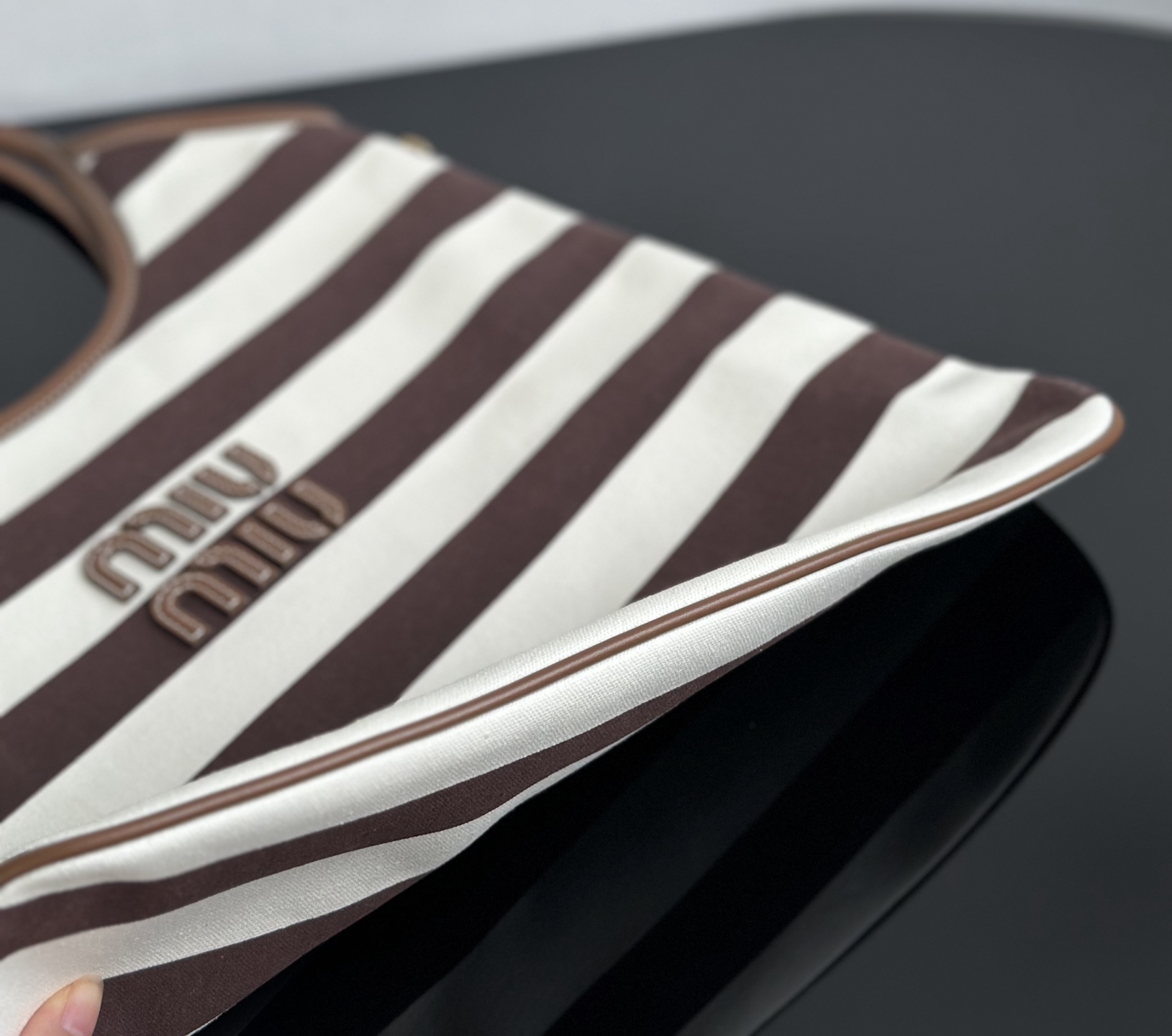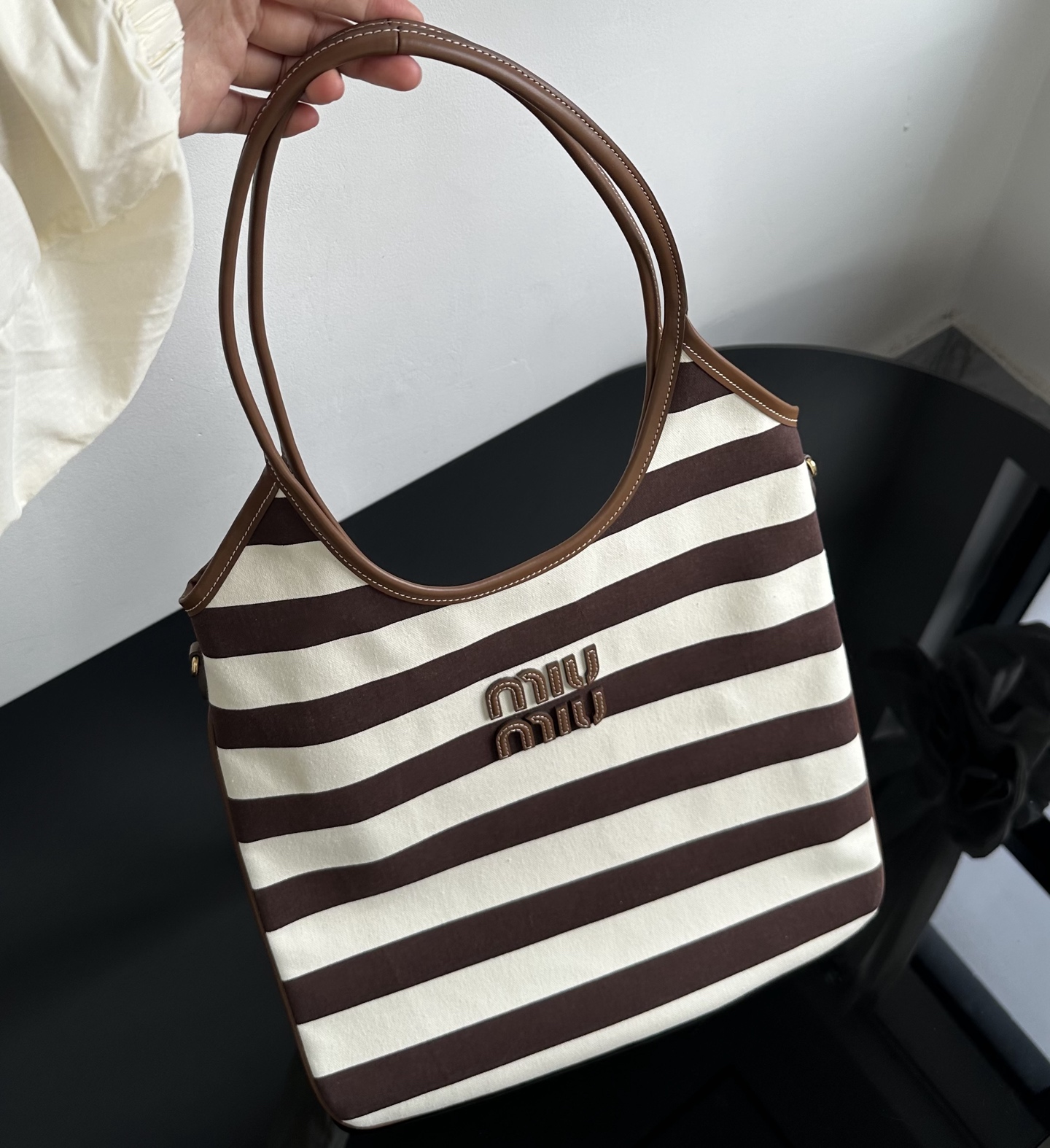 MiuMiu 25最新款条纹帆布Tote包 经典条纹元素搭配品牌标识,风格复古又时尚,辨识度高,轻松在众多包包里脱颖而出,适配多种穿搭场景,从休闲到轻职场都能搭 优质帆布结合皮质包边,帆布耐用、有质感,皮质提升精致度,制作工艺精细,缝线、包边等细节处理到位,保证包包品质与使用寿命