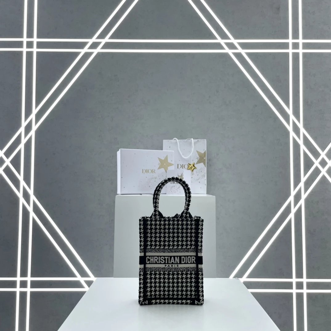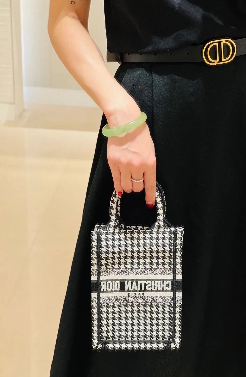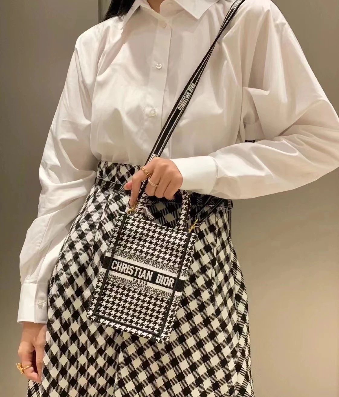 这款手机袋由玛丽亚·嘉茜娅·蔻丽 (Maria Grazia Chiuri) 设计,丰富了 Book Tote 系列,充分彰显 D1or 的精湛工艺。通体饰以黑色和白色超迷你千鸟格纹图案刺绣,正面饰以“CHRISTIAN D1OR PARIS”标志提升格调。迷你款式,可收纳手机和小件日常用品。摩登时尚,搭配可调节、可拆卸的刺绣肩带,可手提、肩背或斜挎