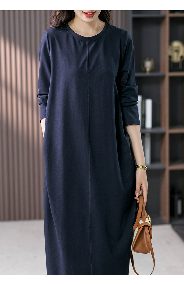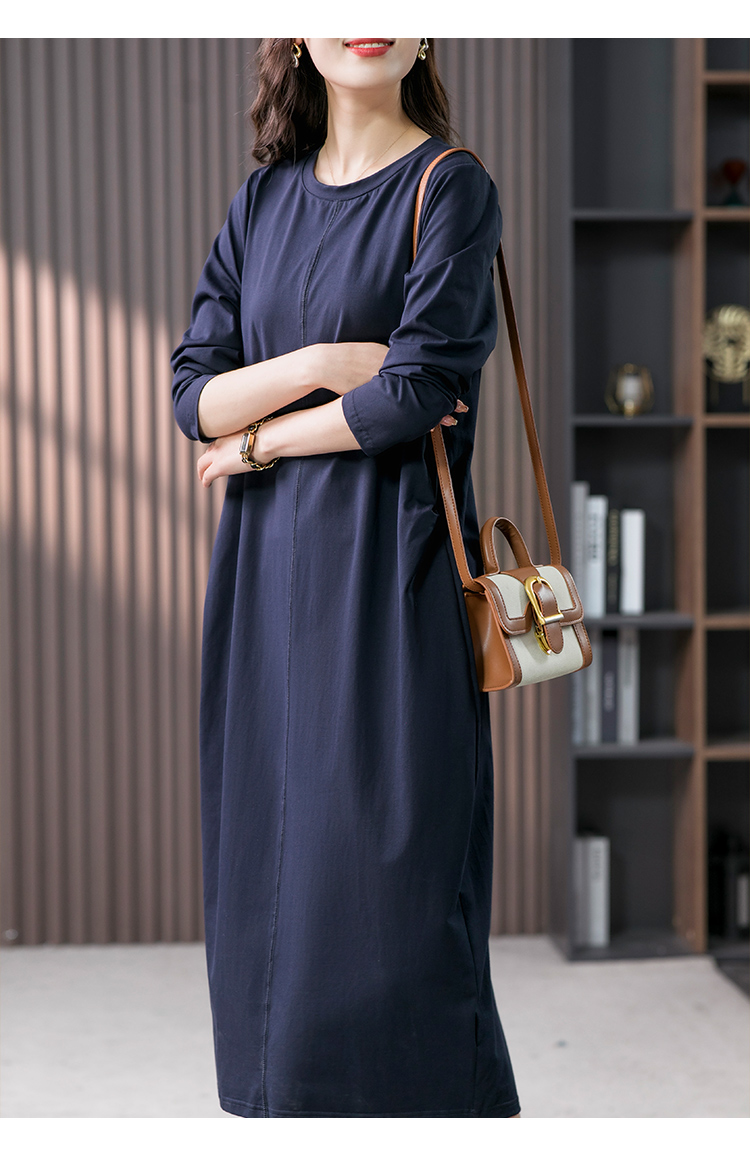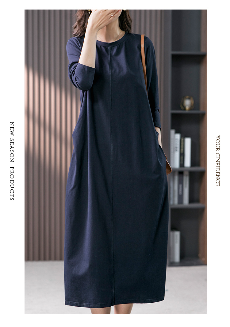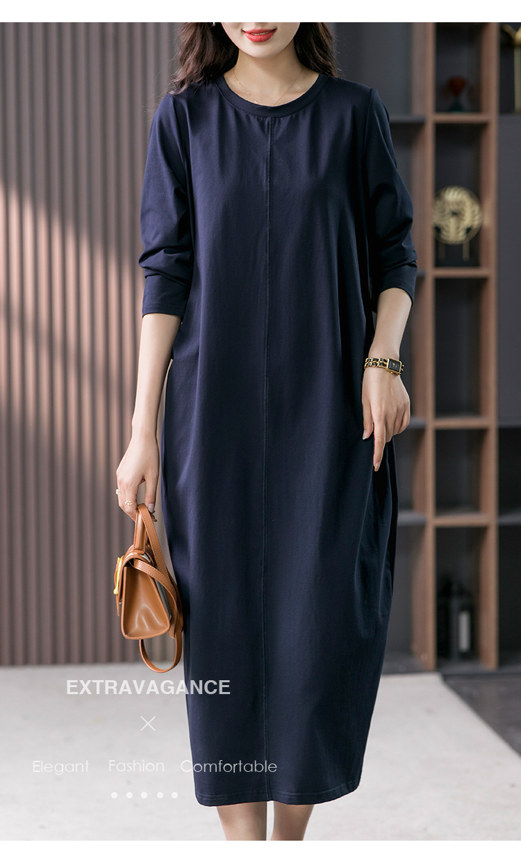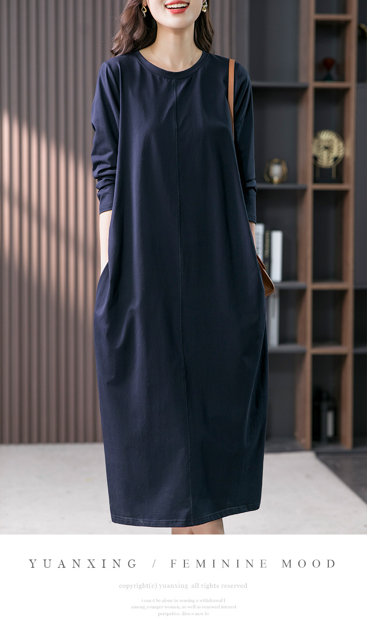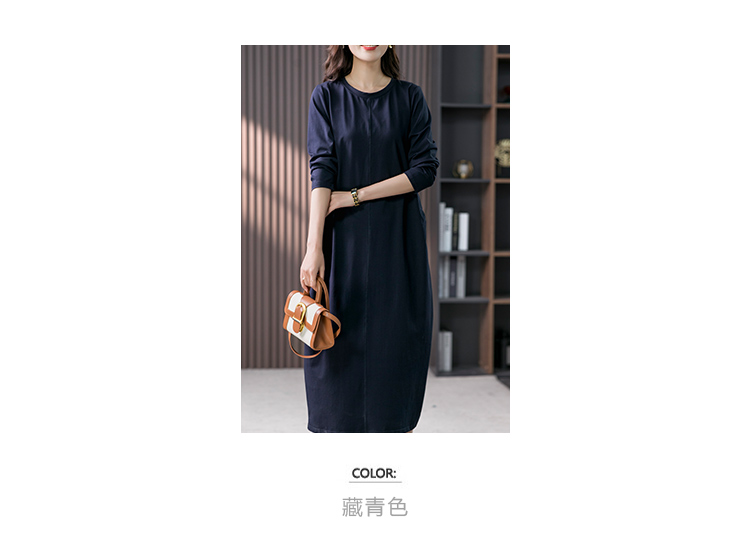 87824原形宽松显瘦连衣裙女长袖2024春季新款韩版高级感圆领直筒长裙子