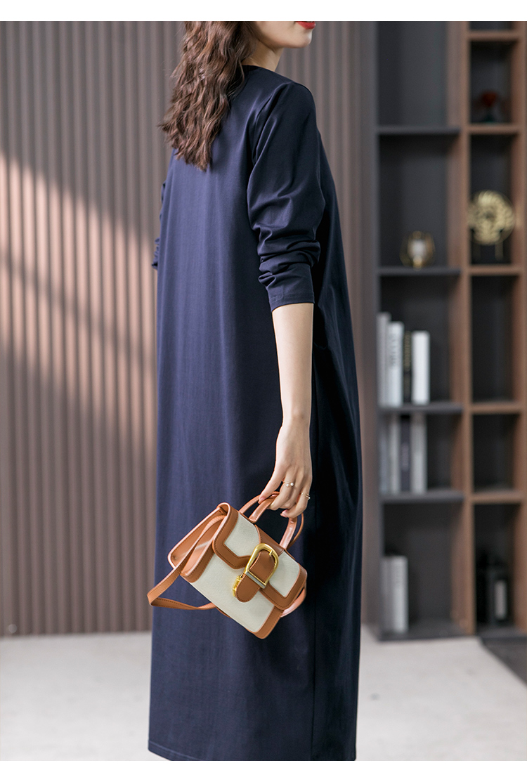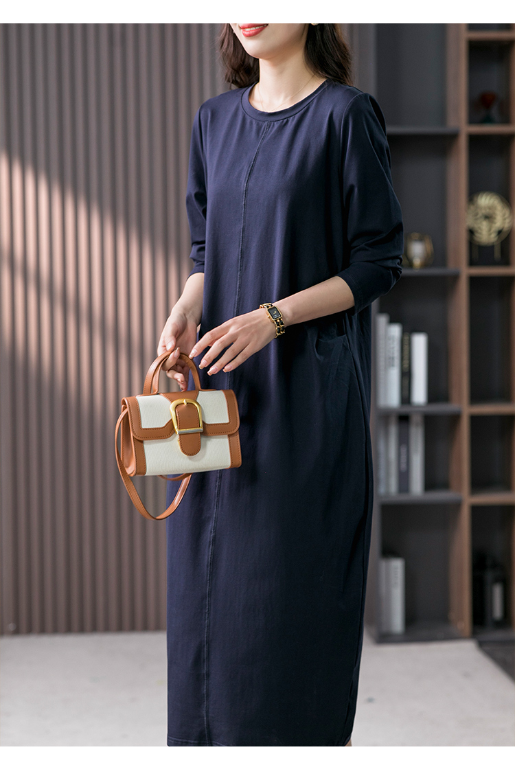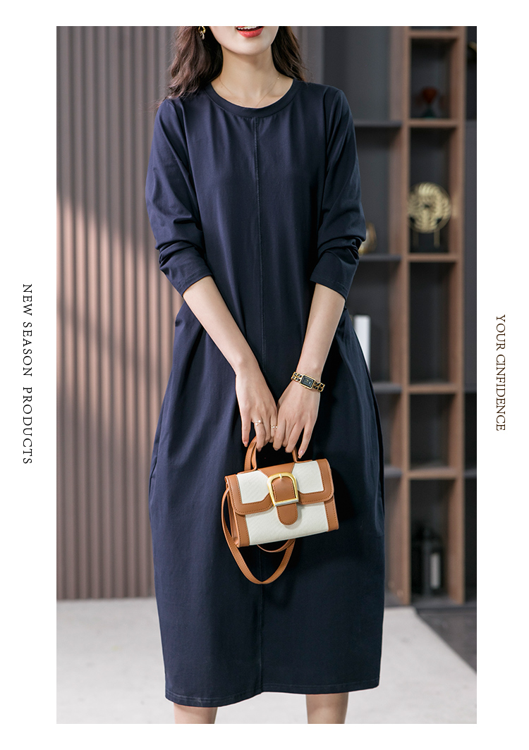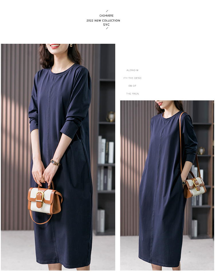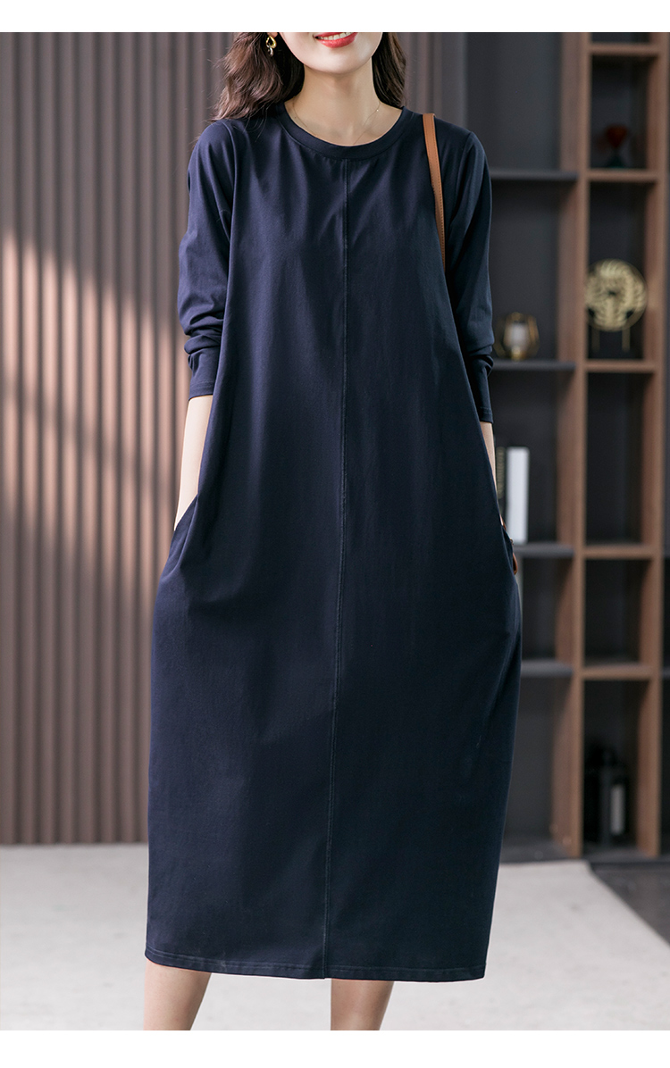 87824原形宽松显瘦连衣裙女长袖2024春季新款韩版高级感圆领直筒长裙子