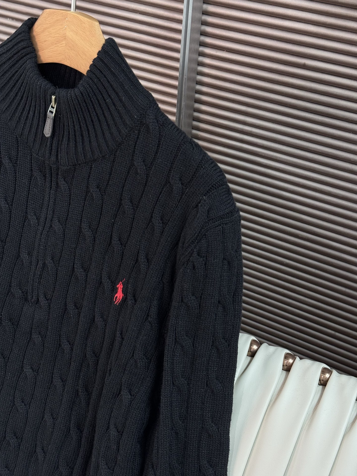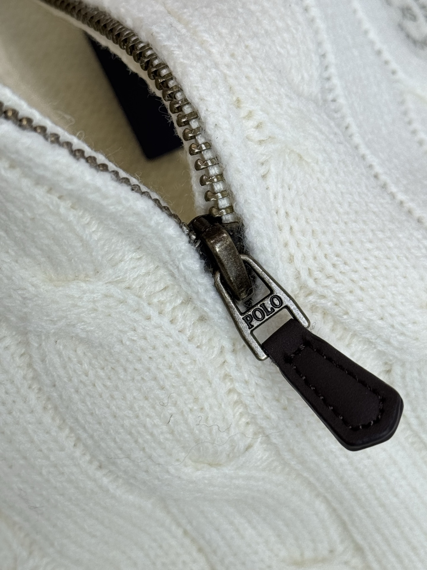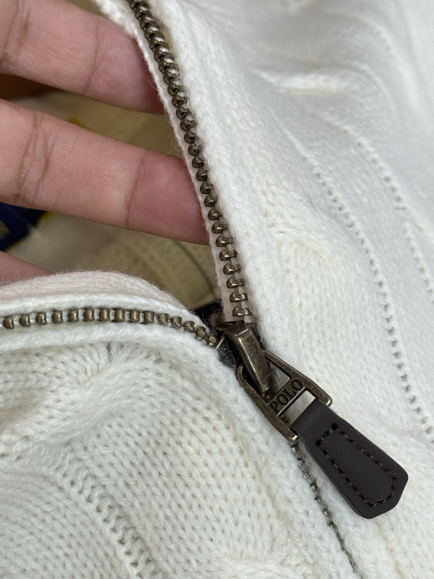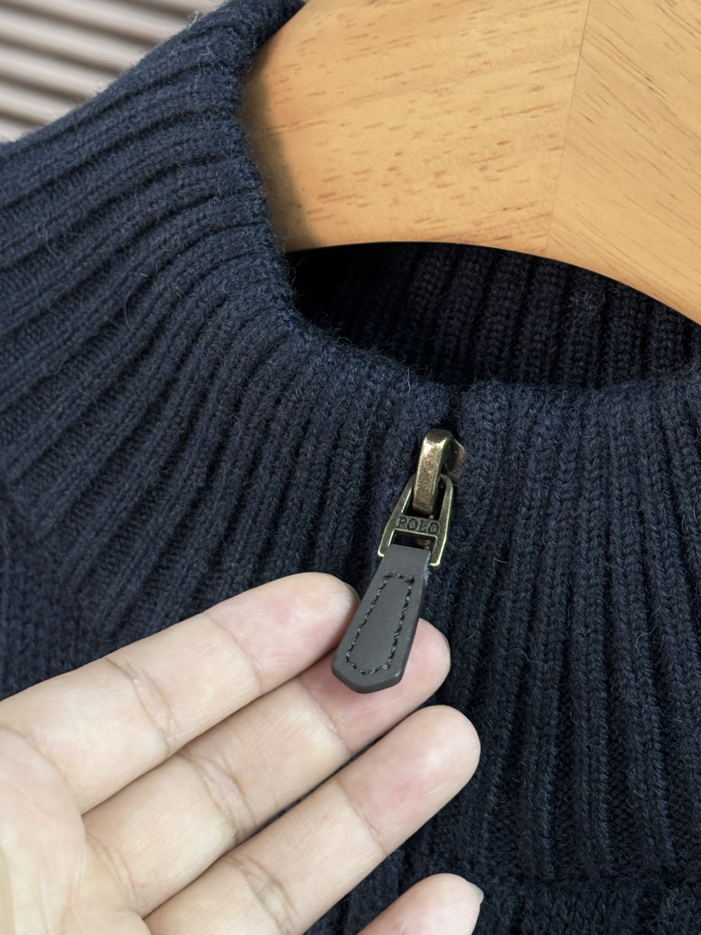 拉链拉开时又能营造出不同的穿搭风格,增加层次感。拉链头带有“POLO” 标识,彰显品牌特色。拉链质量较好,金属质感的拉链顺滑耐用,且与毛衣整体风格相协调。