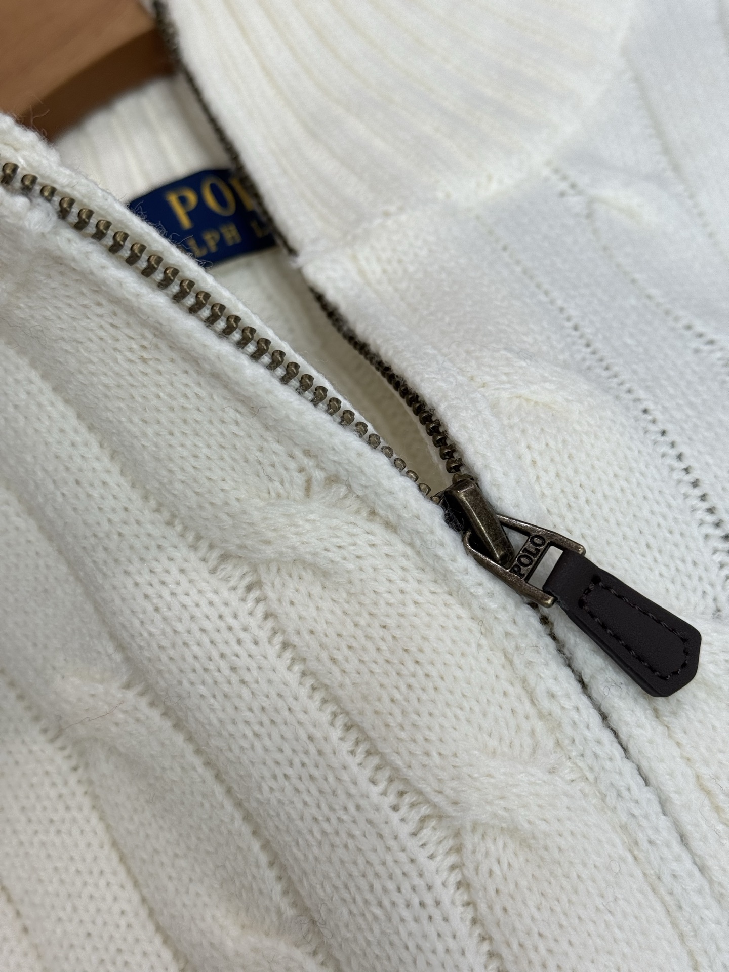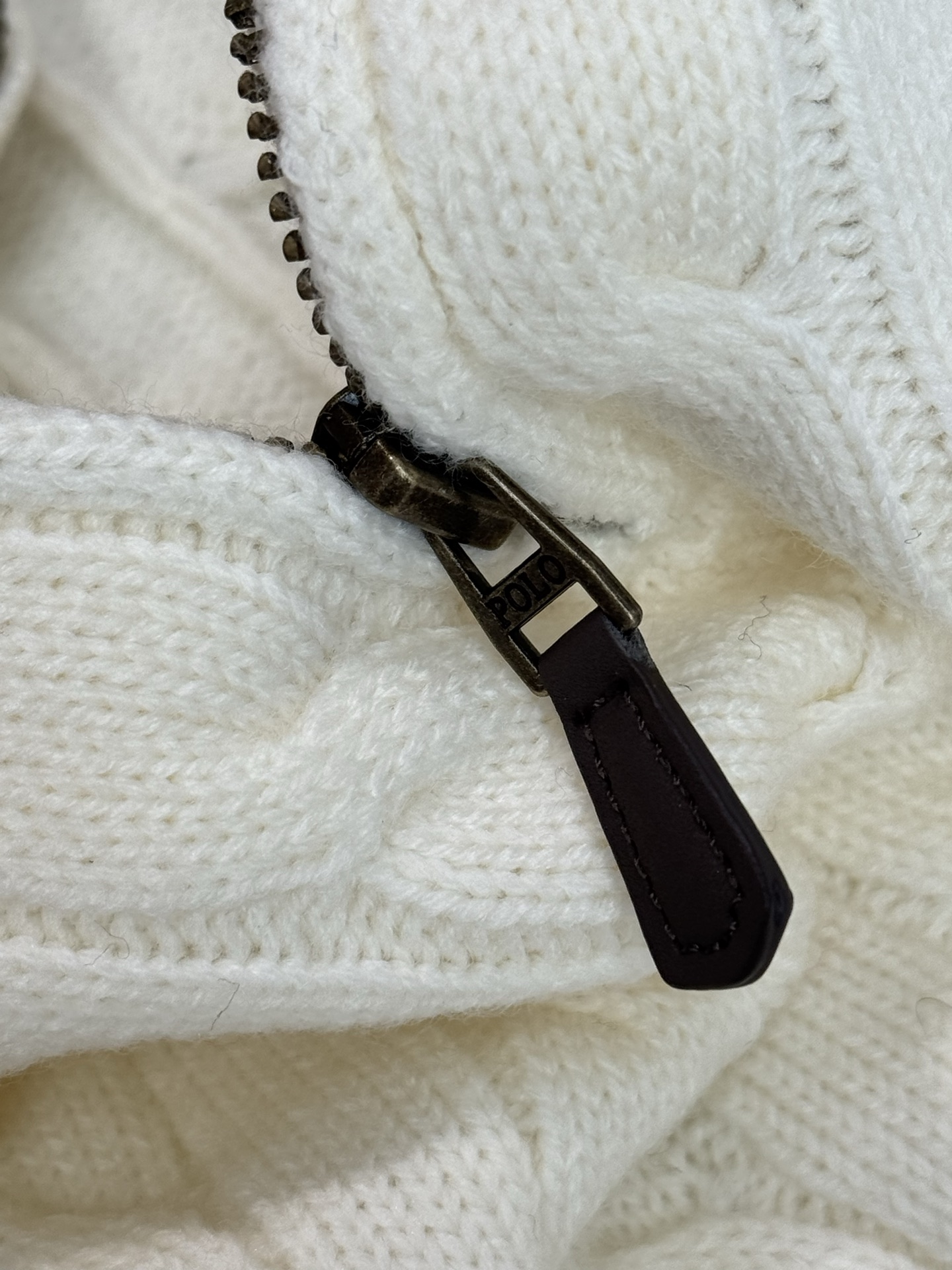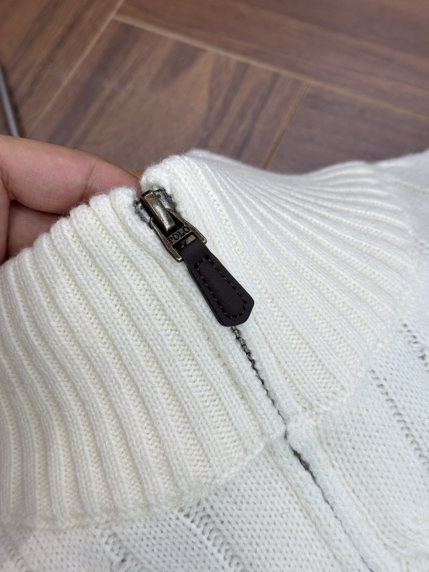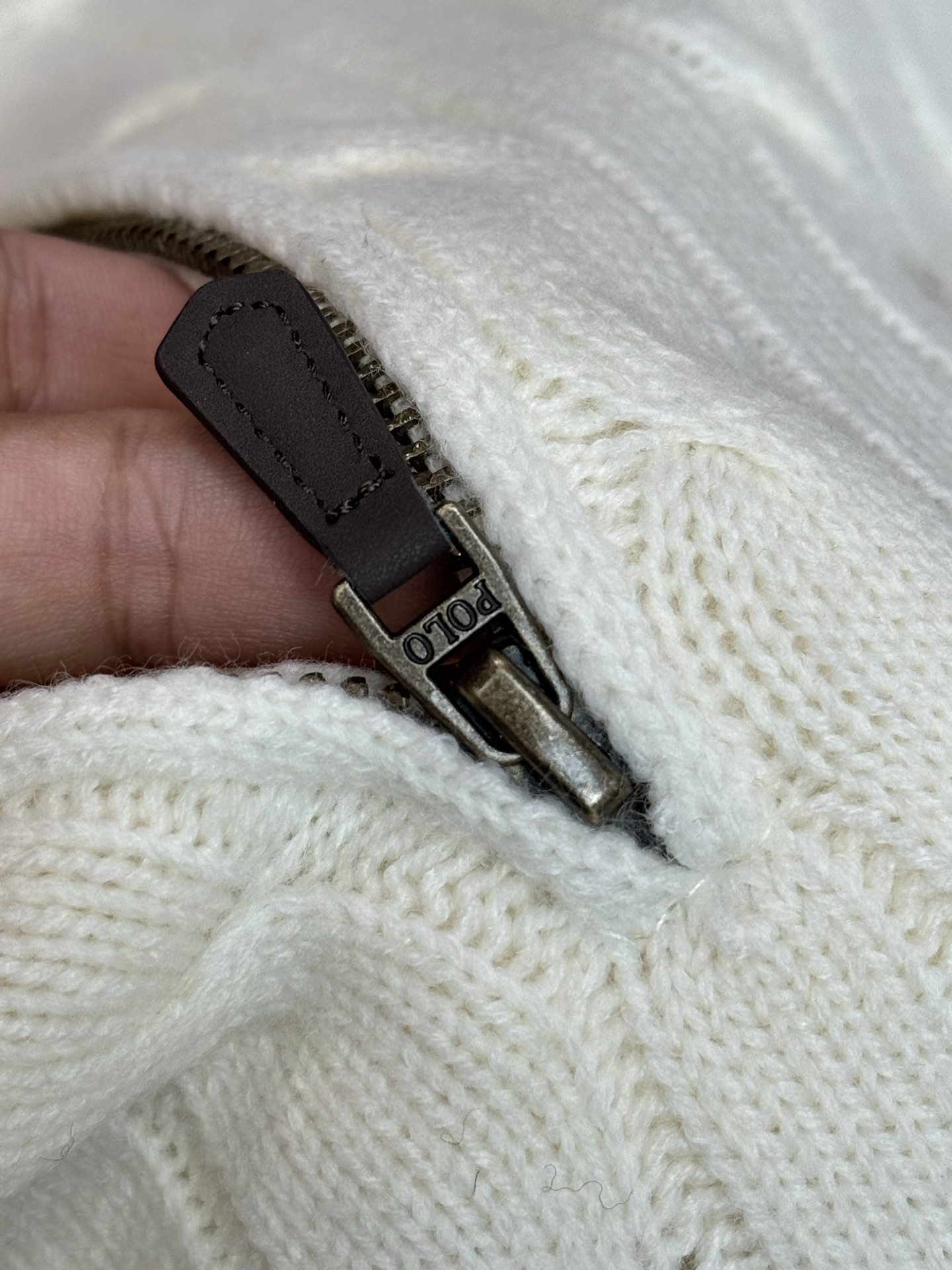 拉链拉开时又能营造出不同的穿搭风格,增加层次感。拉链头带有“POLO” 标识,彰显品牌特色。拉链质量较好,金属质感的拉链顺滑耐用,且与毛衣整体风格相协调。