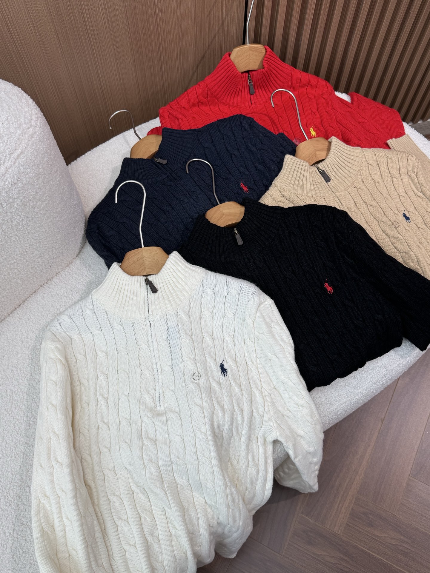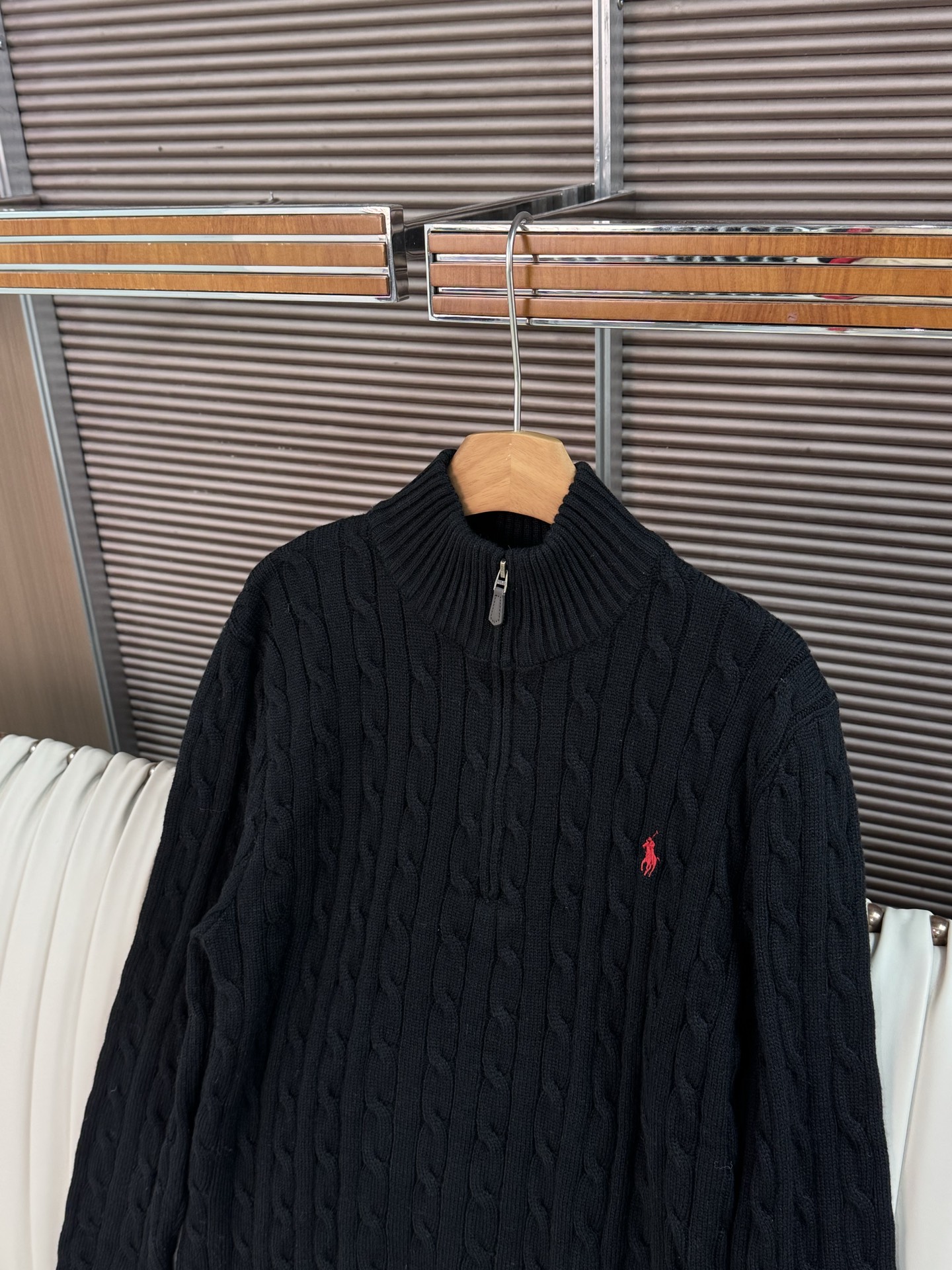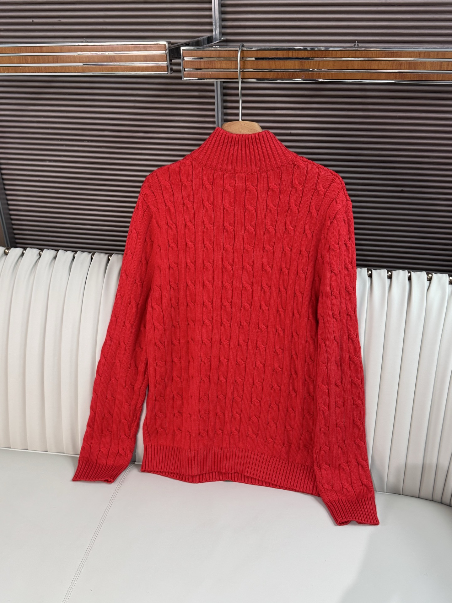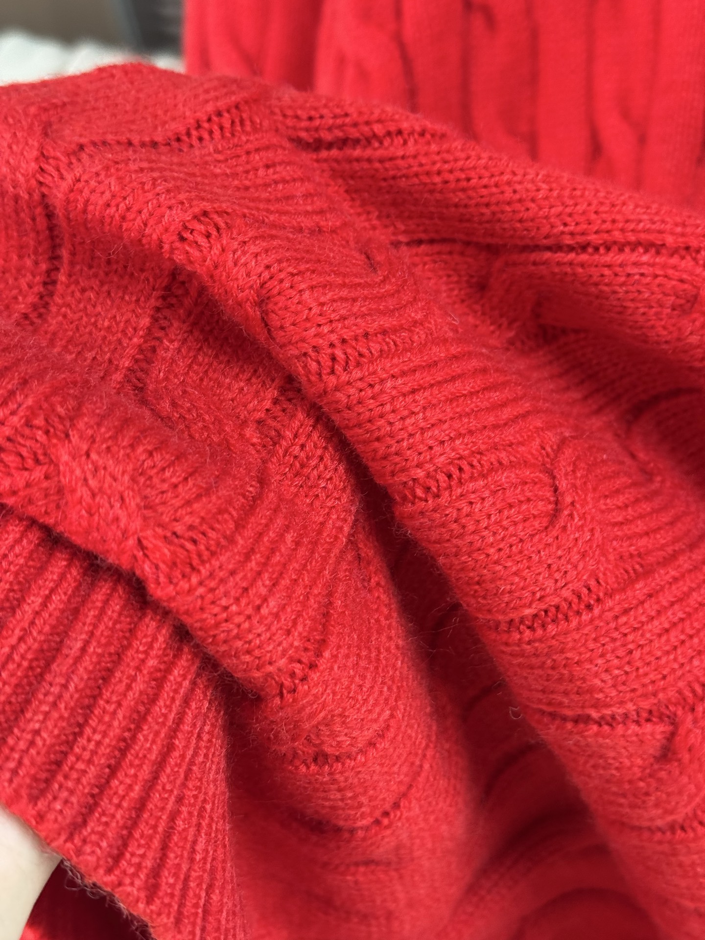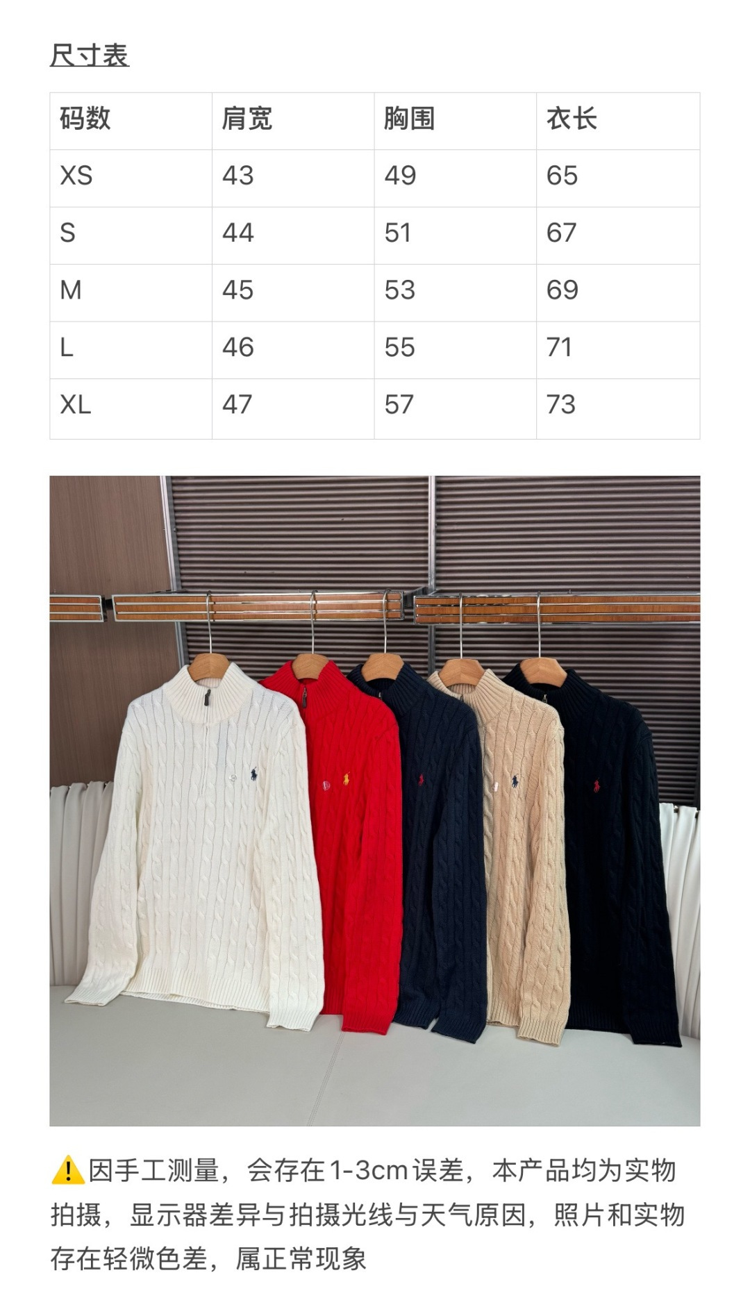 Ralph Lauren/拉夫劳伦 情侣款经典款绞花编结羊绒针织毛衫 90羊毛10山羊绒 直筒版型,能够修身利落的展现穿着者身形,既不会过于紧身,也不会显得松垮 。 5️⃣个颜色:红色、藏蓝色、卡其色、黑色等多种颜色可供选择,满足不同消费者的喜好和搭配需求。 领口:采用半高领拉链设计,拉链拉合时可以防风保暖,拉链拉开时又能营造出不同的穿搭风格,增加层次感。拉链头带有“POLO” 标识,彰显品牌特色。 标志性logo:在毛衣左胸部位置,有经典的拉夫劳伦小马标刺绣,黑色的小马图案精致立体,是品牌辨识度的象征。 绞花编结:毛衣表面采用绞花编结工艺,呈现出丰富的纹理,增加了视觉上的层次感和立体感,让毛衣更具质感和设计感。 袖口和下摆:袖口和下摆处都采用了罗纹收口设计,贴合手腕和腰部,不易变形,保暖的同时也能保持良好的版型。 拉链质量较好,金属质感的拉链顺滑耐用,且与毛衣整体风格相协调。 材质成分 这款毛衣主要材质成分为90%羊毛、10%山羊绒 ,兼具羊毛的保暖性和山羊绒的柔软亲肤感,穿着舒适,且具有较好的保暖性能。 Ralph Lauren是美国知名的高端服饰品牌,以其经典美式风格著称,这款毛衣体现了品牌一贯的高品质和经典时尚的设计理念,适合多种场合穿着,无论是日常休闲还是较为正式的商务休闲场合都能轻松驾驭。