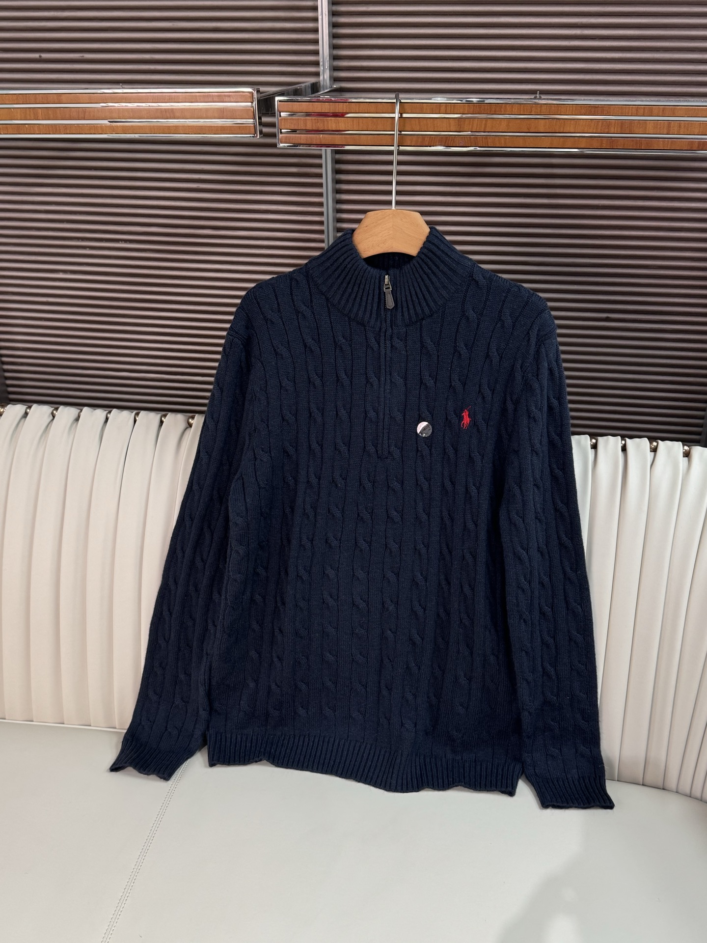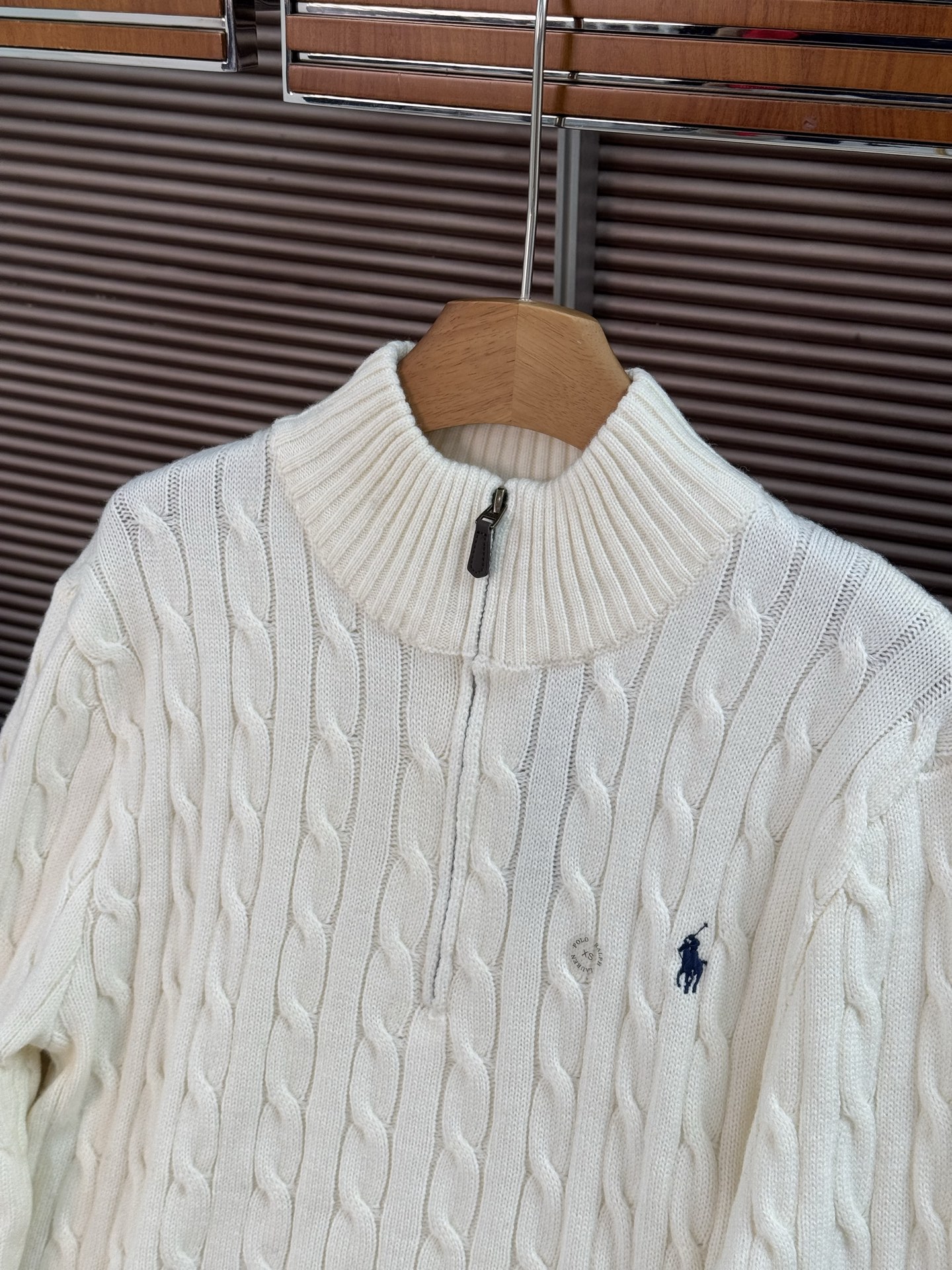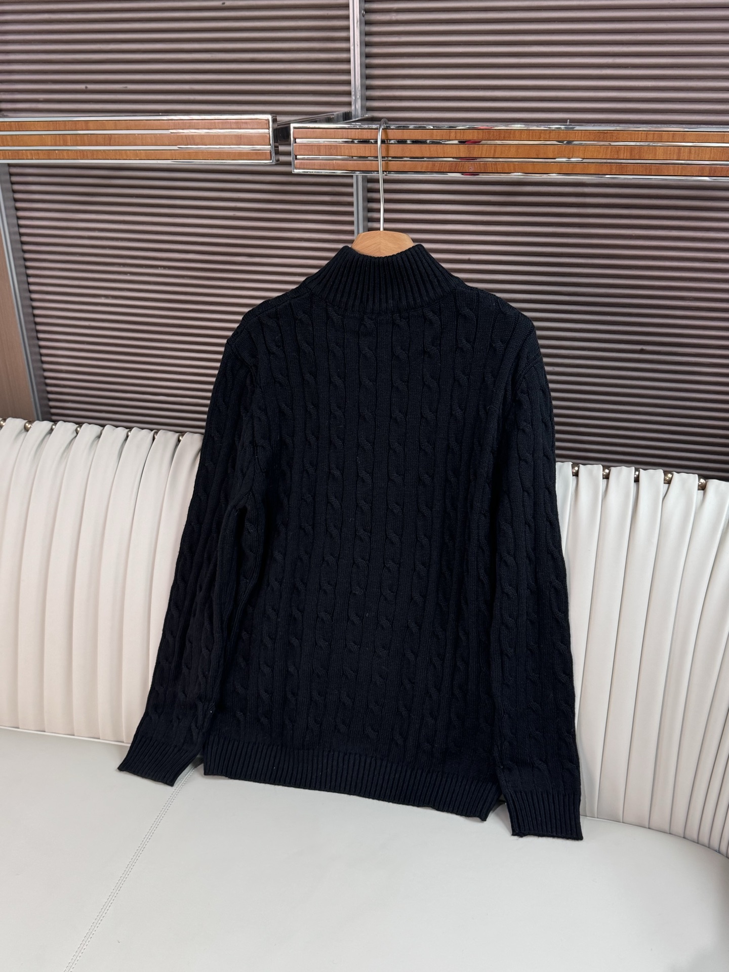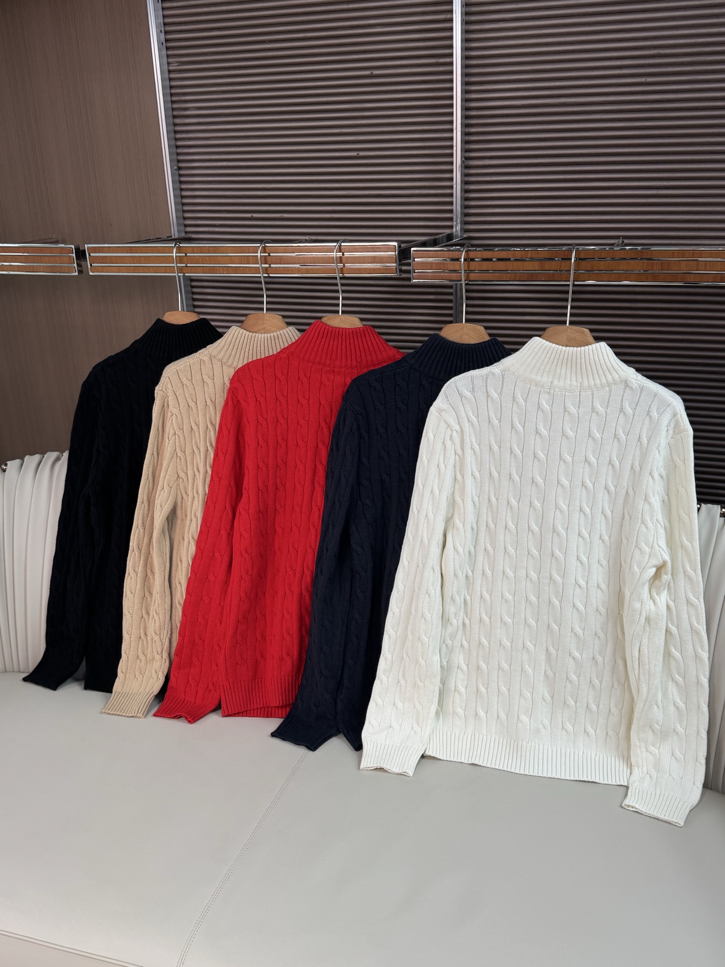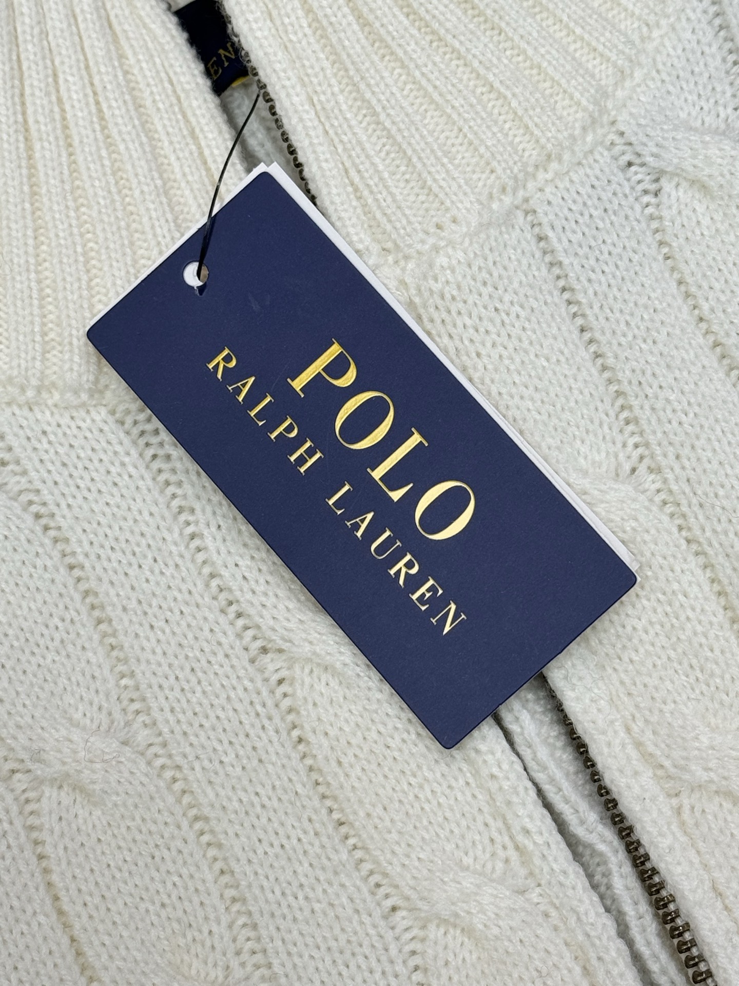 Ralph Lauren/拉夫劳伦 情侣款经典款绞花编结羊绒针织毛衫 90羊毛10山羊绒 直筒版型,能够修身利落的展现穿着者身形,既不会过于紧身,也不会显得松垮 。 5️⃣个颜色:红色、藏蓝色、卡其色、黑色等多种颜色可供选择,满足不同消费者的喜好和搭配需求。 领口:采用半高领拉链设计,拉链拉合时可以防风保暖,拉链拉开时又能营造出不同的穿搭风格,增加层次感。拉链头带有“POLO” 标识,彰显品牌特色。 标志性logo:在毛衣左胸部位置,有经典的拉夫劳伦小马标刺绣,黑色的小马图案精致立体,是品牌辨识度的象征。 绞花编结:毛衣表面采用绞花编结工艺,呈现出丰富的纹理,增加了视觉上的层次感和立体感,让毛衣更具质感和设计感。 袖口和下摆:袖口和下摆处都采用了罗纹收口设计,贴合手腕和腰部,不易变形,保暖的同时也能保持良好的版型。 拉链质量较好,金属质感的拉链顺滑耐用,且与毛衣整体风格相协调。 材质成分 这款毛衣主要材质成分为90%羊毛、10%山羊绒 ,兼具羊毛的保暖性和山羊绒的柔软亲肤感,穿着舒适,且具有较好的保暖性能。 Ralph Lauren是美国知名的高端服饰品牌,以其经典美式风格著称,这款毛衣体现了品牌一贯的高品质和经典时尚的设计理念,适合多种场合穿着,无论是日常休闲还是较为正式的商务休闲场合都能轻松驾驭。