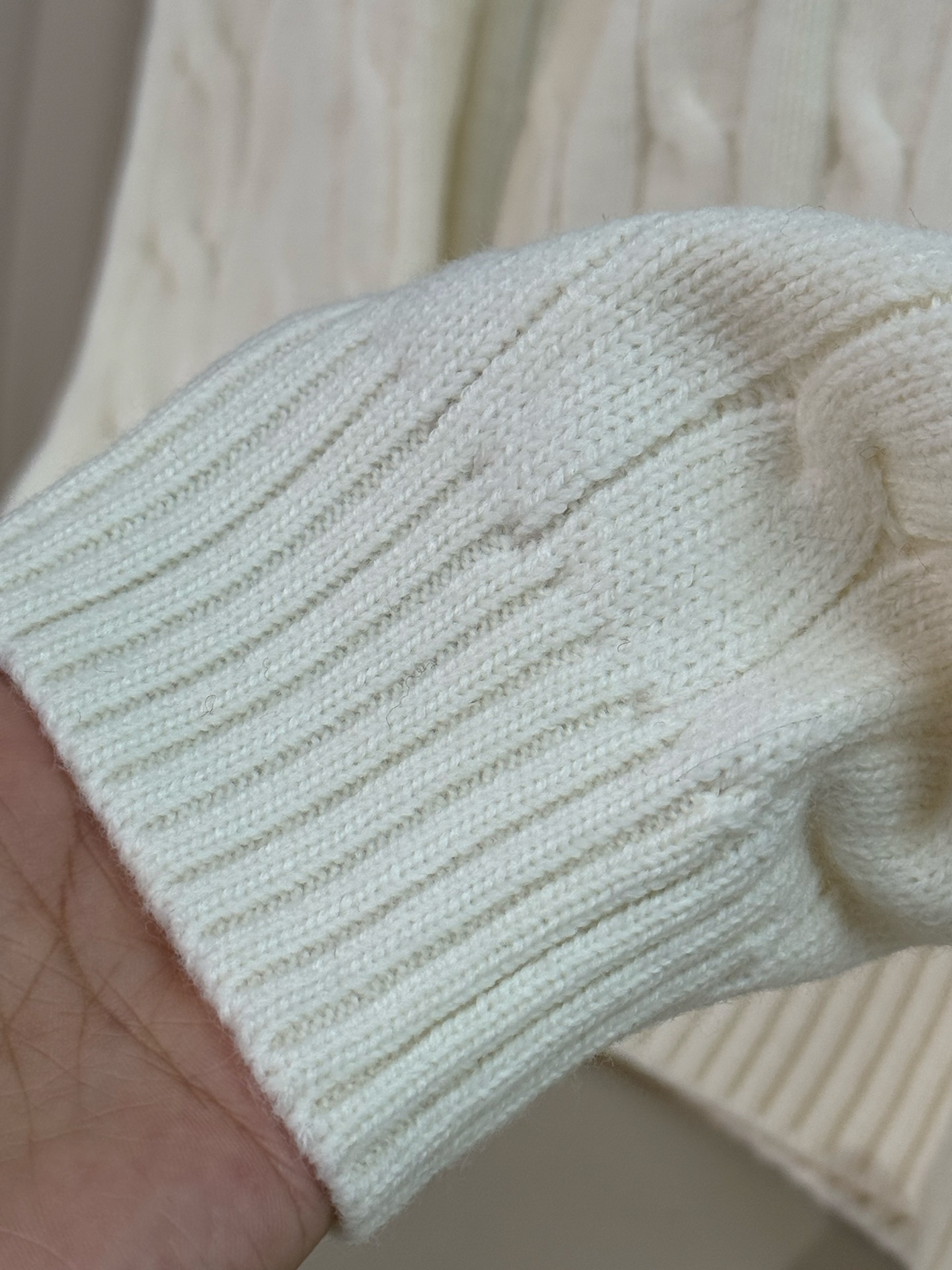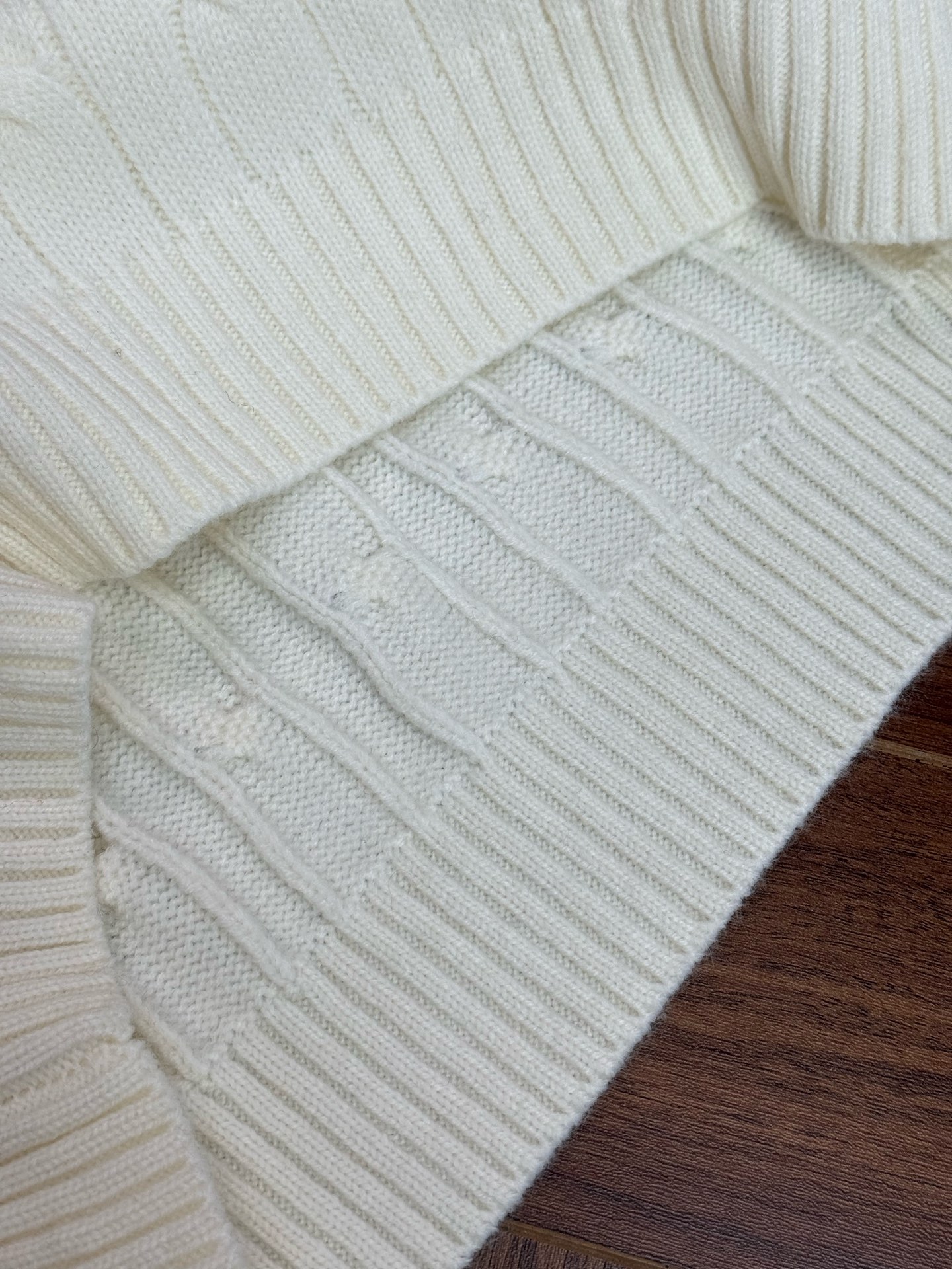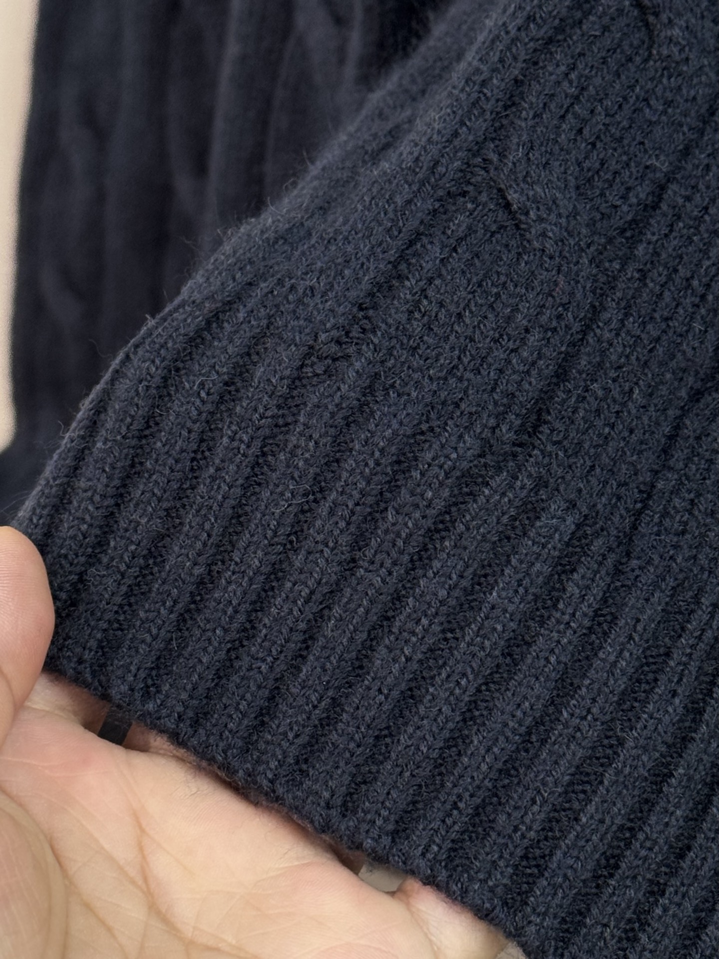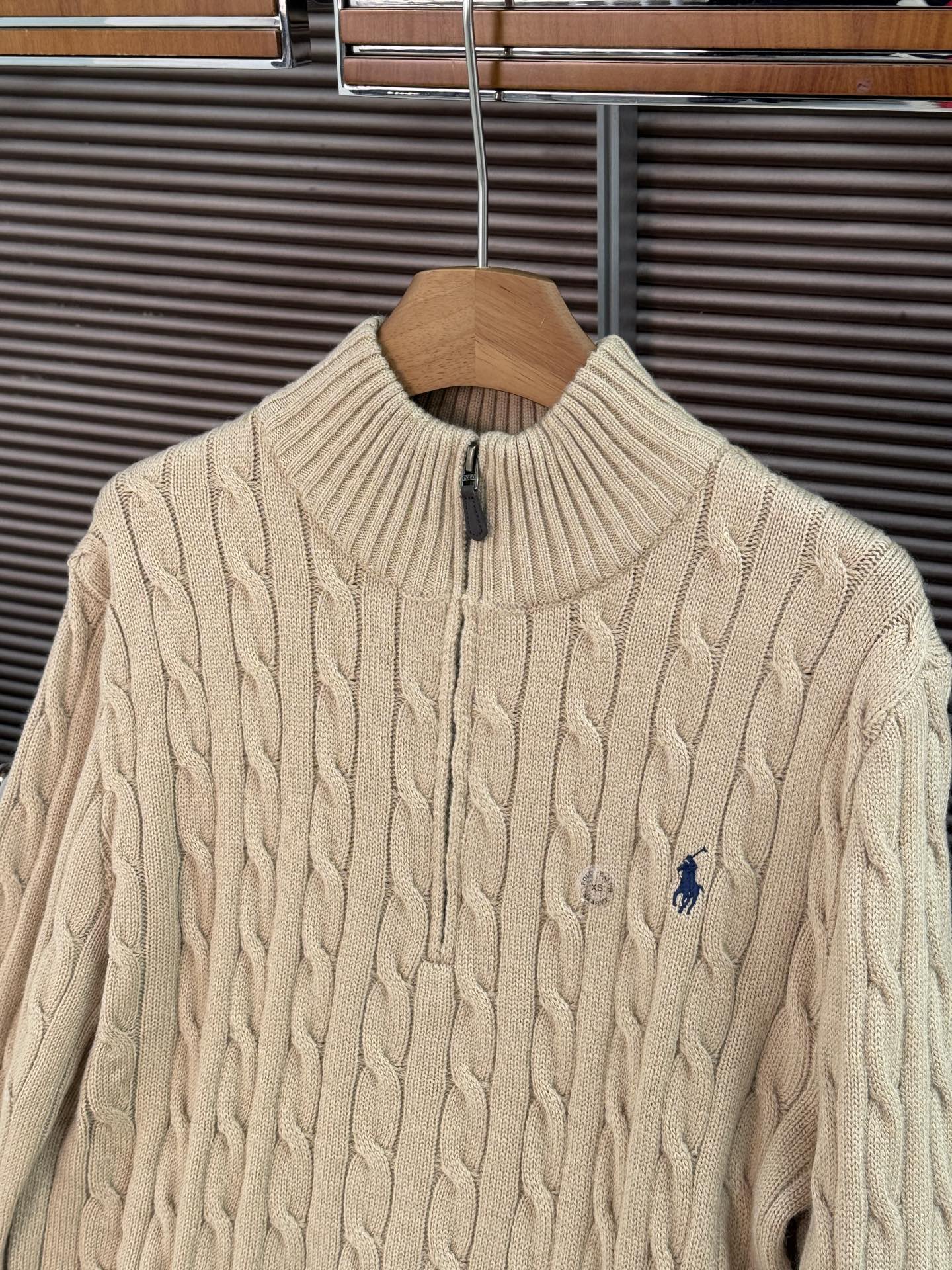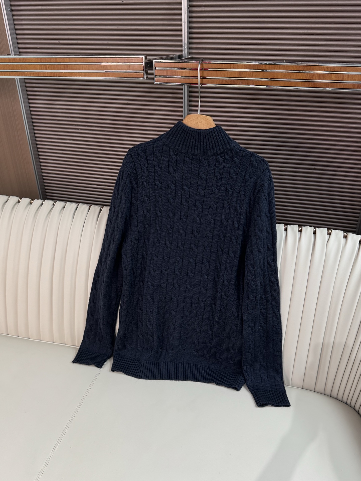 Ralph Lauren/拉夫劳伦 情侣款经典款绞花编结羊绒针织毛衫 90羊毛10山羊绒 直筒版型,能够修身利落的展现穿着者身形,既不会过于紧身,也不会显得松垮 。 5️⃣个颜色:红色、藏蓝色、卡其色、黑色等多种颜色可供选择,满足不同消费者的喜好和搭配需求。 领口:采用半高领拉链设计,拉链拉合时可以防风保暖,拉链拉开时又能营造出不同的穿搭风格,增加层次感。拉链头带有“POLO” 标识,彰显品牌特色。 标志性logo:在毛衣左胸部位置,有经典的拉夫劳伦小马标刺绣,黑色的小马图案精致立体,是品牌辨识度的象征。 绞花编结:毛衣表面采用绞花编结工艺,呈现出丰富的纹理,增加了视觉上的层次感和立体感,让毛衣更具质感和设计感。 袖口和下摆:袖口和下摆处都采用了罗纹收口设计,贴合手腕和腰部,不易变形,保暖的同时也能保持良好的版型。 拉链质量较好,金属质感的拉链顺滑耐用,且与毛衣整体风格相协调。 材质成分 这款毛衣主要材质成分为90%羊毛、10%山羊绒 ,兼具羊毛的保暖性和山羊绒的柔软亲肤感,穿着舒适,且具有较好的保暖性能。 Ralph Lauren是美国知名的高端服饰品牌,以其经典美式风格著称,这款毛衣体现了品牌一贯的高品质和经典时尚的设计理念,适合多种场合穿着,无论是日常休闲还是较为正式的商务休闲场合都能轻松驾驭。