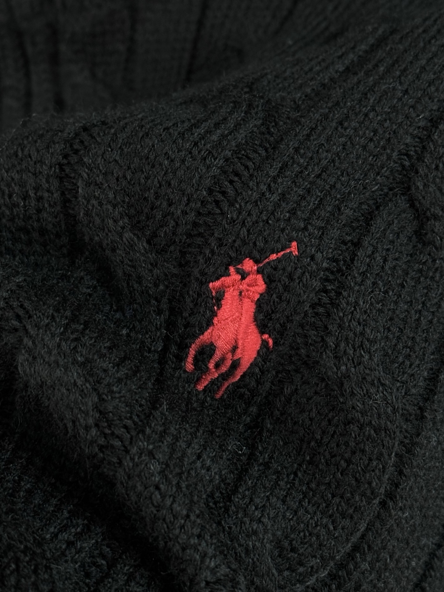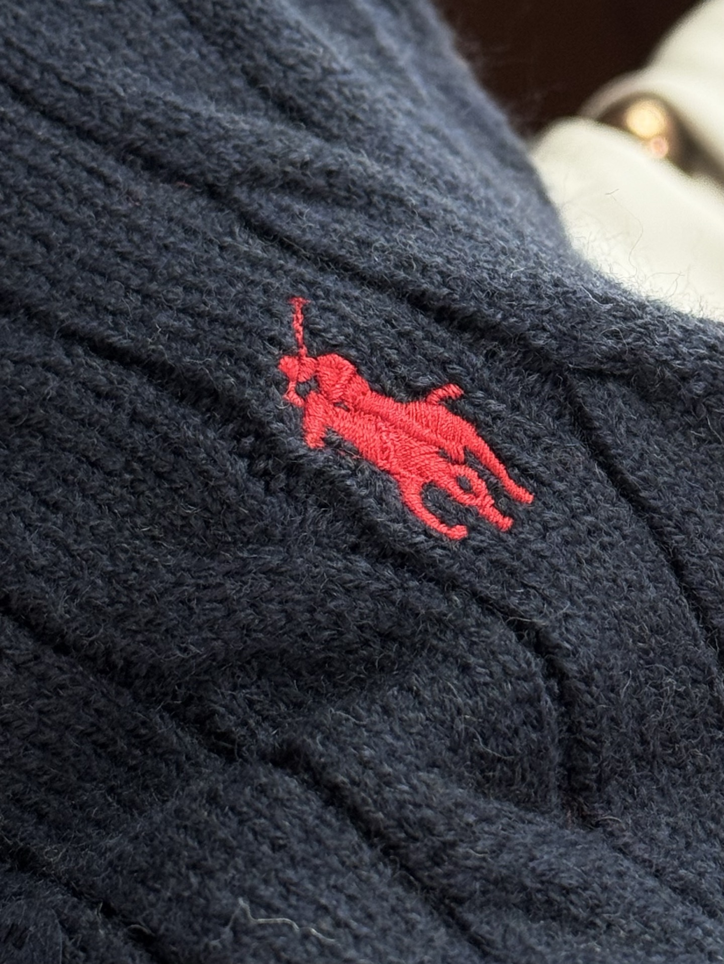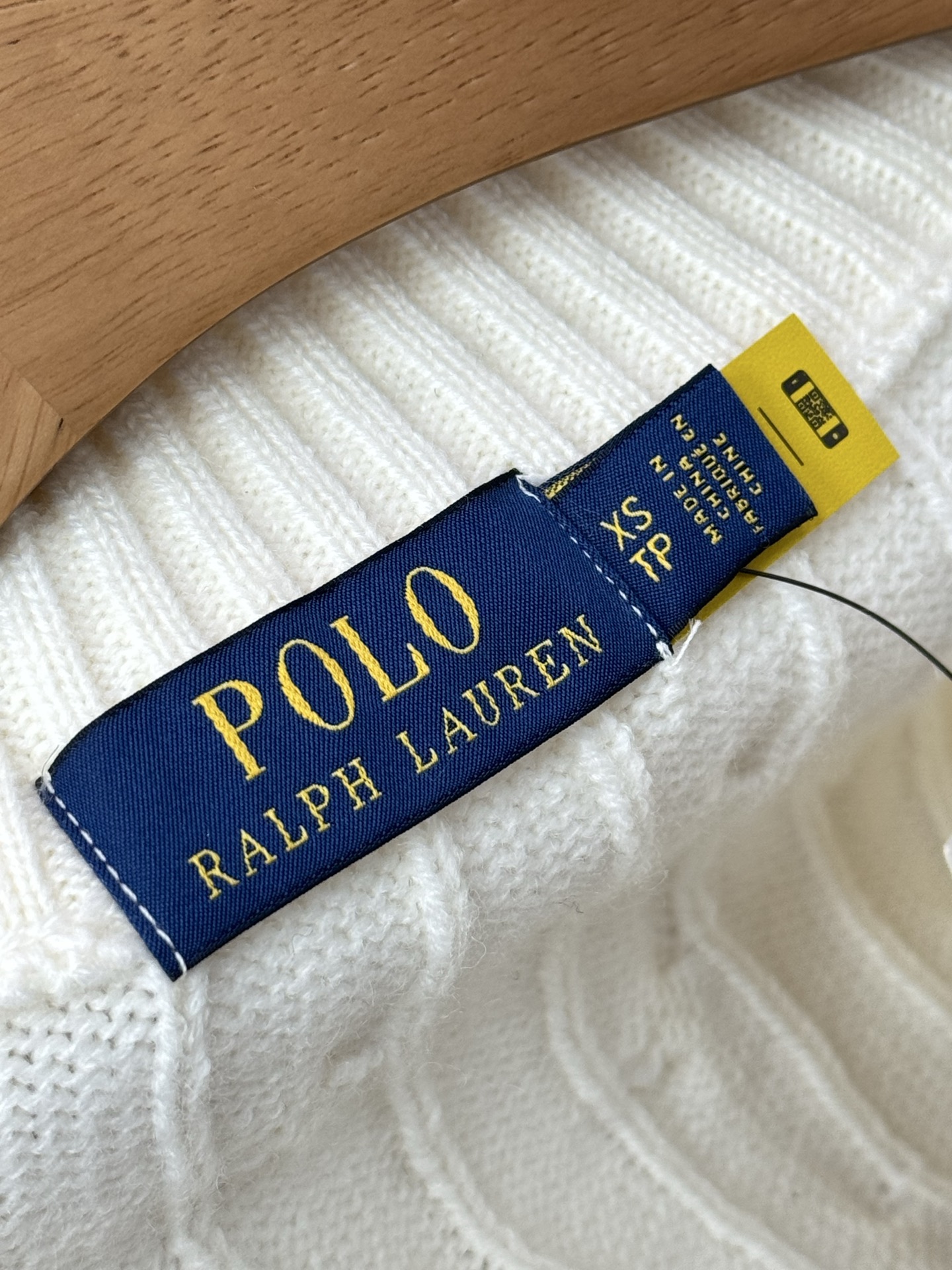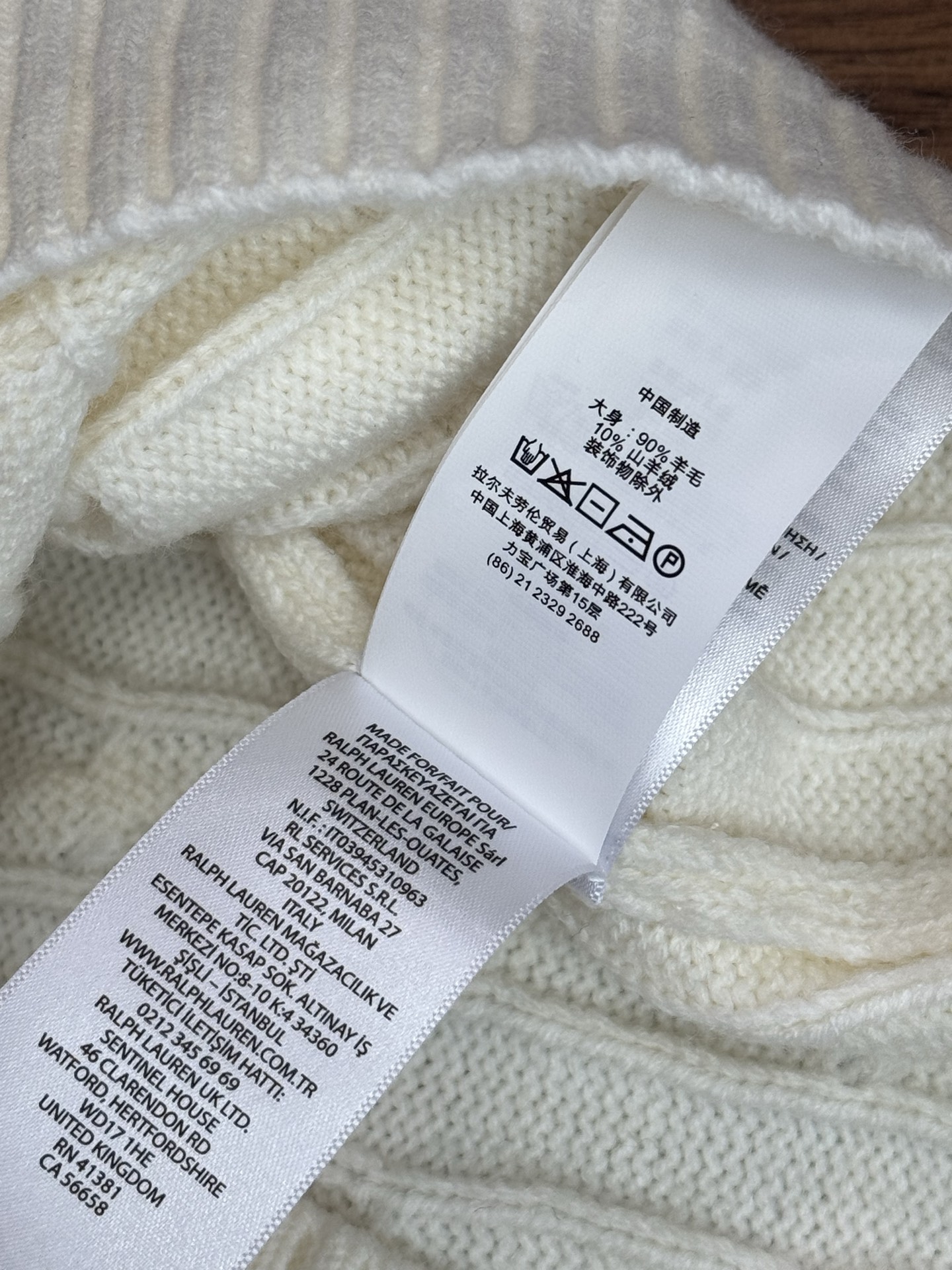 标志性logo:在毛衣左胸部位置,有经典的拉夫劳伦小马标刺绣,黑色的小马图案精致立体,是品牌辨识度的象征。