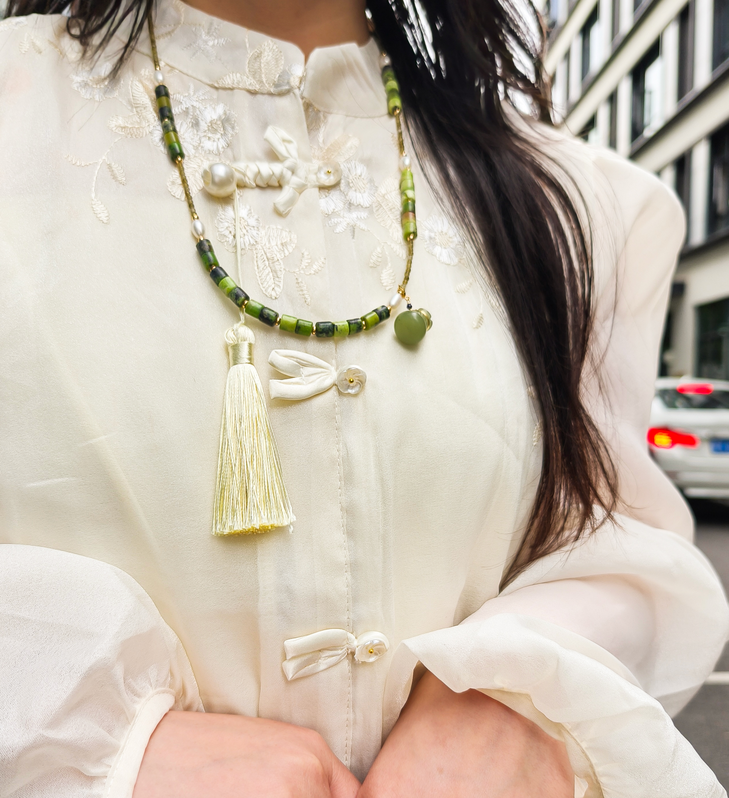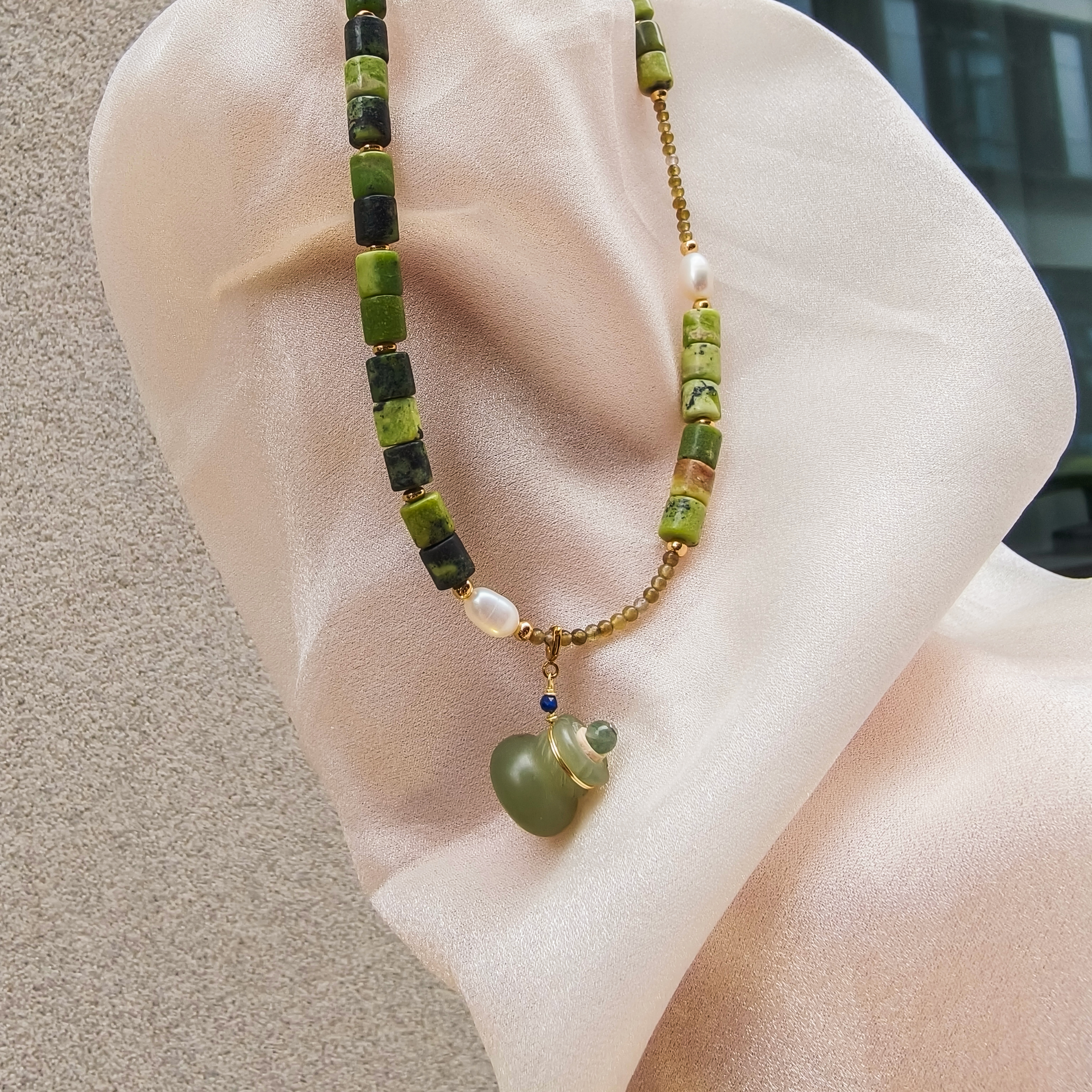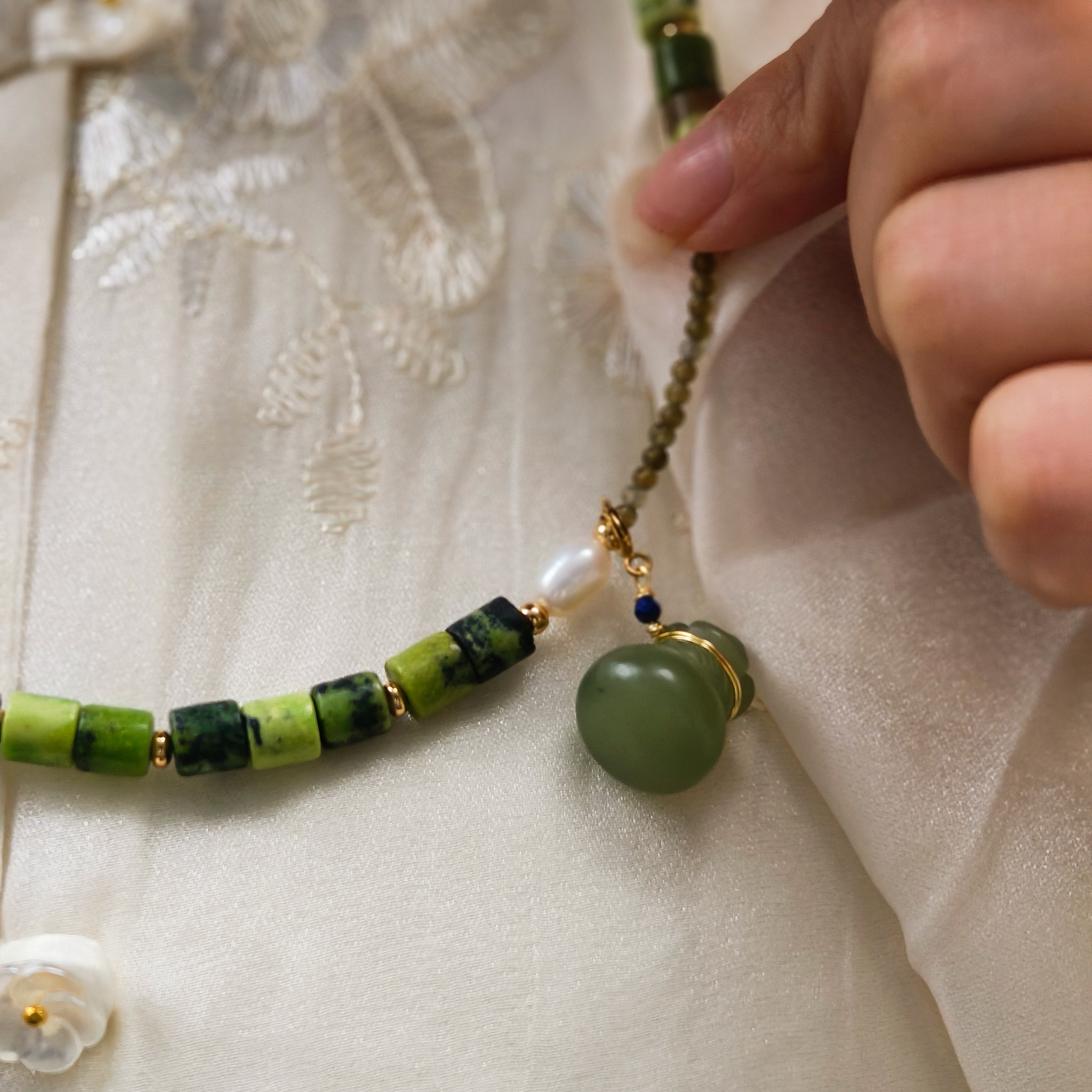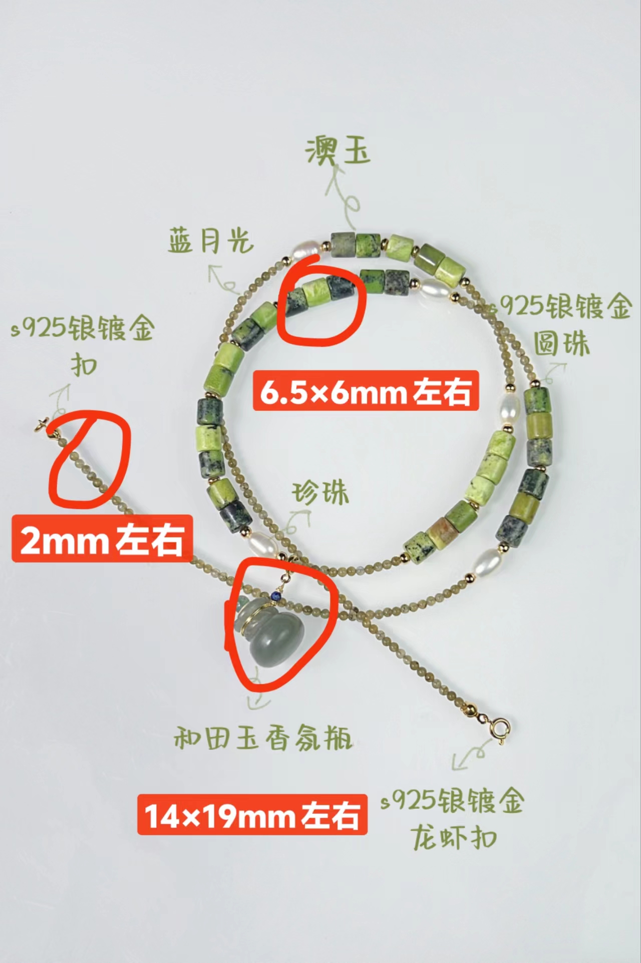 [草松雅韵精油香氛瓶项链]澳洲玉贵气和田玉香氛瓶珍珠长款项链老钱风【长度(cm):65+3(延长链)】
