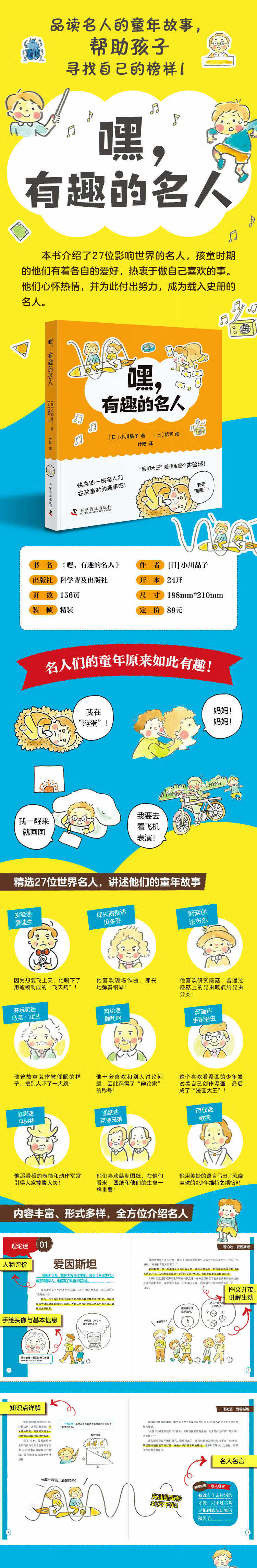 本书以简洁明快的语言和生动有趣的图画介绍了几十位影响世界的名人们,孩童时期的他们有着各自的爱好,如小时候喜欢研究各种植物昆虫的法布尔是个“蘑菇迷”,追求真理的伽利略是个“辩论迷”,“喜剧大师”卓别林孩童时就是“喜剧迷”。尽管喜好不同,但他们都无比热衷于做自己喜欢的事,他们心怀热情,并为此付出努力,成为载入史册的名人。