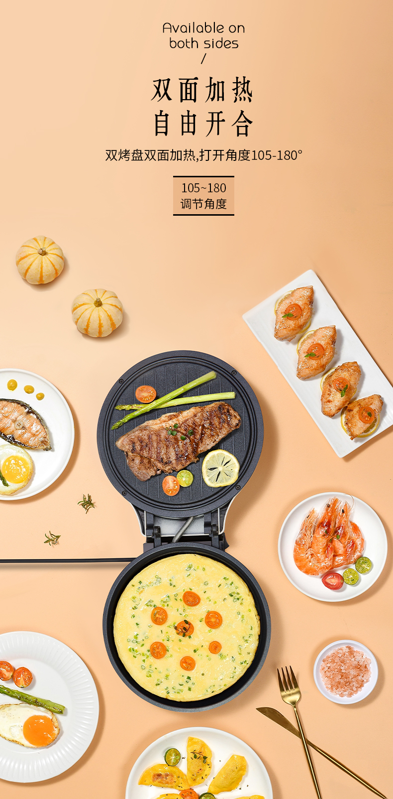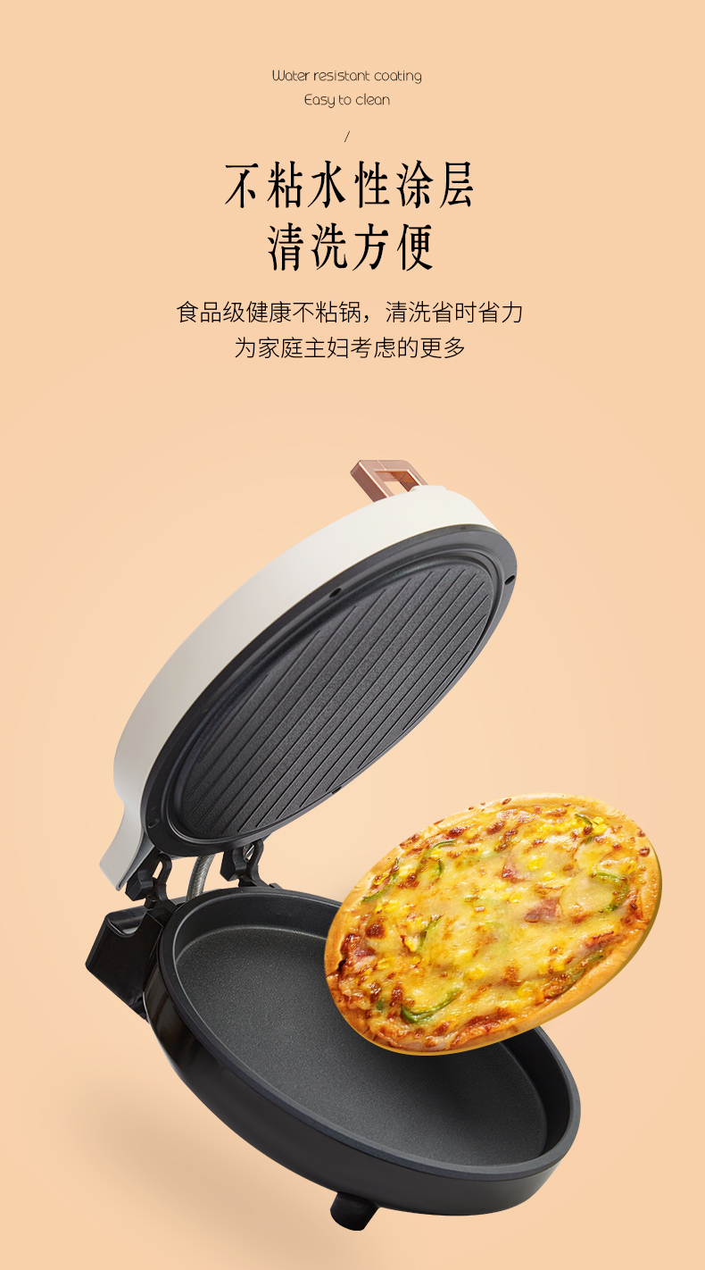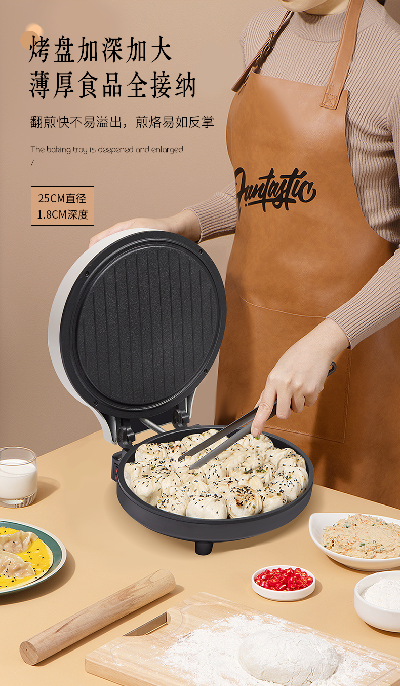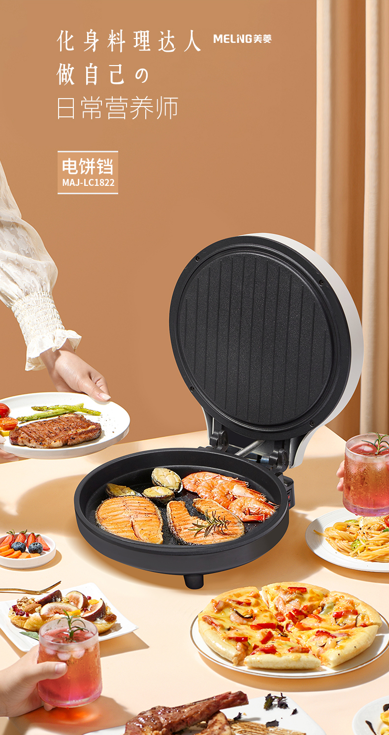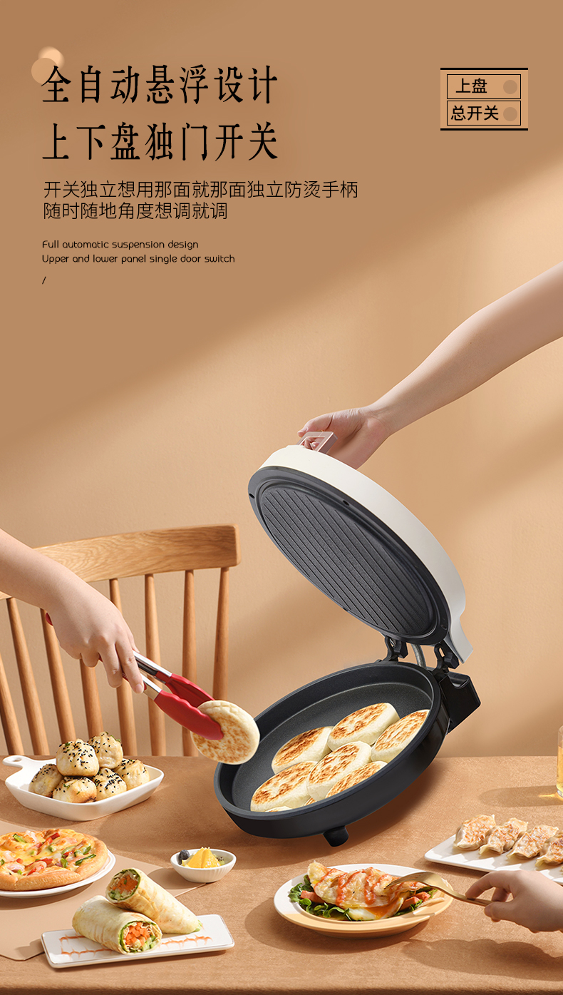 1、全自动悬浮设计,上下盘独门开关2、不粘水性涂层,下盘加深款68mm,容量更大3、1800W大功率,25CM双烤盘双面加热4、打开角度105-180°