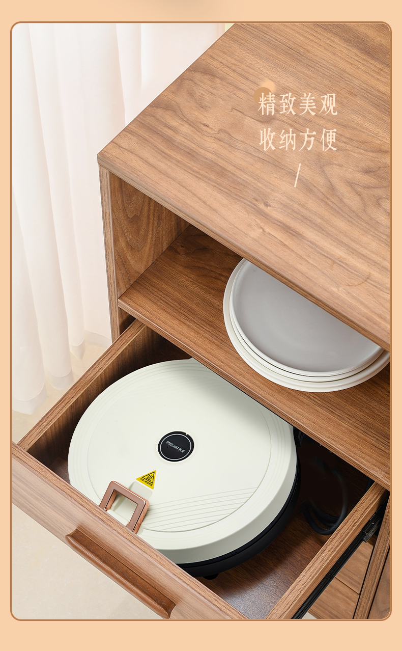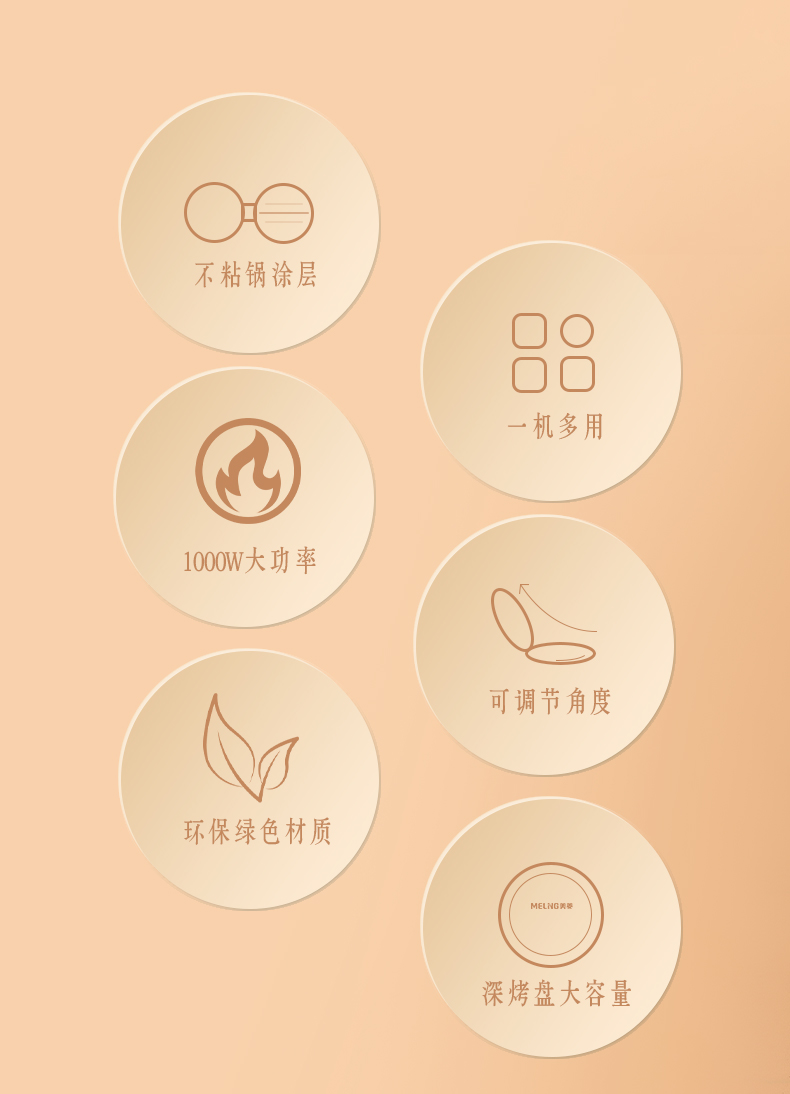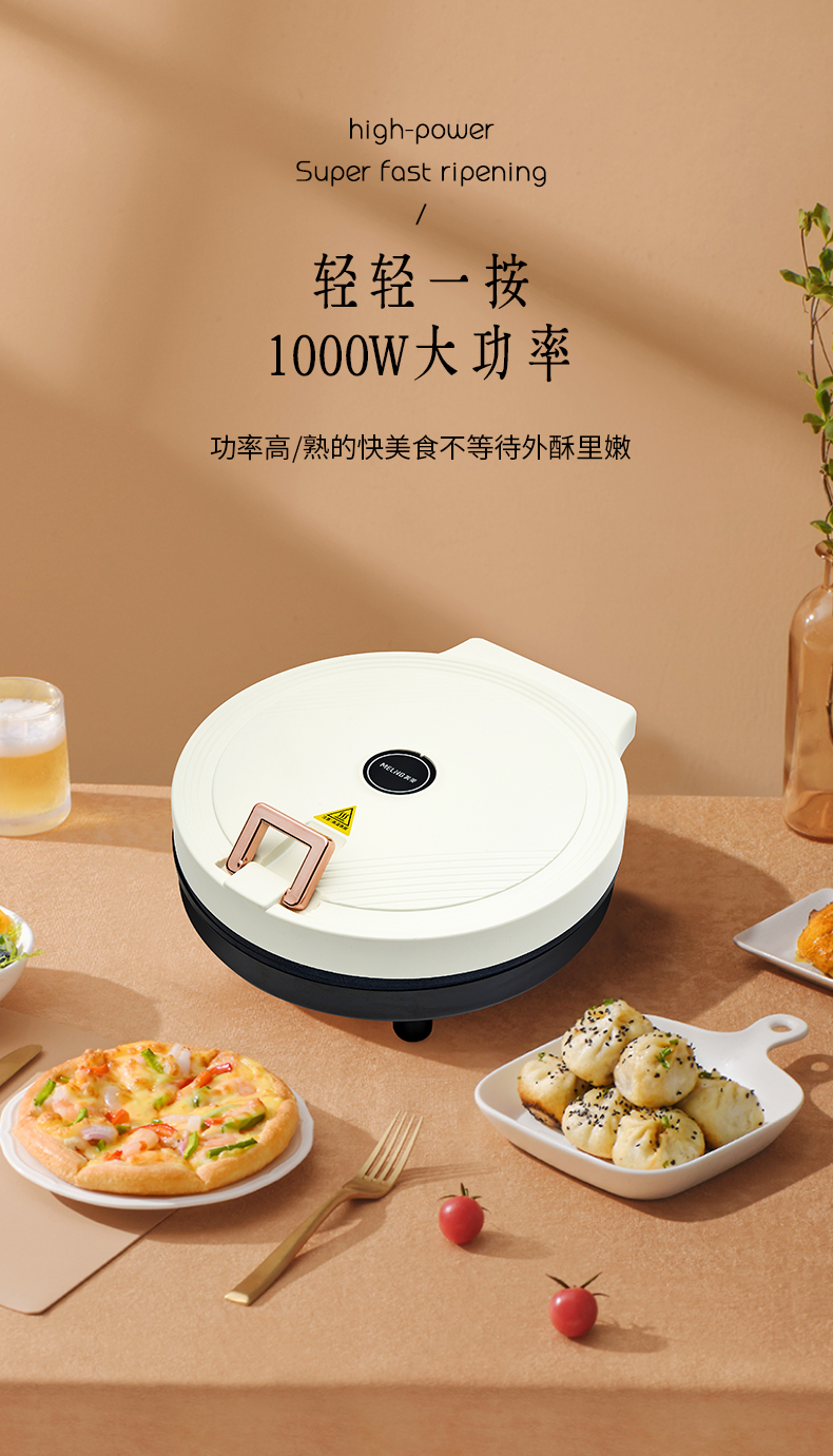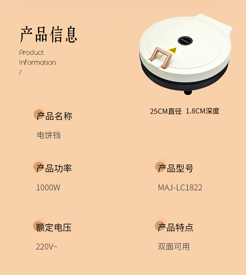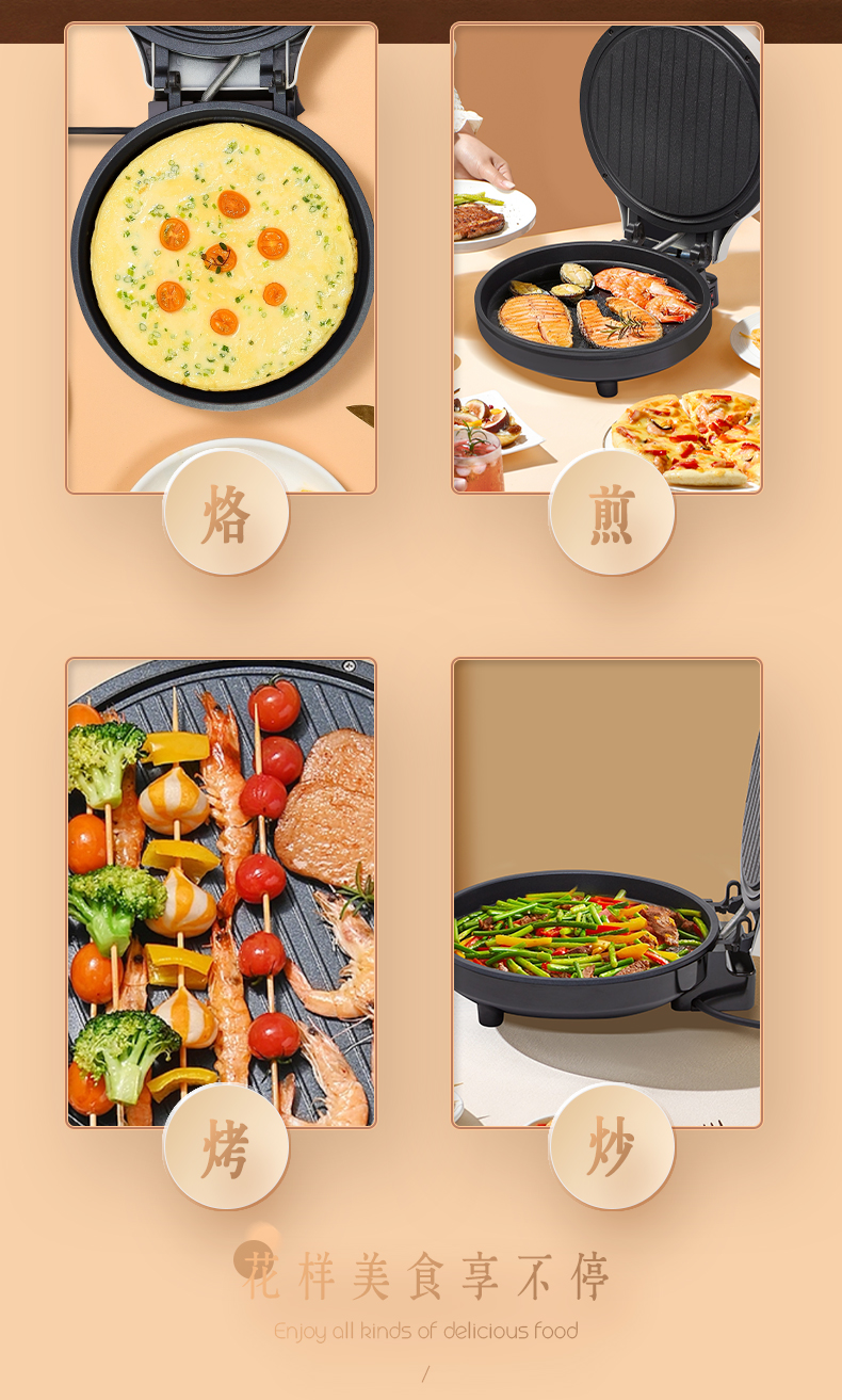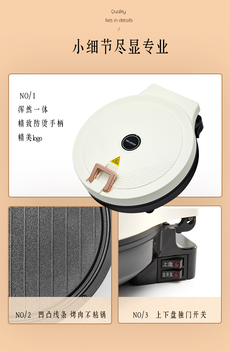 1、全自动悬浮设计,上下盘独门开关2、不粘水性涂层,下盘加深款68mm,容量更大3、1800W大功率,25CM双烤盘双面加热4、打开角度105-180°