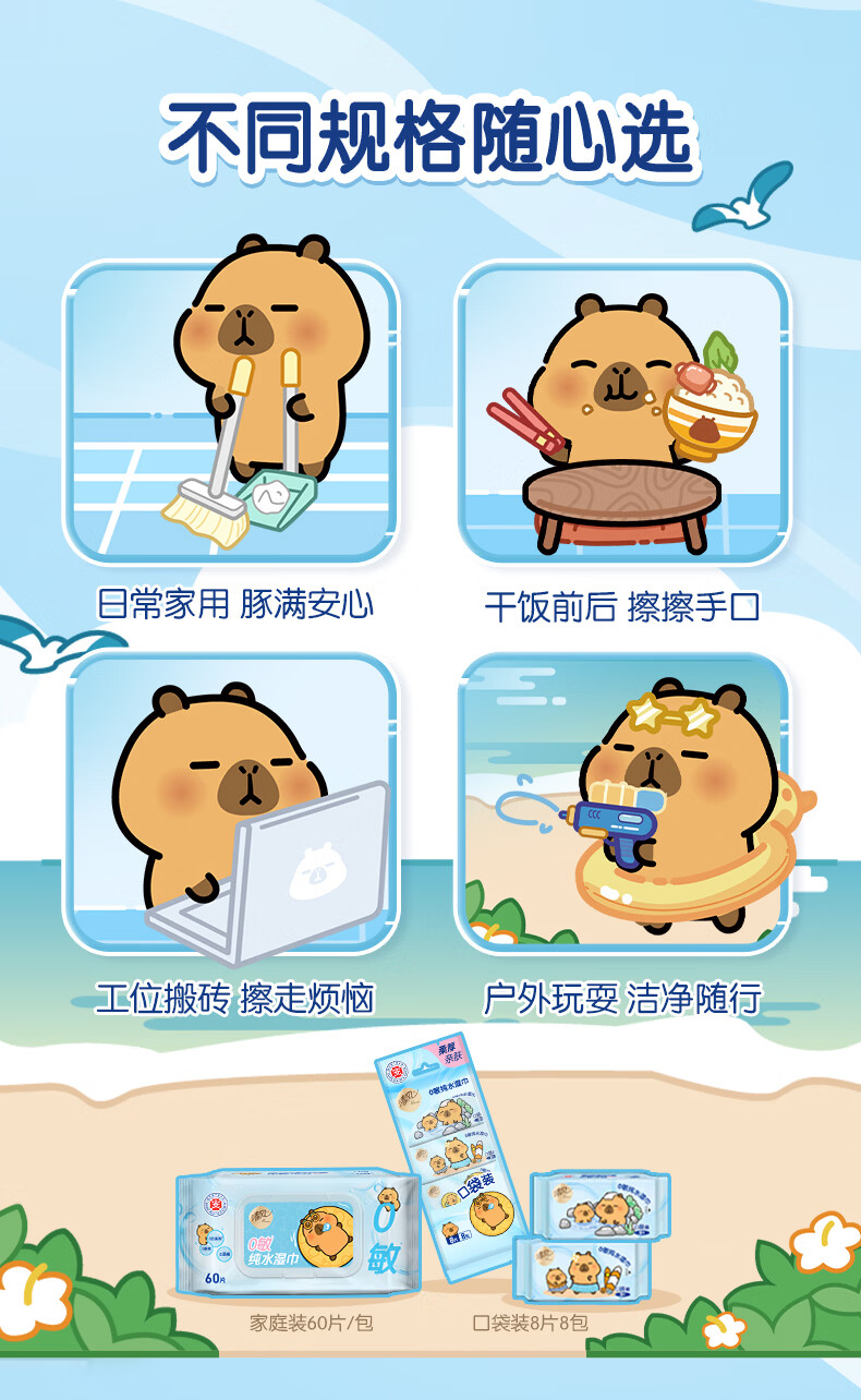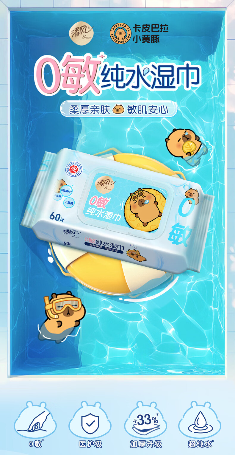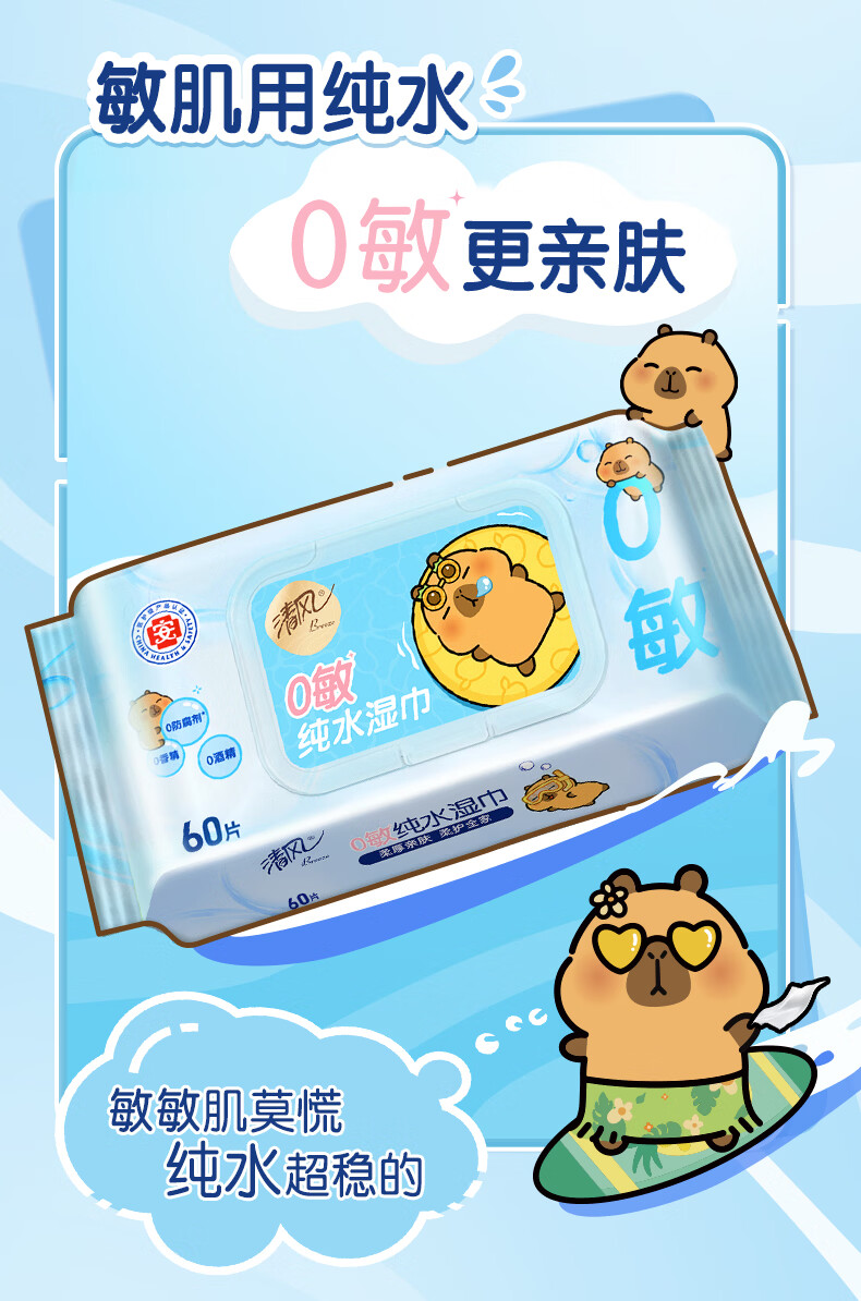 【清风X卡皮巴拉联名】清风0敏EDI纯水湿巾 60片5包