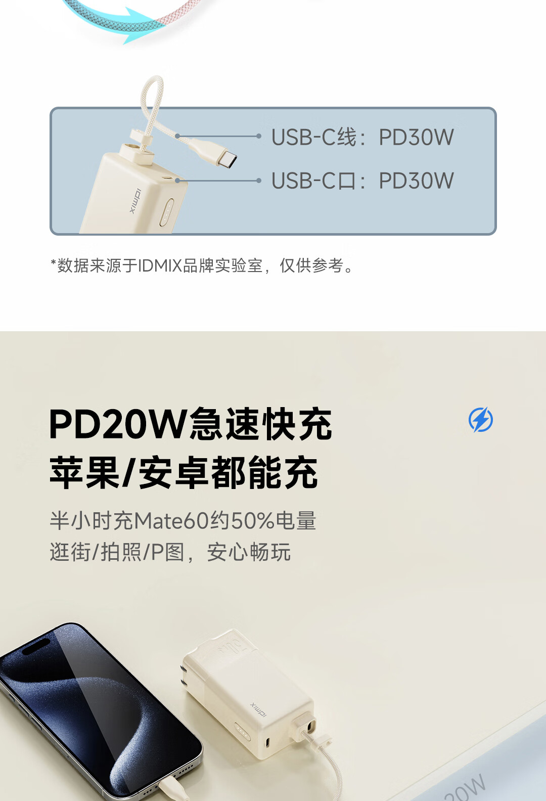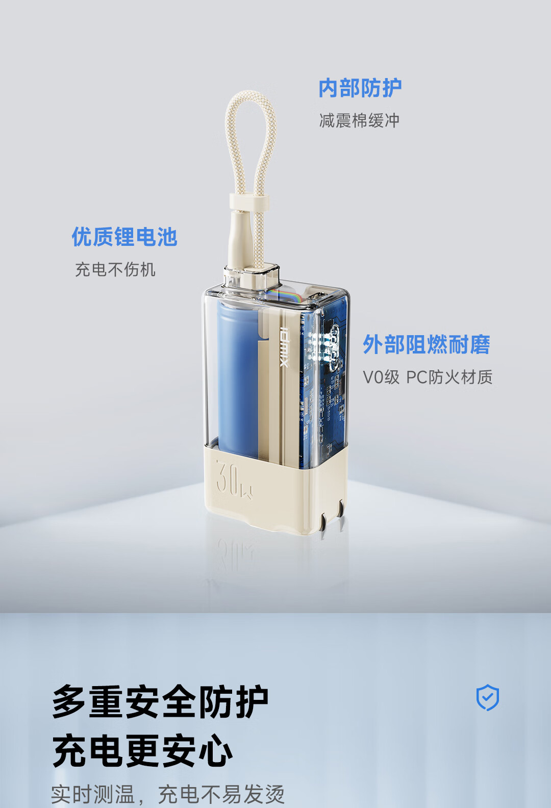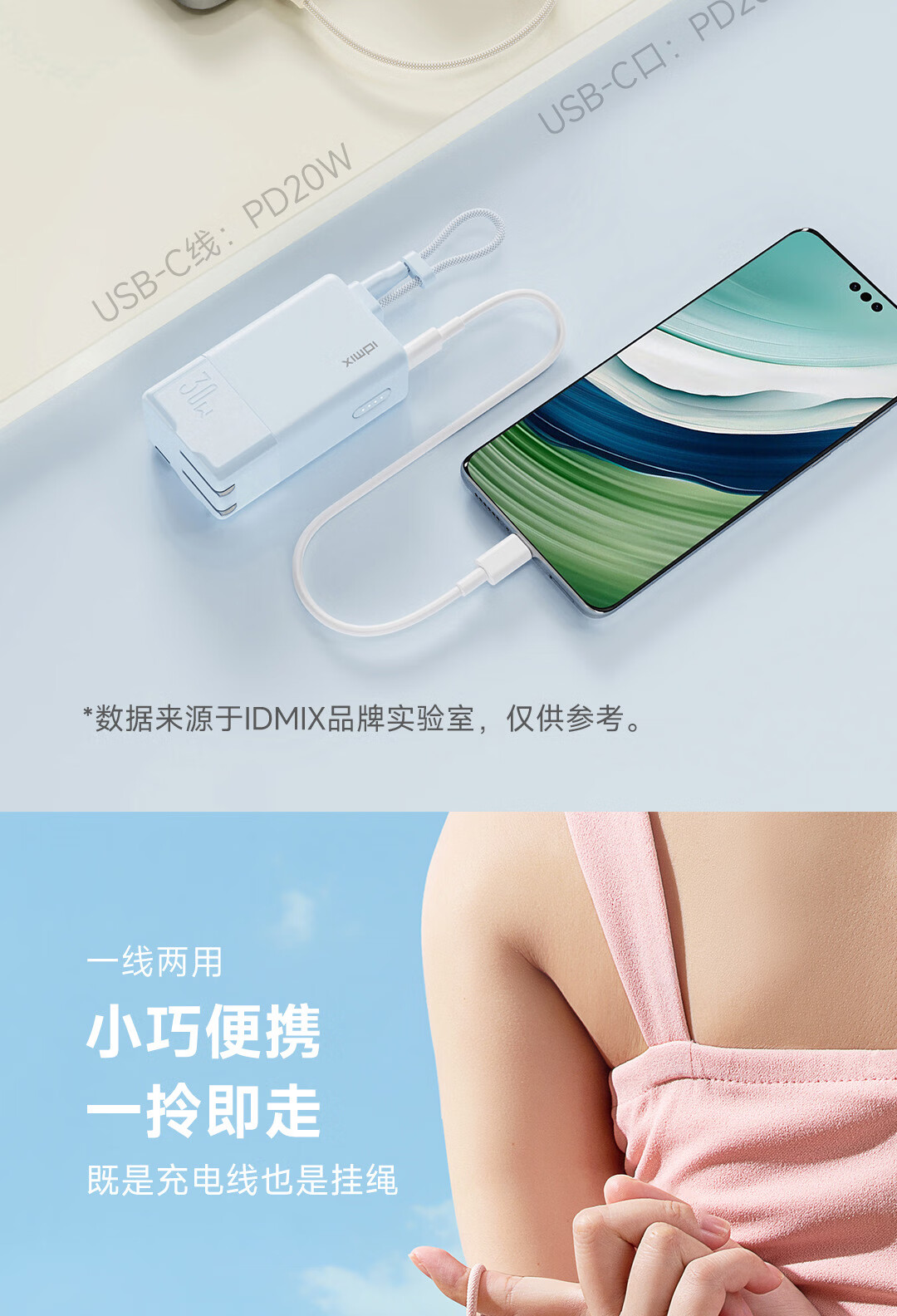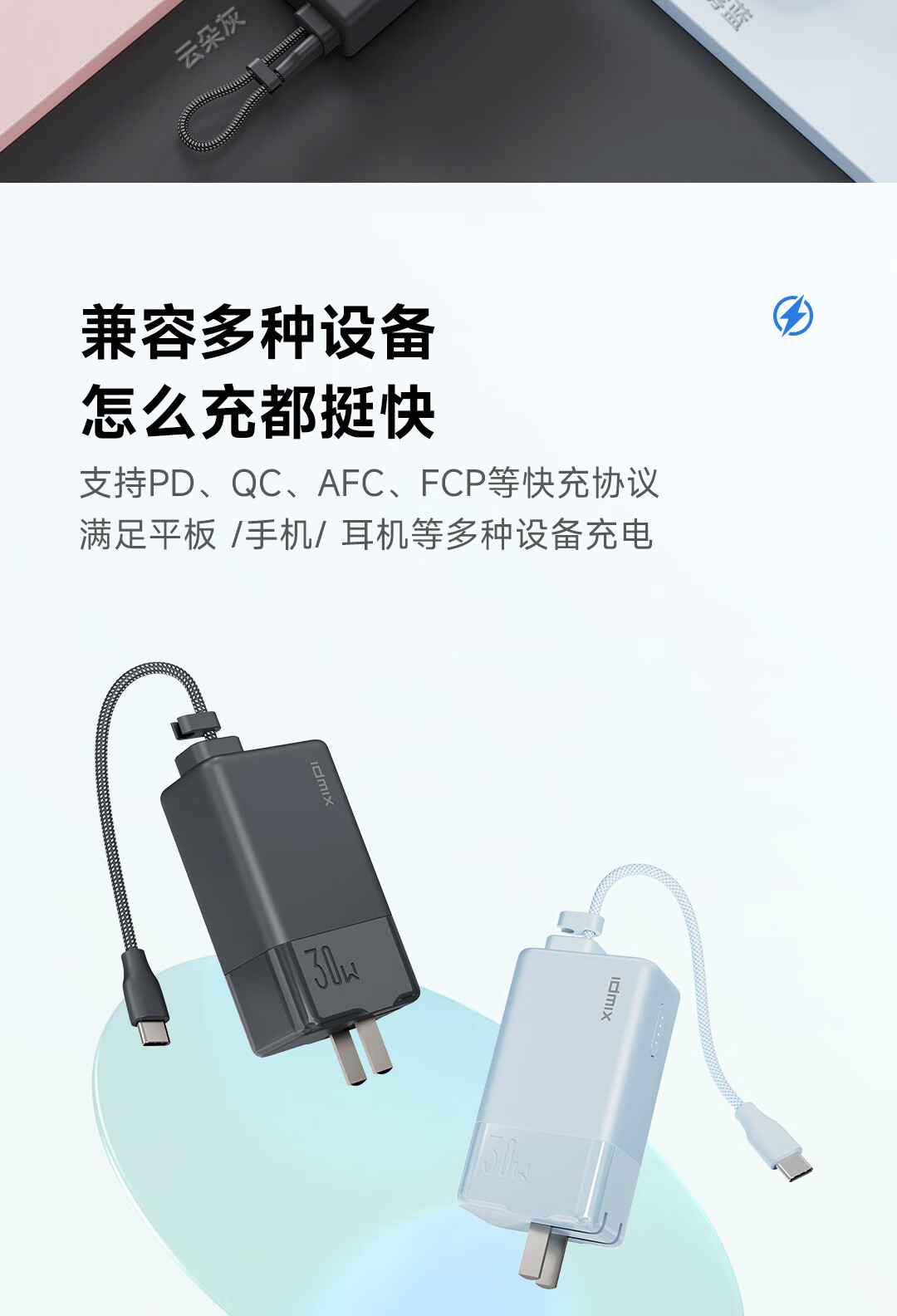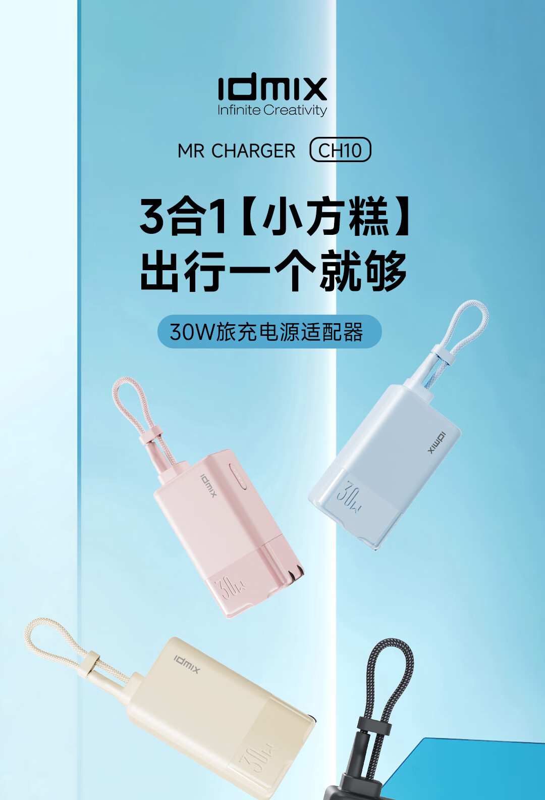 IDMIX 充电宝充电器自带线type-c充电头三合一30W快充 CH10 蓝色