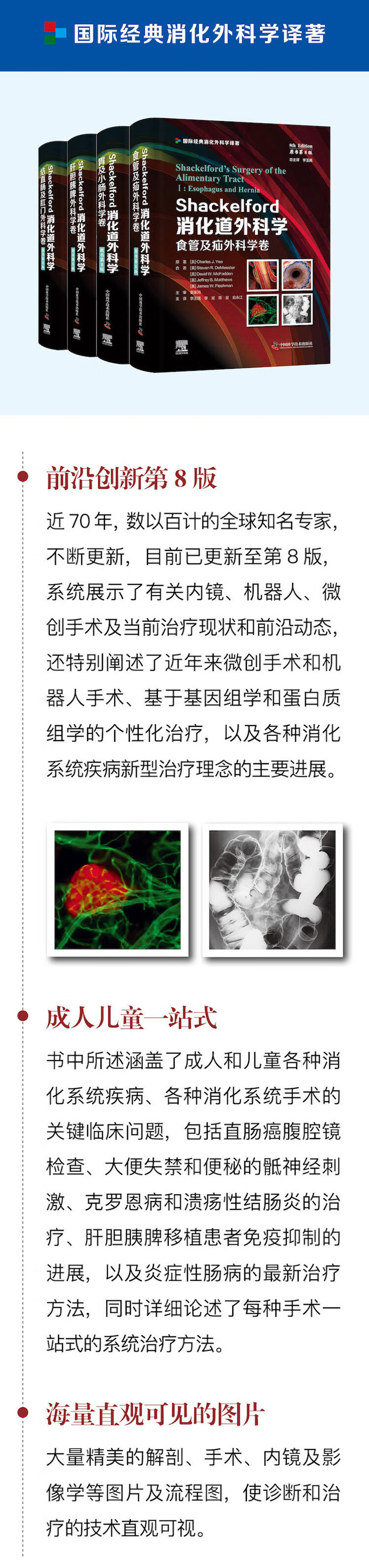 原书第 8 版分为上下两卷,内容涵盖整个消化道系统,上卷介绍食管、疝、胃和小肠疾病;下卷介绍肝、胆、胰、脾及结直肠和肛门疾病。每卷内容包括正常解剖、病理生理、常见疾病的诊疗等。全新第 8 版在保留既往版本内容的基础上,还重点介绍了基因组学、蛋白质组学、腹腔镜技术及机器人技术等消化道外科领域的前沿进展;阐述了消化道外科的先进理念、手术技巧、微创治疗等新方法。全书内容丰富,图文并茂,不仅延续了该书籍的稳定性,同时也具有创新性。