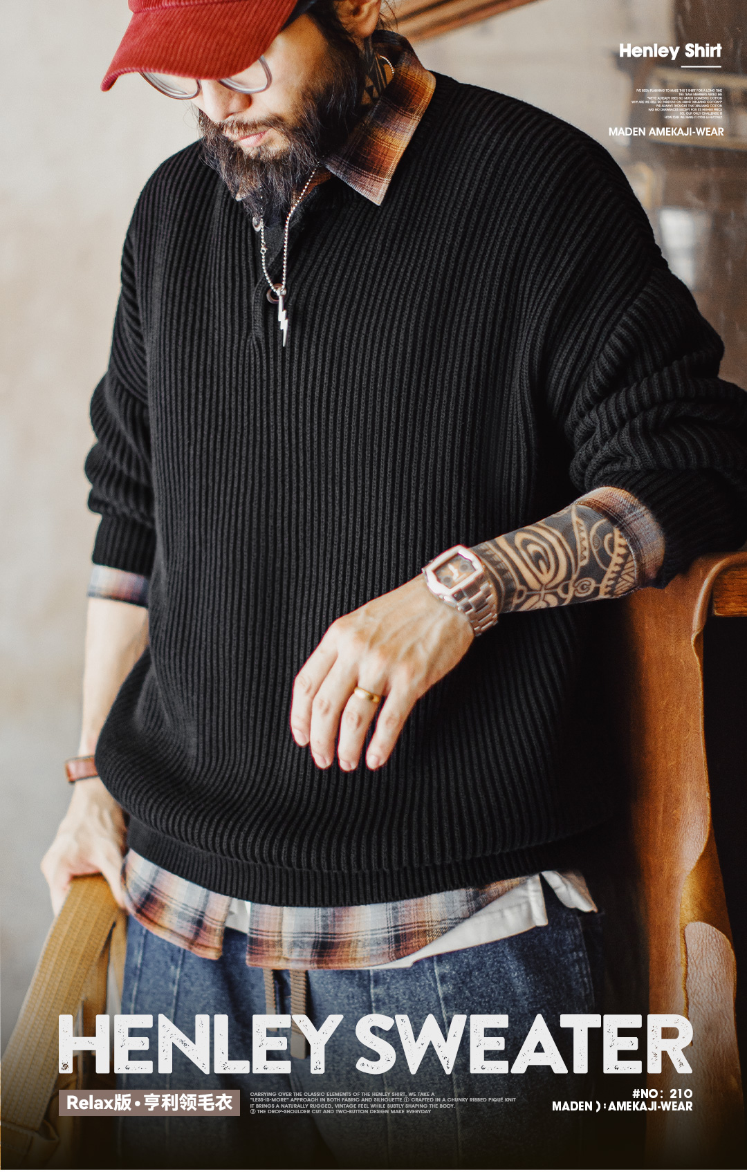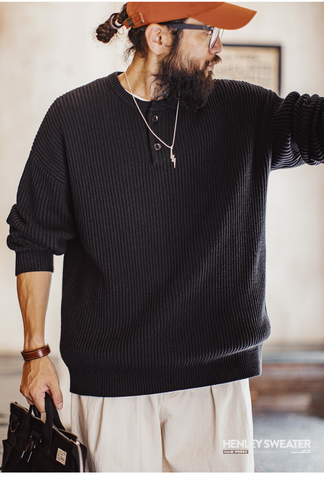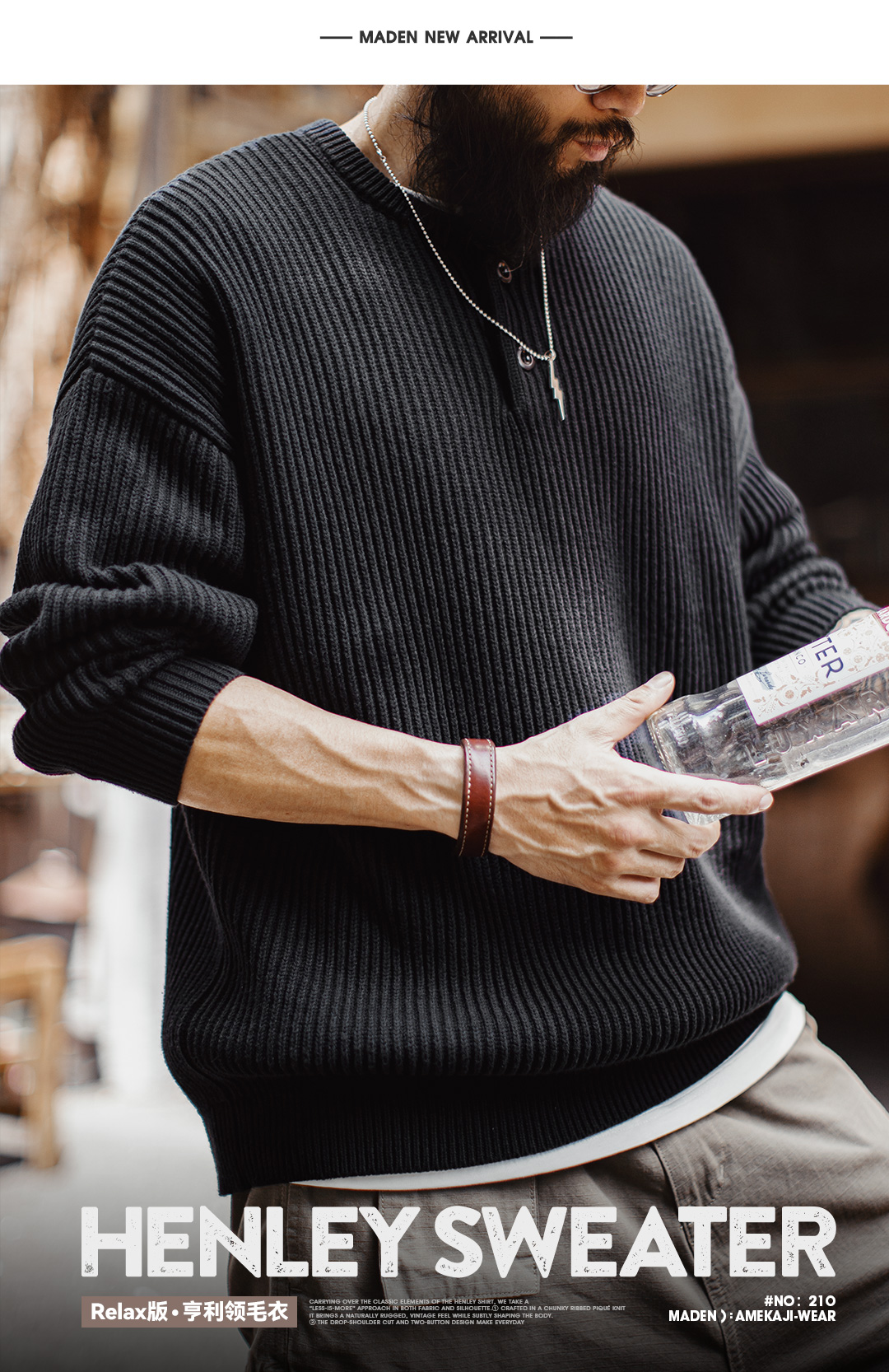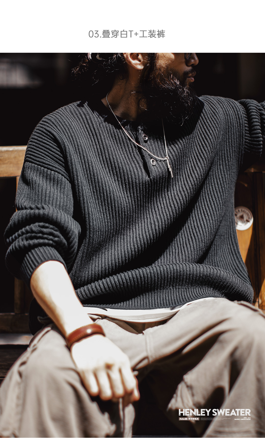 马登工装美式重磅亨利领毛衣黑色外穿高克重垂感加厚套头宽松男冬