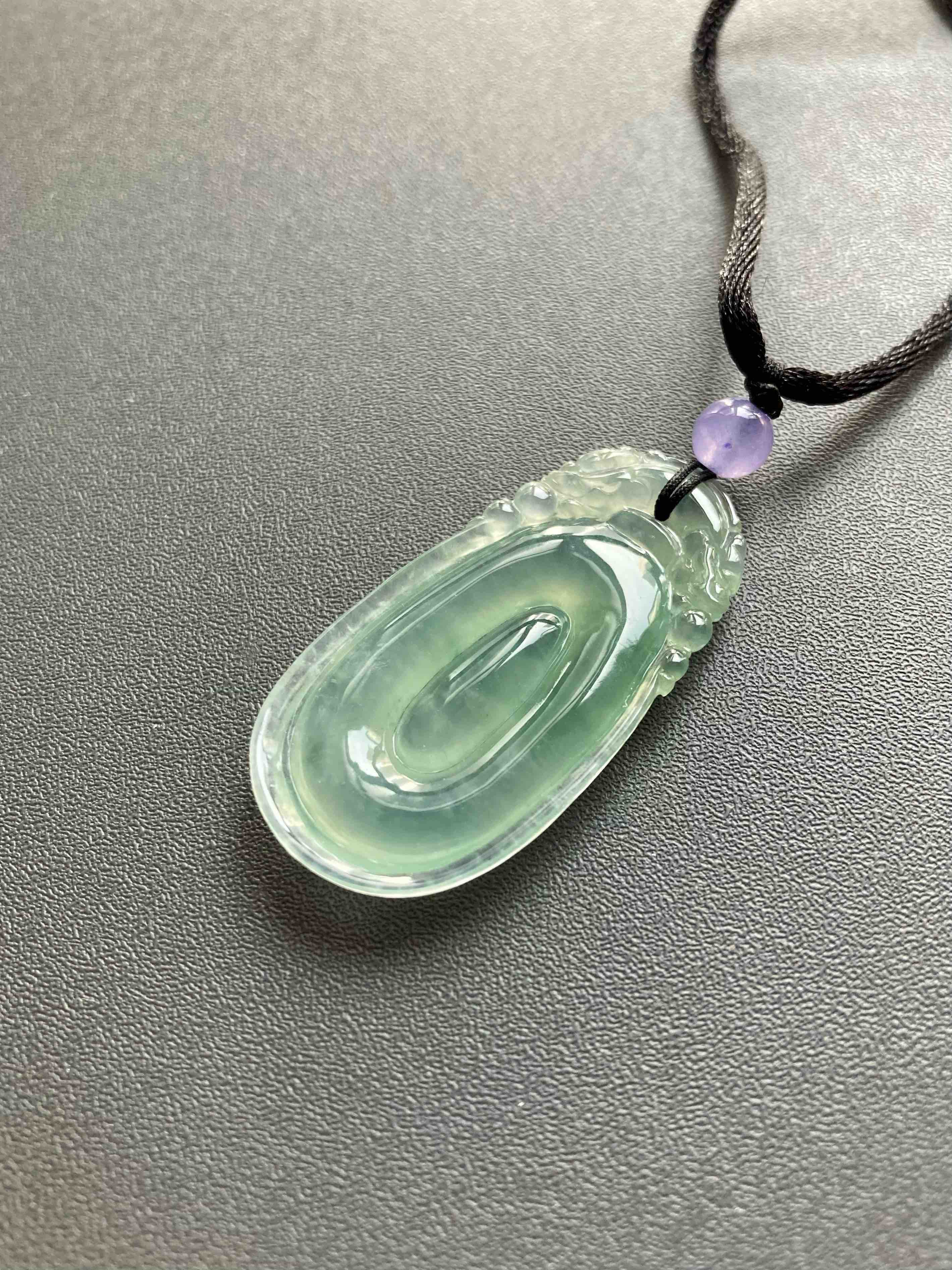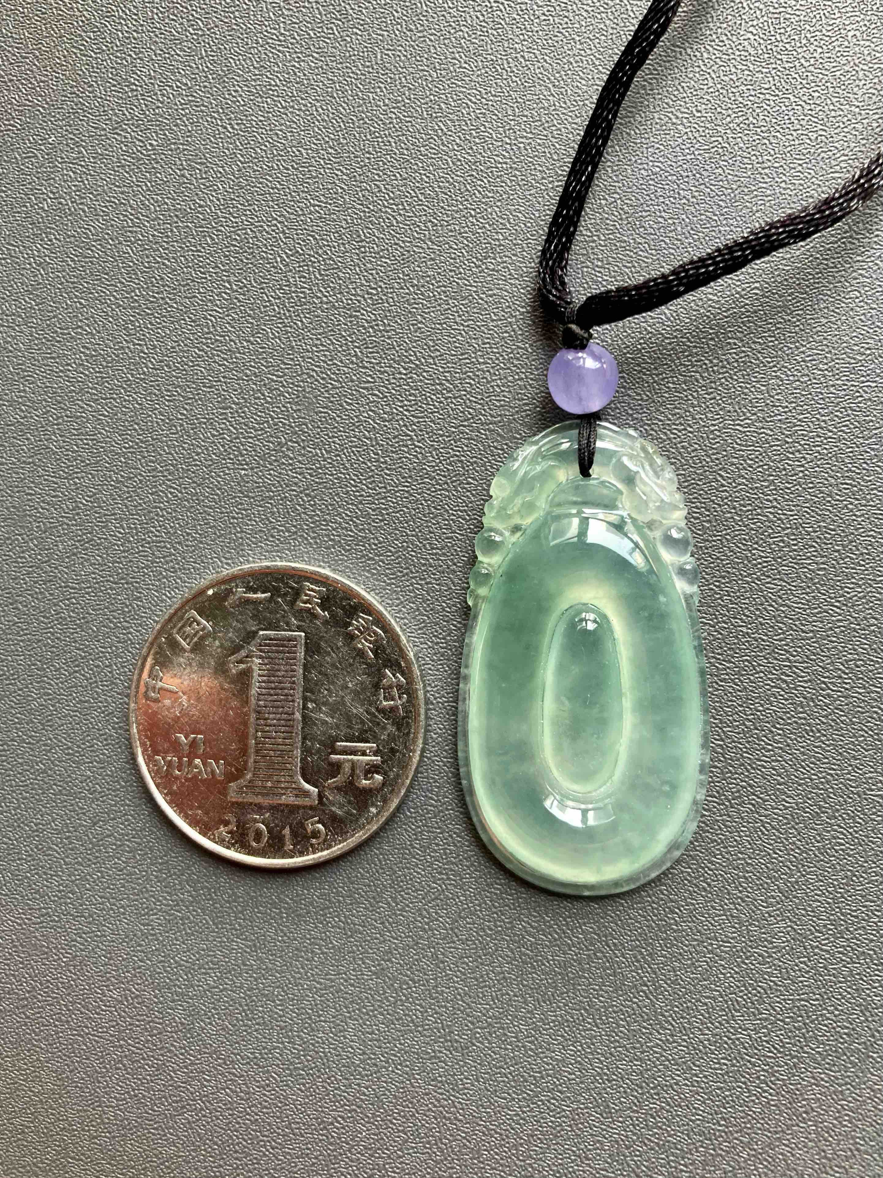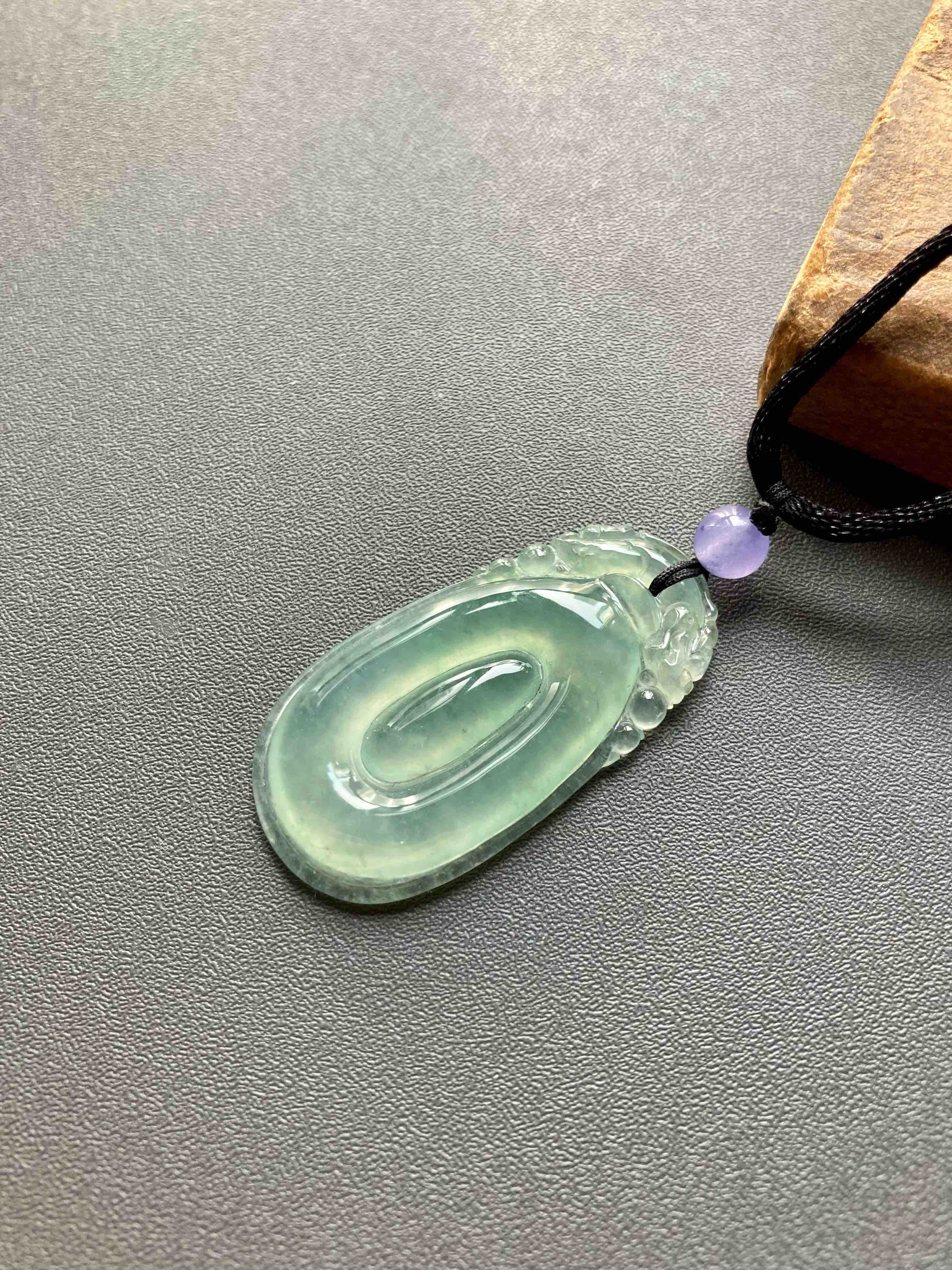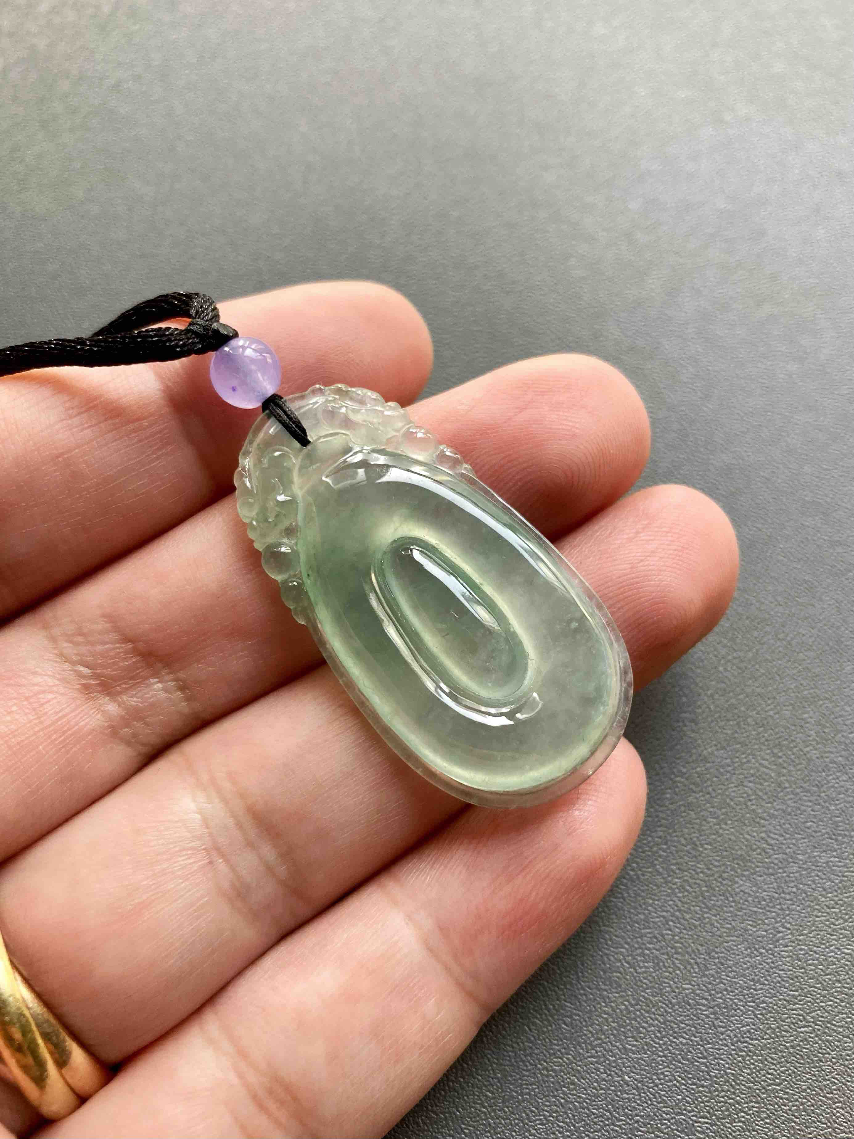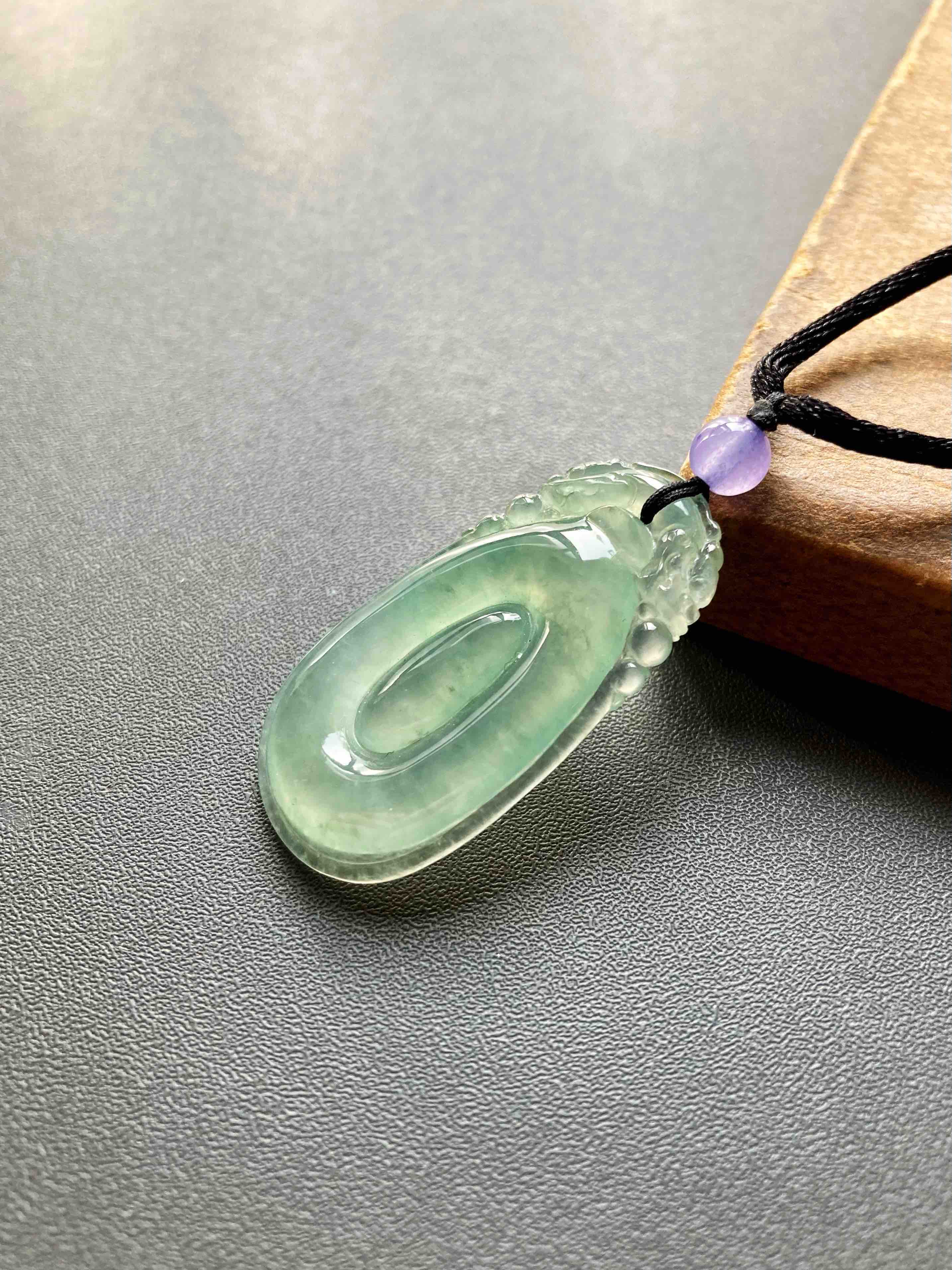 规格这么好的高冰种晴水翡翠福在眼前现在不好找了,尺寸大气,种水晶莹剔透,荧光四射,淡绿色晴水底优雅贵气,上雕双龙,助推事业,寓意双龙护主,事业亨通,福寿双全,只要四位数,强烈推荐。37.8*19.9*4.7mm