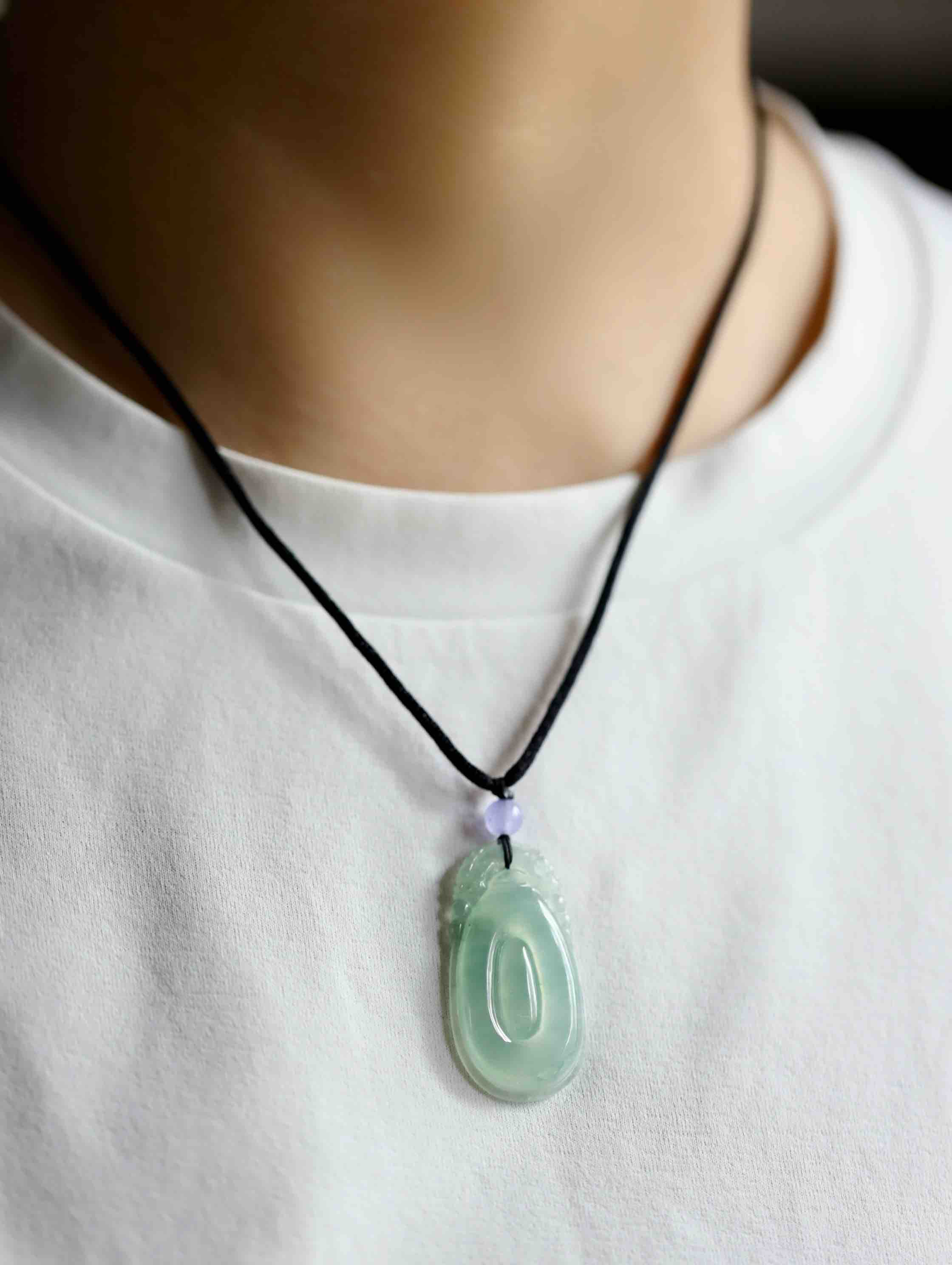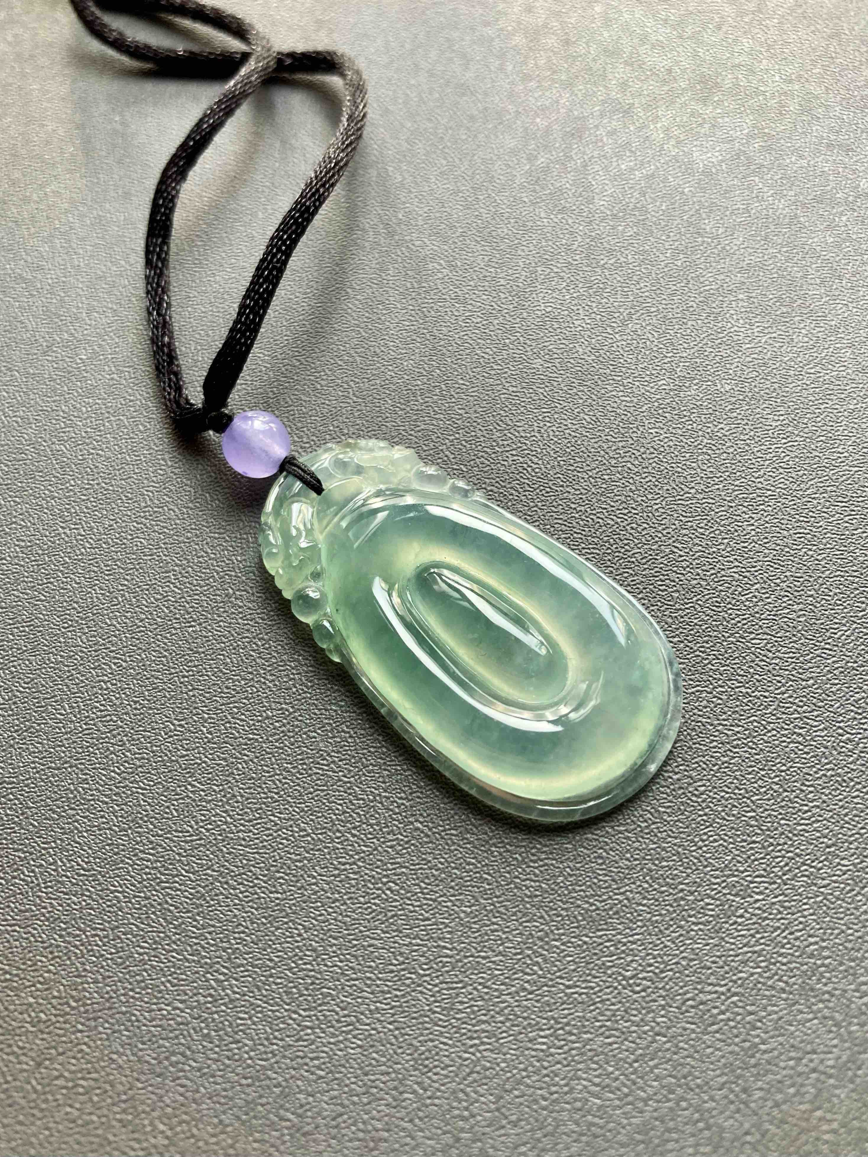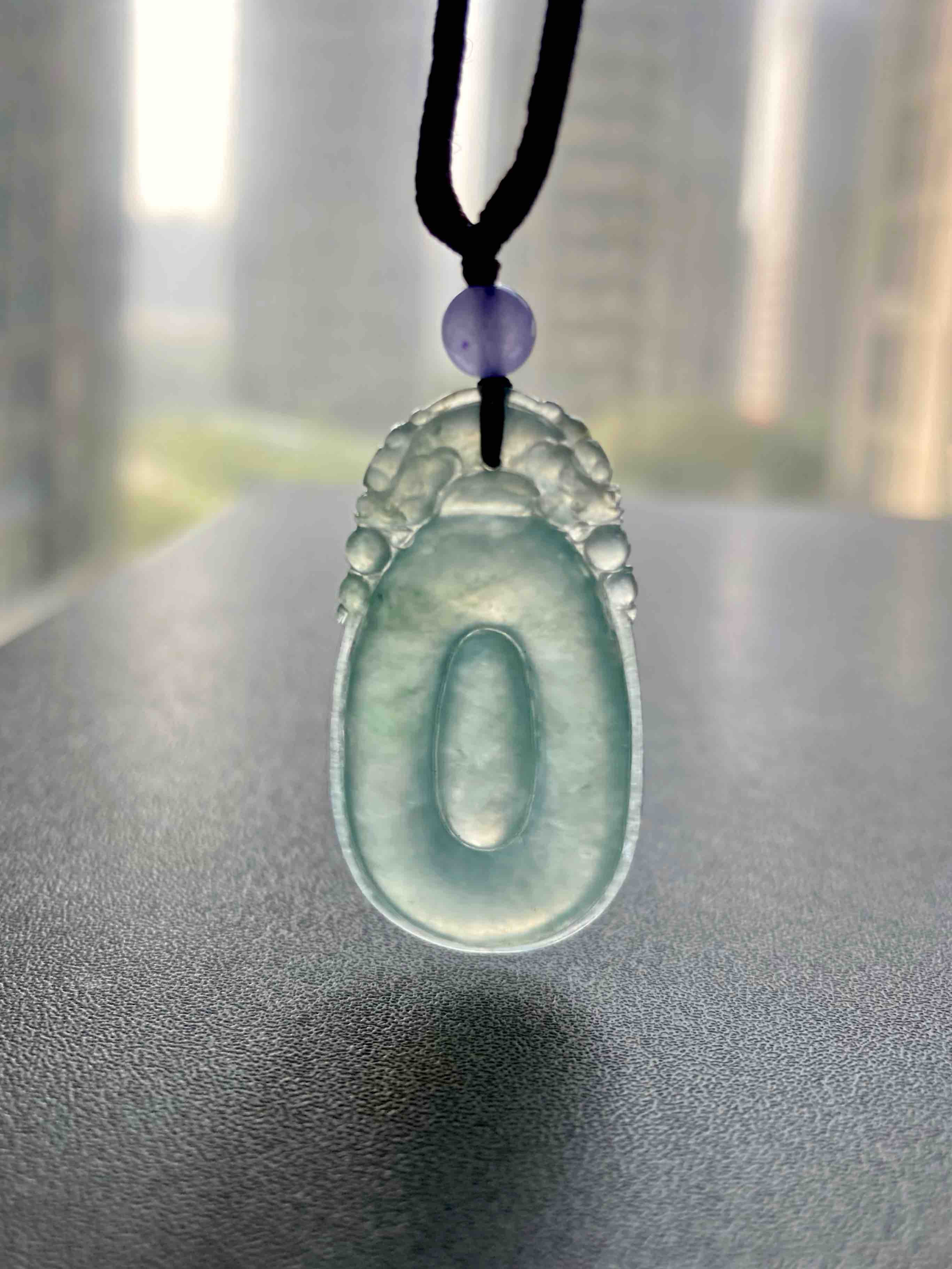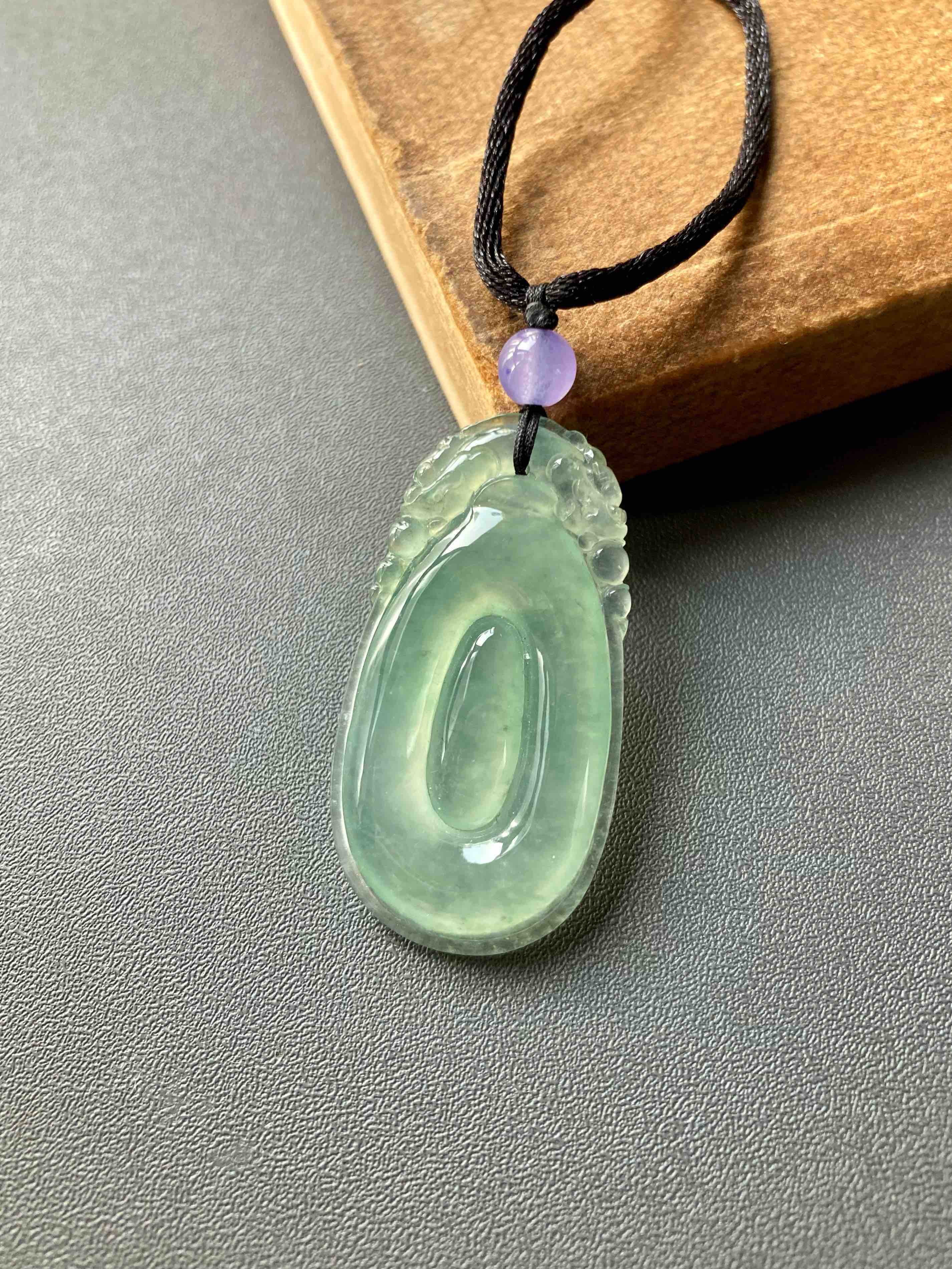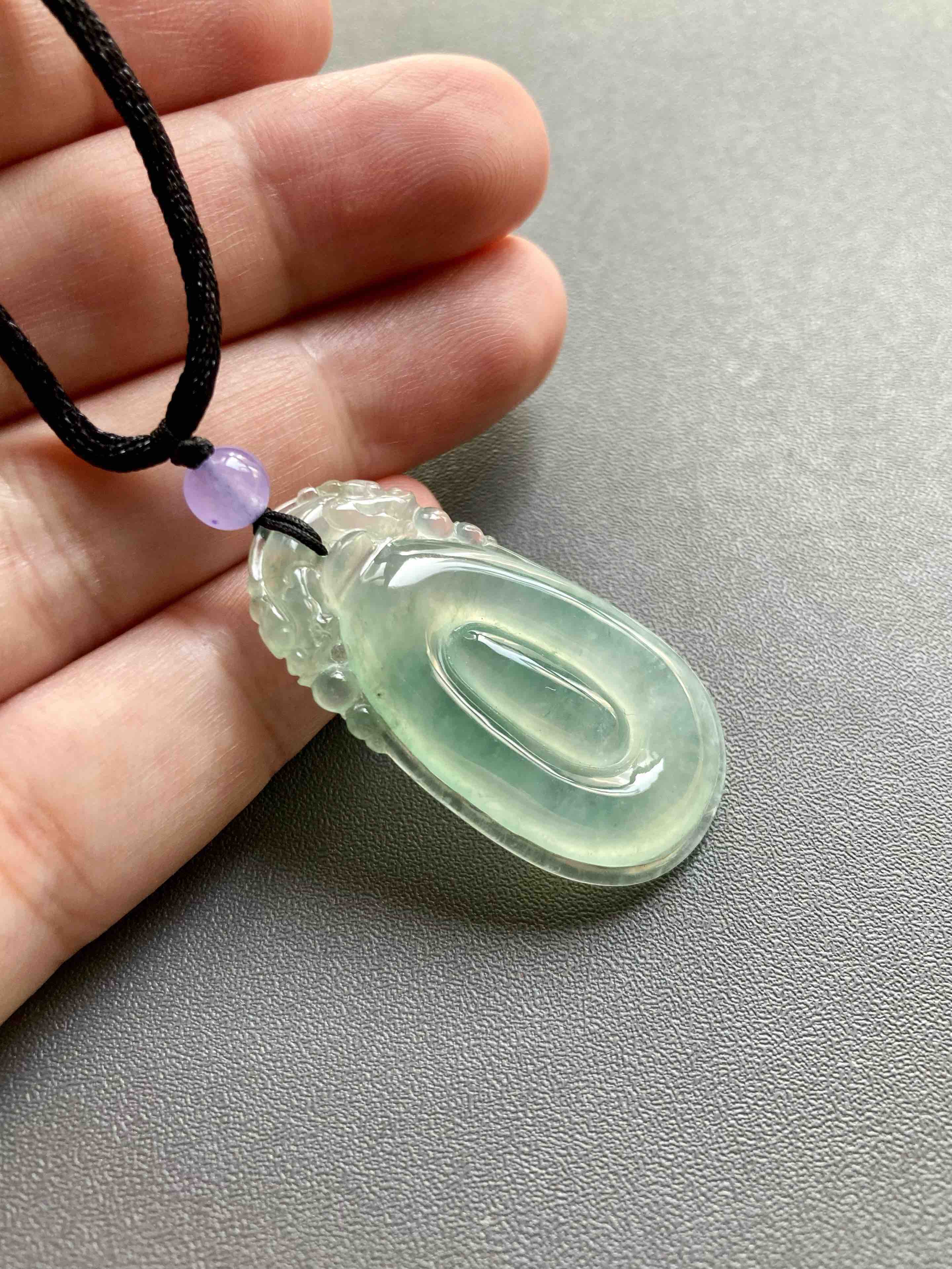 规格这么好的高冰种晴水翡翠福在眼前现在不好找了,尺寸大气,种水晶莹剔透,荧光四射,淡绿色晴水底优雅贵气,上雕双龙,助推事业,寓意双龙护主,事业亨通,福寿双全,只要四位数,强烈推荐。37.8*19.9*4.7mm