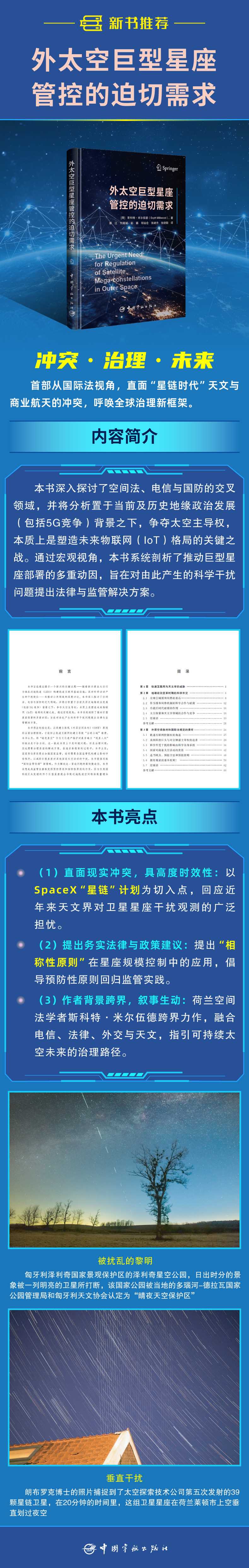 本书得出的结论是:必须建立体现《外层空间条约》(OST)原则的全面治理框架,才能防止轨道互联网的建立导致;全球公域崩溃。本书认为,将;暗夜星空作为文化遗产保护对象并确立;观星人权的做法是不恰当的。这一挑战本质上不是环境问题,而是治理问题,因此需要治理层面的解决方案。在追求新框架的过程中,本书主张:国家责任原则要求加强国家监管,迫切需要各国监管机构建立影响评估程序,以减轻巨型星座对其他国家太空活动的干扰。本书提倡采取;国际监管协调新策略,作为解决这一紧迫问题的最快捷途径。本书设想此类监管应重新发挥预防原则和相称性原则的作用,因为仅美国科技巨头发射的四个巨型星座就会导致近地轨道空间物体数量增加100倍,这无疑将使技术和地缘政治风险呈指数级增长,显然是不可持续的。本书就如何加强监管程序以确保各利益相关方共同但有时相互冲突的利益得到协调,提出了务实建议。