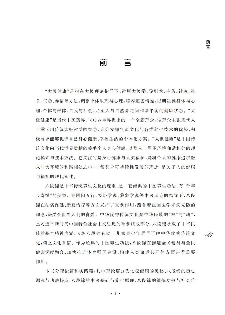 本书为;太极健康丛书之一。本书详细论述了太极健康的奥秘、八段锦的源流、八段锦的锻炼功效、八段锦的健身原理和太极拳锻炼对人体身心健康的影响等方面的理论知识,主要介绍了坐式八段锦、少儿八段锦、传统功法八段锦,以及健身气功八段锦等技法。本书是在太极健康理念下编撰的科普读本,以图文并茂的形式介绍八段锦基本理论知识和基本套路技法,动作的示范者均为上海中医药大学武术教师。本书适合在校学生使用,兼顾社区八段锦爱好者。