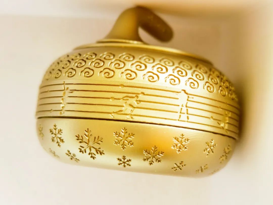 这是一枚按照真实冰壶尺寸,等比例缩小,铸造而成的"镀金"冰壶纪念币,色泽饱满,流线丝滑,整体精巧而别致,官方初始发行价为¥368!