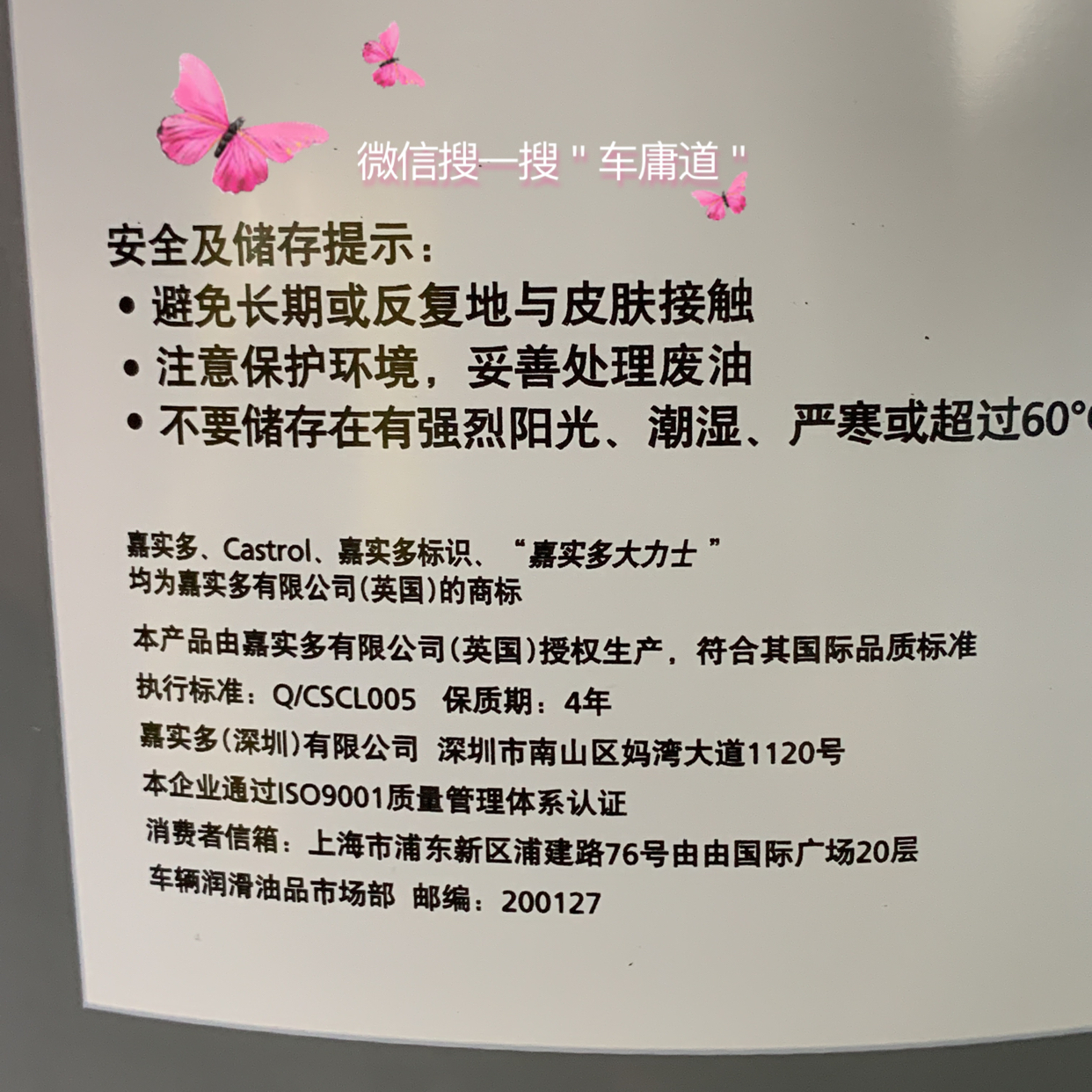 桶盖上贴有嘉实多镭射防伪标记