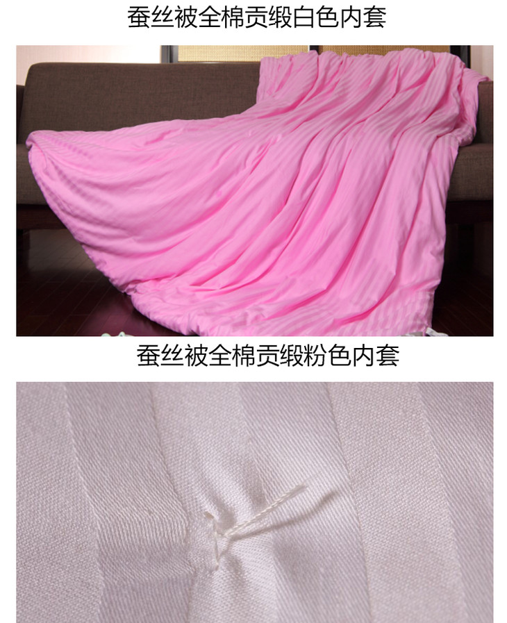 2、每床蚕丝被需要用纯棉内衬套固定和保持蚕丝卫生,可拆下来洗。内套我们只用纯棉的,故额外收取100元/床。可选择白色和粉色内套,下单请注明颜色。没注明的,我们随机搭配。