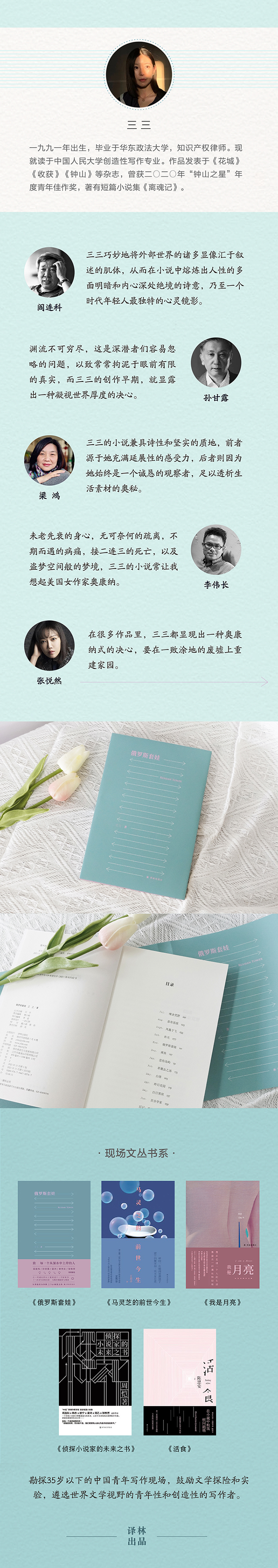 本书是三三的第二本作品,与处女座《离魂记》相隔八年。在这八年间,她经历了种种变化,从知识产权律师到专业作家,从职场回归校园,离开故乡上海到北京读书。近年来,三三成为备受瞩目的青年小说家,作品多发表于《收获》《花城》《钟山》等文学刊物,曾获2020年“钟山之星”年度青年佳作奖。