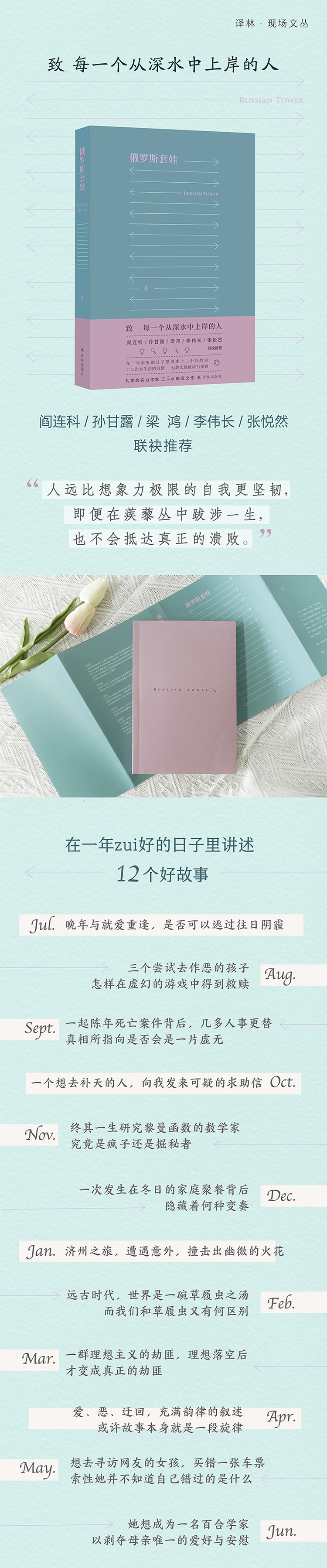 《俄罗斯套娃》是一本短篇小说集,却以一种巧妙的时间顺序将整本书连缀起来,构成了一年首尾相连的闭环。在内容上,晚年与旧爱重逢者、黎曼函数的研究者、一场家宴的参与者、收到补天者求救信息的人……十二个故事中的主人公们同样经历着循环往复的生活,仿佛推着石头上山的西西弗斯,寻找着、期待着生机。三三的故事直指生命的孤独本质,也给从深水中上岸的人们带来疗愈。