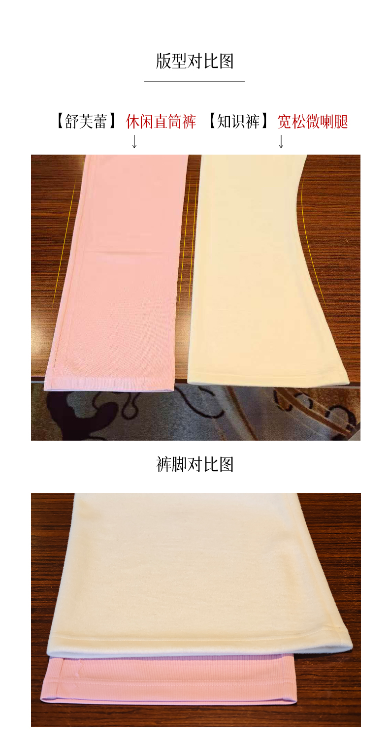其实对比图很明显了。【舒芙蕾】是宽松直筒裤,更休闲一点;【知识裤】是微喇版型,上窄下宽,所以呢相对会更气质一些。
