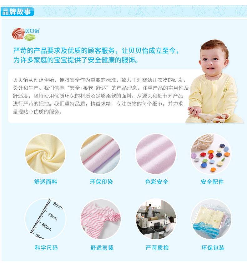 - 贝贝怡专注0-6岁婴幼儿服饰,坚持安全、柔软、舒适的产品理念,为千万中国家庭提供超高品质、安全可靠的婴幼儿服饰产品,妈妈放心,宝宝开心!